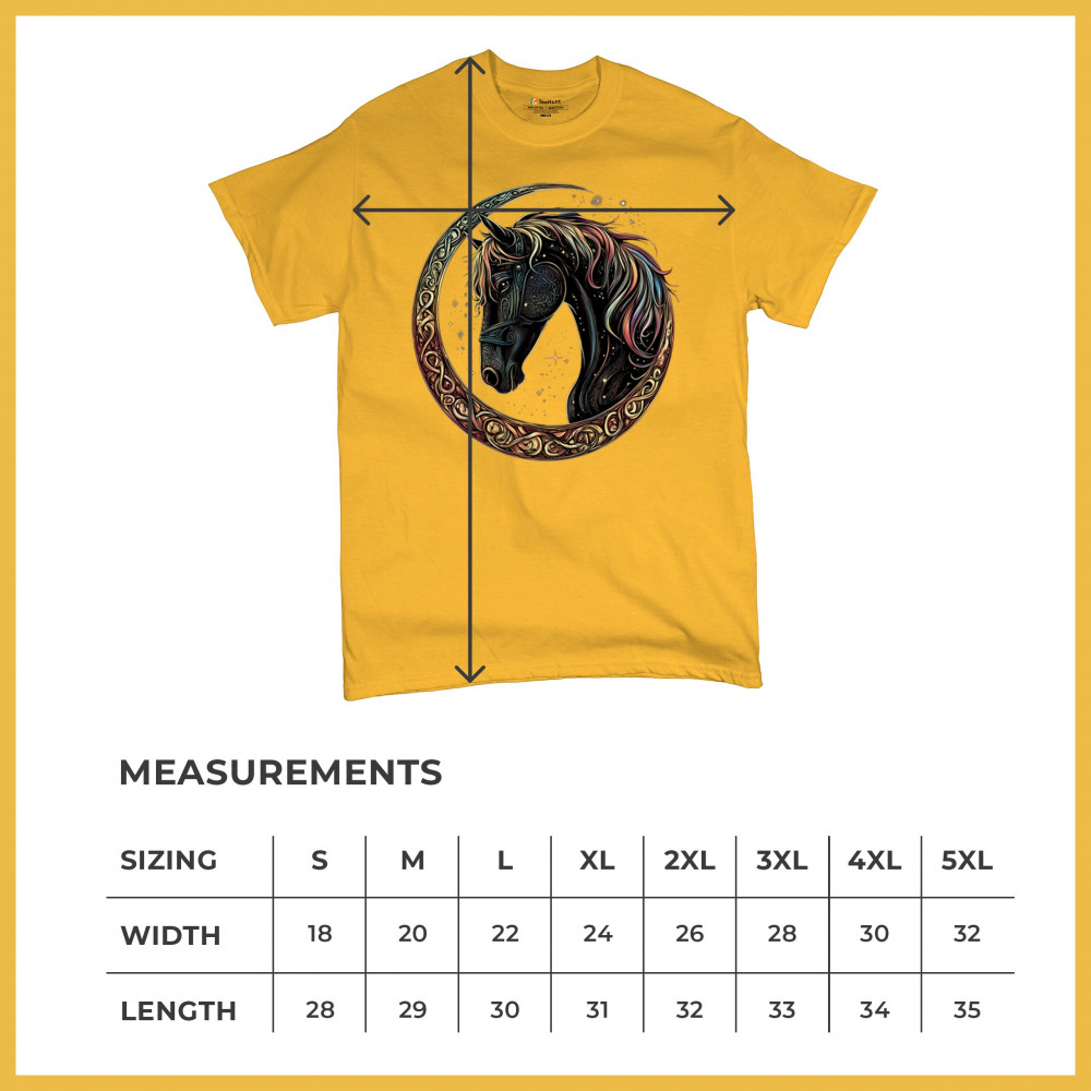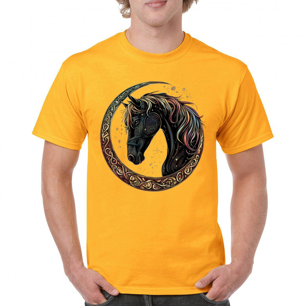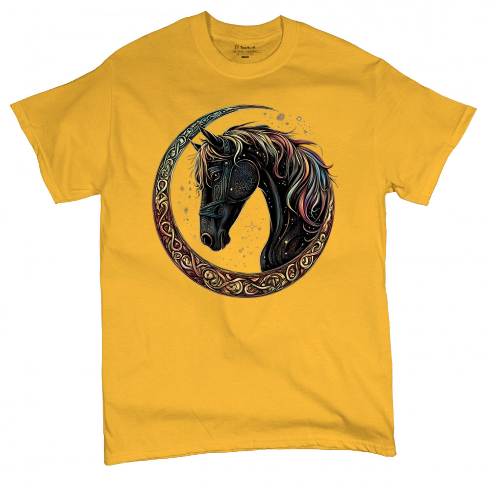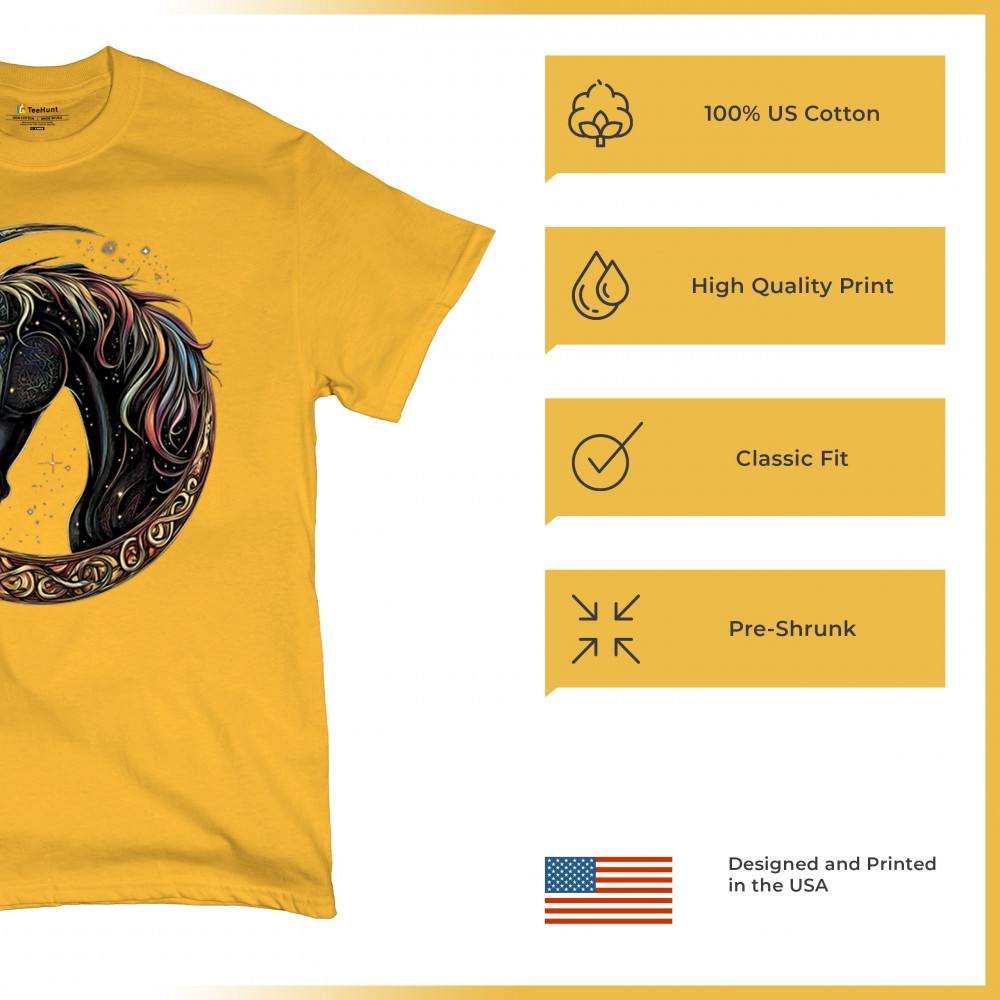Celebrate the power and grace of the cosmos with this majestic black horse framed by a golden Celtic crescent moon. Its rainbow mane and celestial body symbolize strength, movement, mystery, and spiritual magic. A stunning piece for fantasy fans, equestrians, and dreamers who love horses and stars.