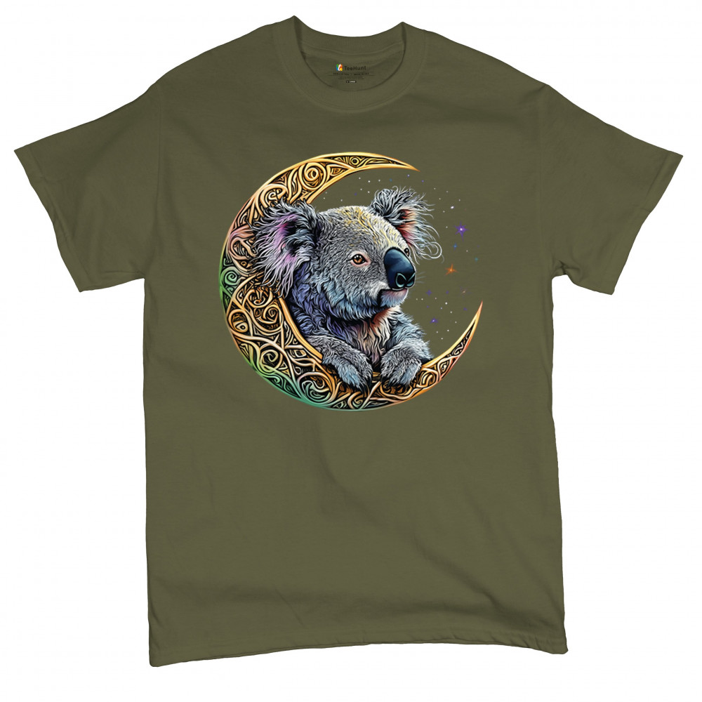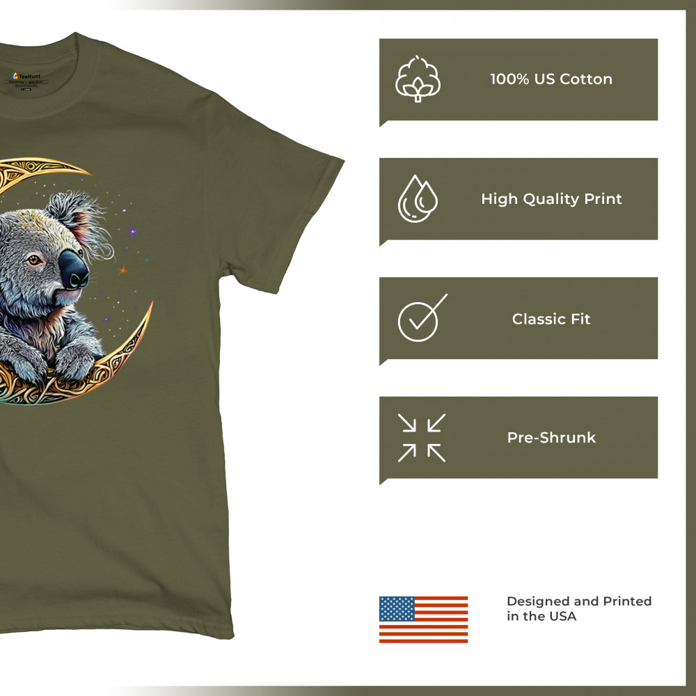 Koala resting in Celtic crescent moon with cosmic sky. A peaceful design for nature lovers, spiritual thinkers, and fantasy art fans.
