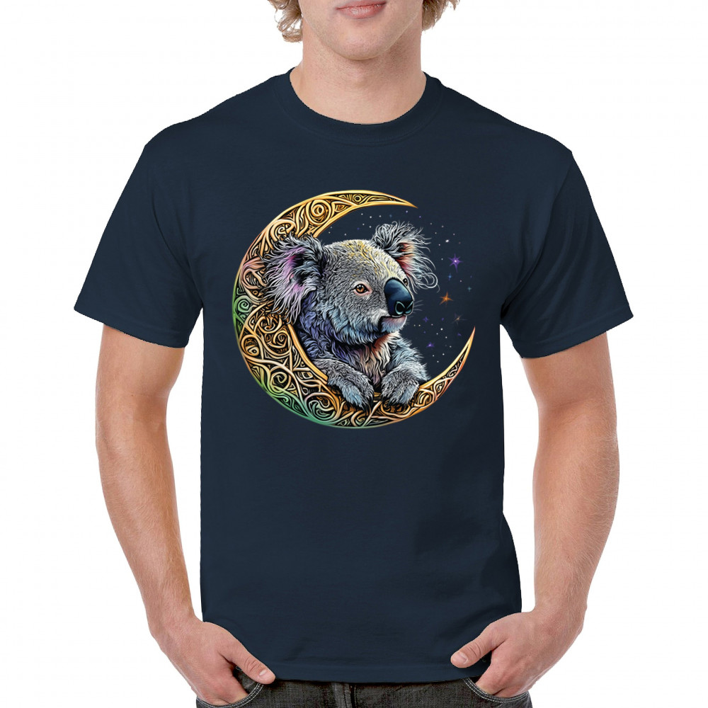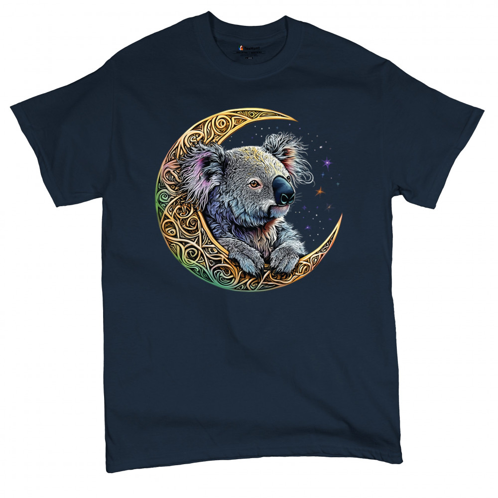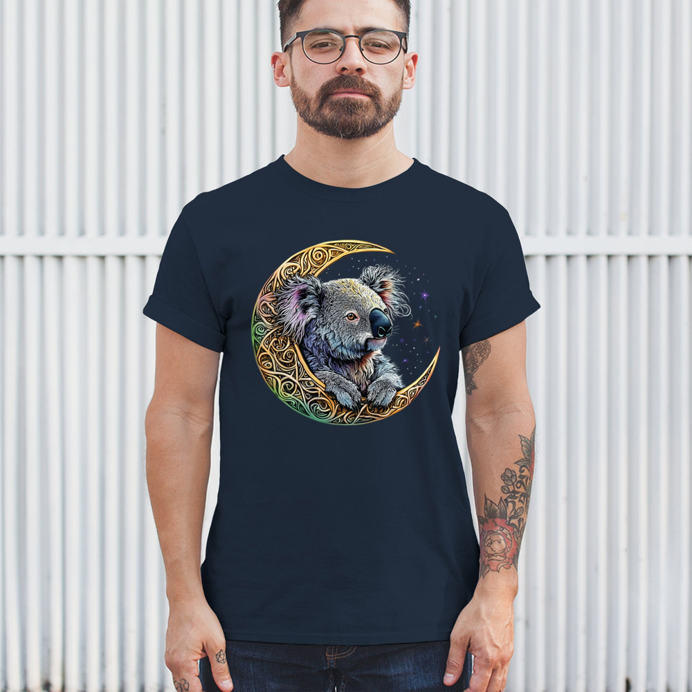 Koala resting in Celtic crescent moon with cosmic sky. A peaceful design for nature lovers, spiritual thinkers, and fantasy art fans.