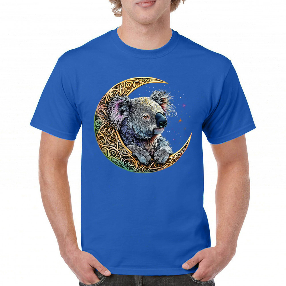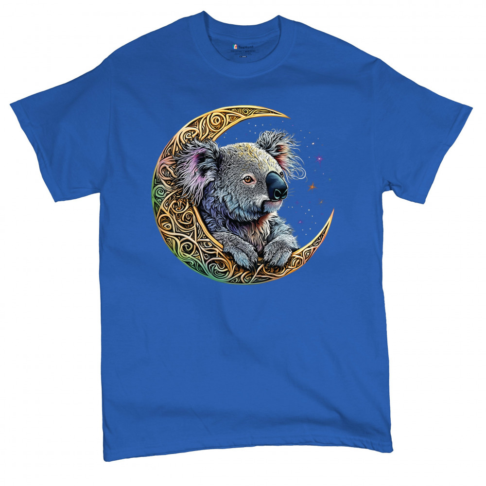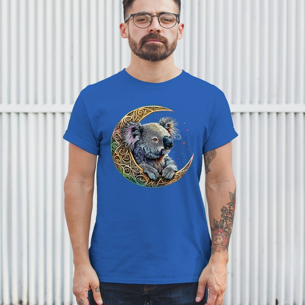 Koala resting in Celtic crescent moon with cosmic sky. A peaceful design for nature lovers, spiritual thinkers, and fantasy art fans.
