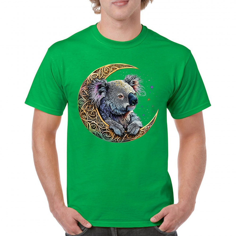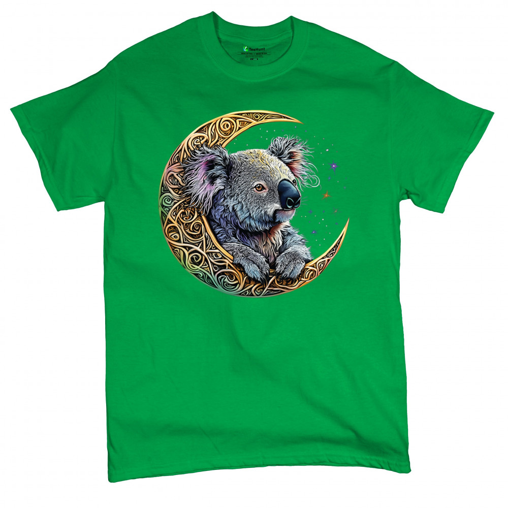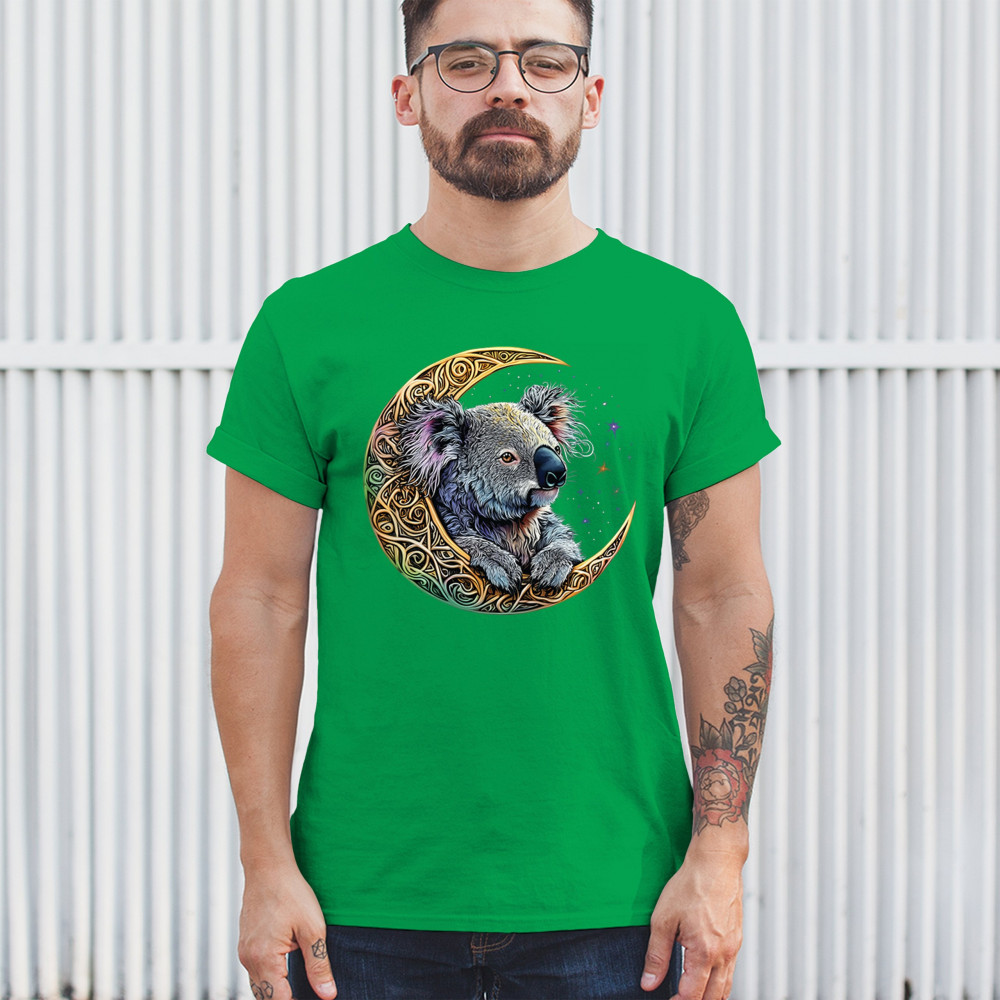 Koala resting in Celtic crescent moon with cosmic sky. A peaceful design for nature lovers, spiritual thinkers, and fantasy art fans.