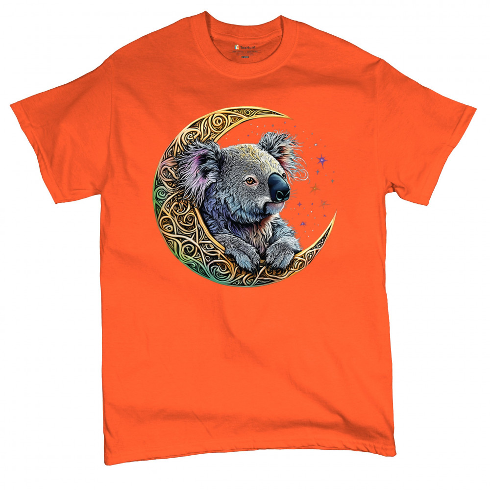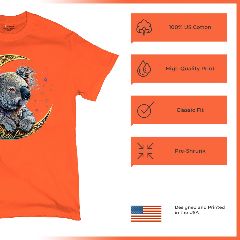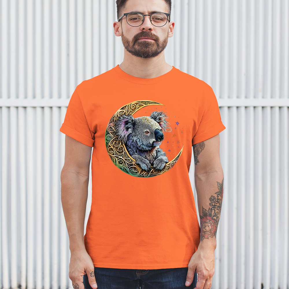 Koala resting in Celtic crescent moon with cosmic sky. A peaceful design for nature lovers, spiritual thinkers, and fantasy art fans.