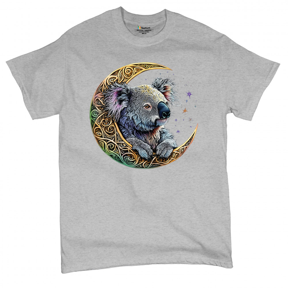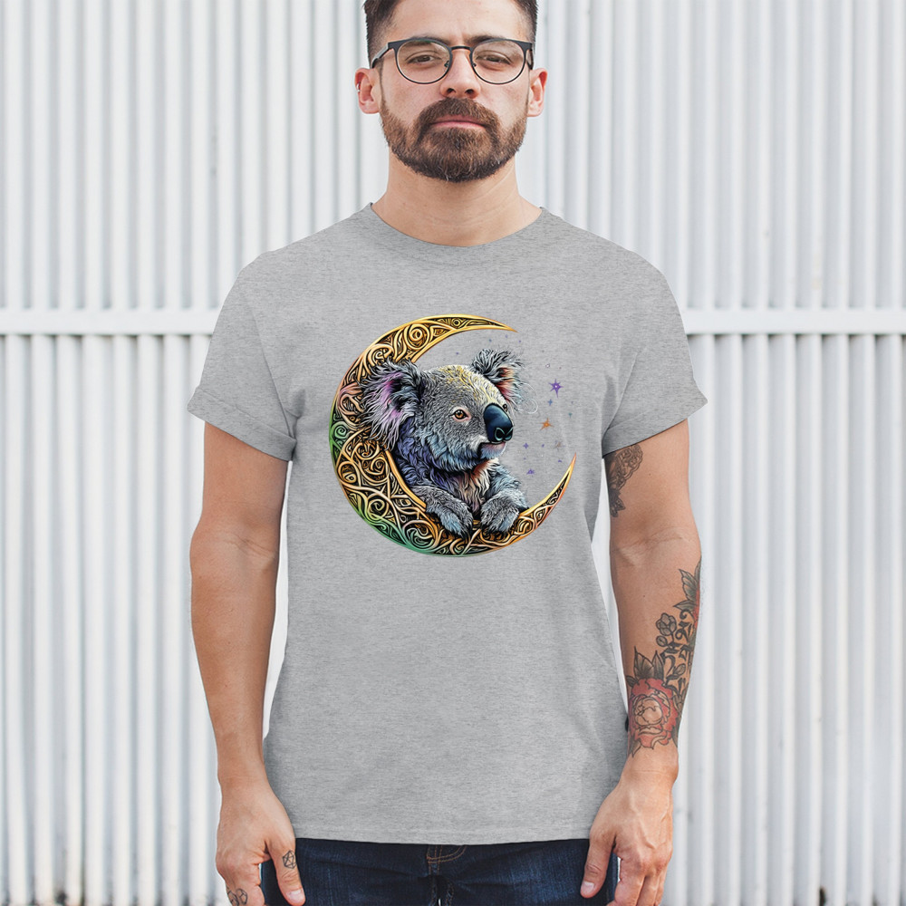 Koala resting in Celtic crescent moon with cosmic sky. A peaceful design for nature lovers, spiritual thinkers, and fantasy art fans.