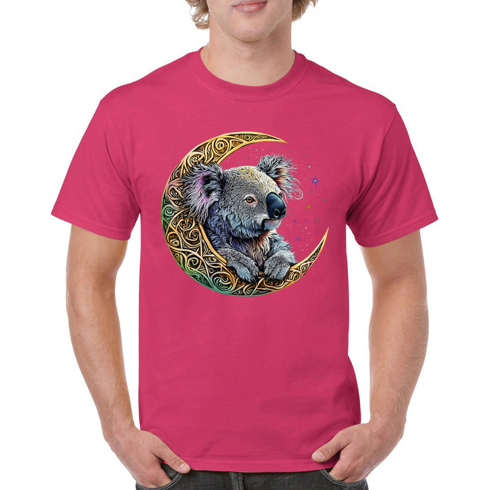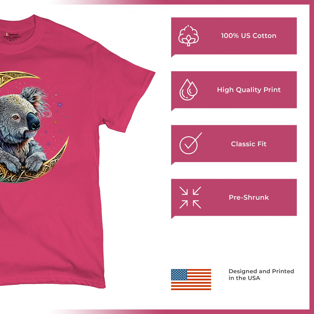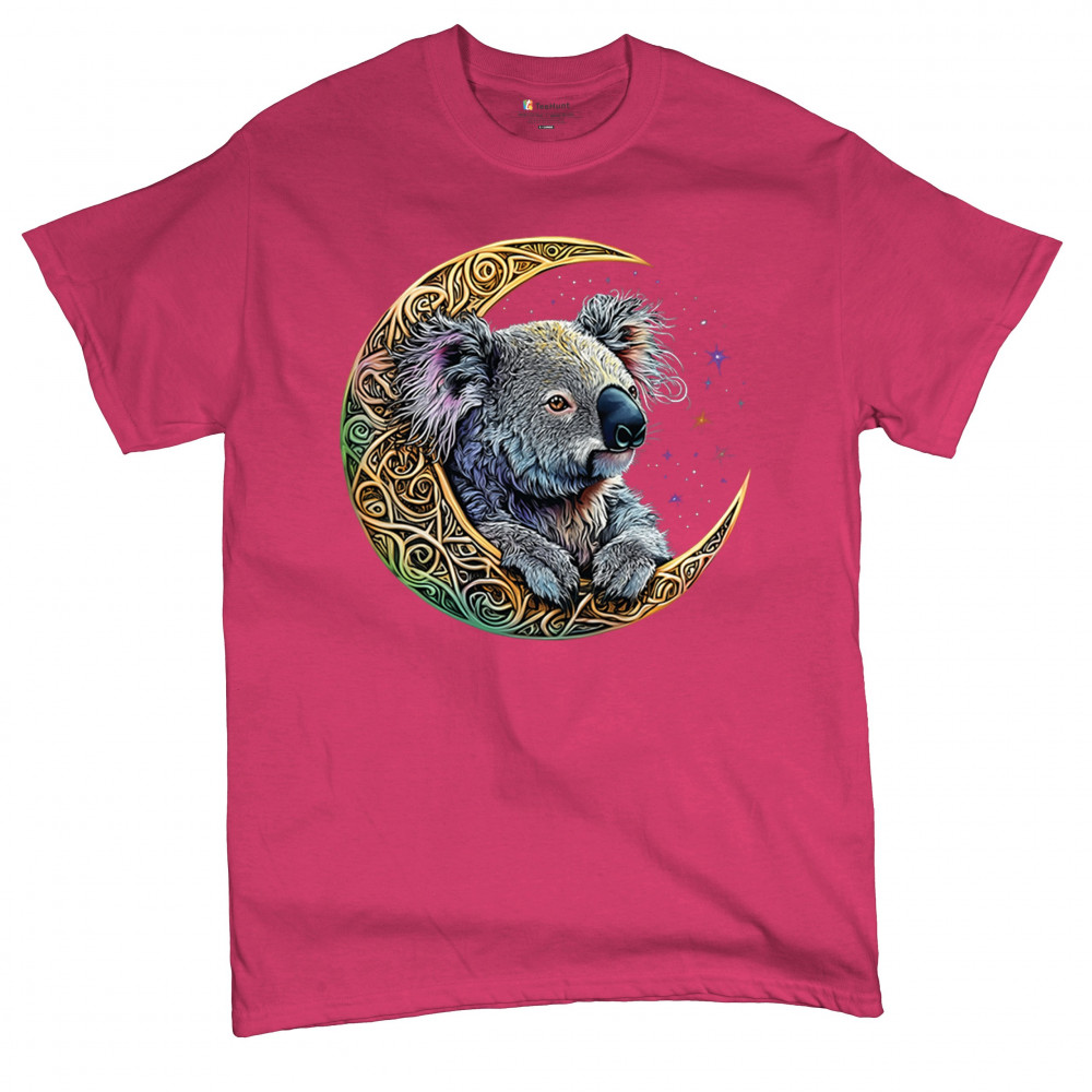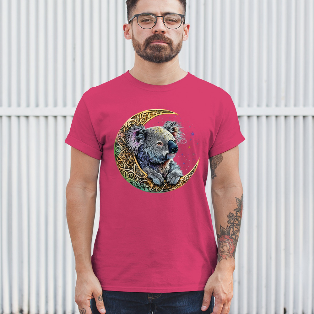 Koala resting in Celtic crescent moon with cosmic sky. A peaceful design for nature lovers, spiritual thinkers, and fantasy art fans.