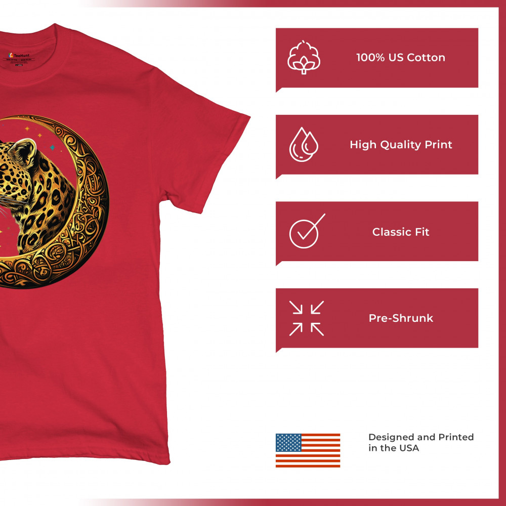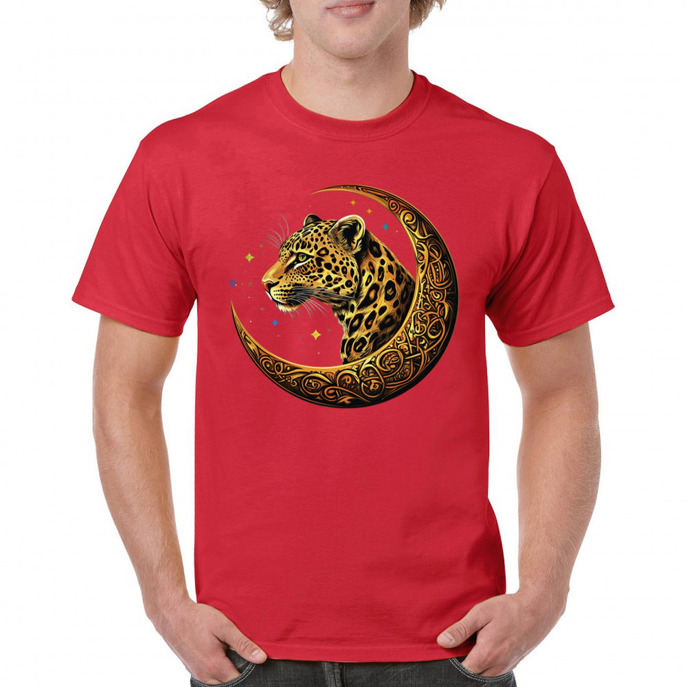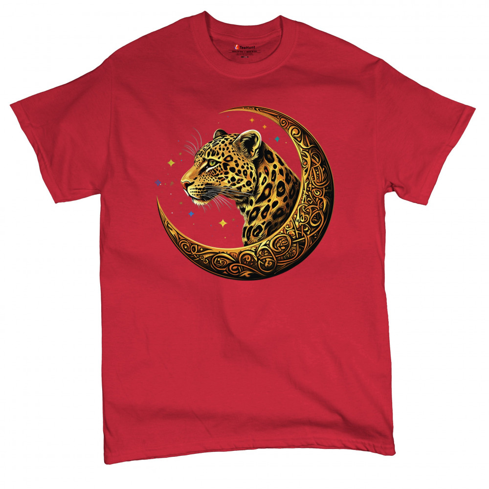 Unleash wild energy and spiritual symbolism with this bold leopard design set inside a golden Celtic crescent moon. A cosmic starry background amplifies its mystical vibe, symbolizing agility, independence, and awareness. Perfect for big cat lovers, jungle animal fans, and seekers of fantasy or tribal-inspired art.