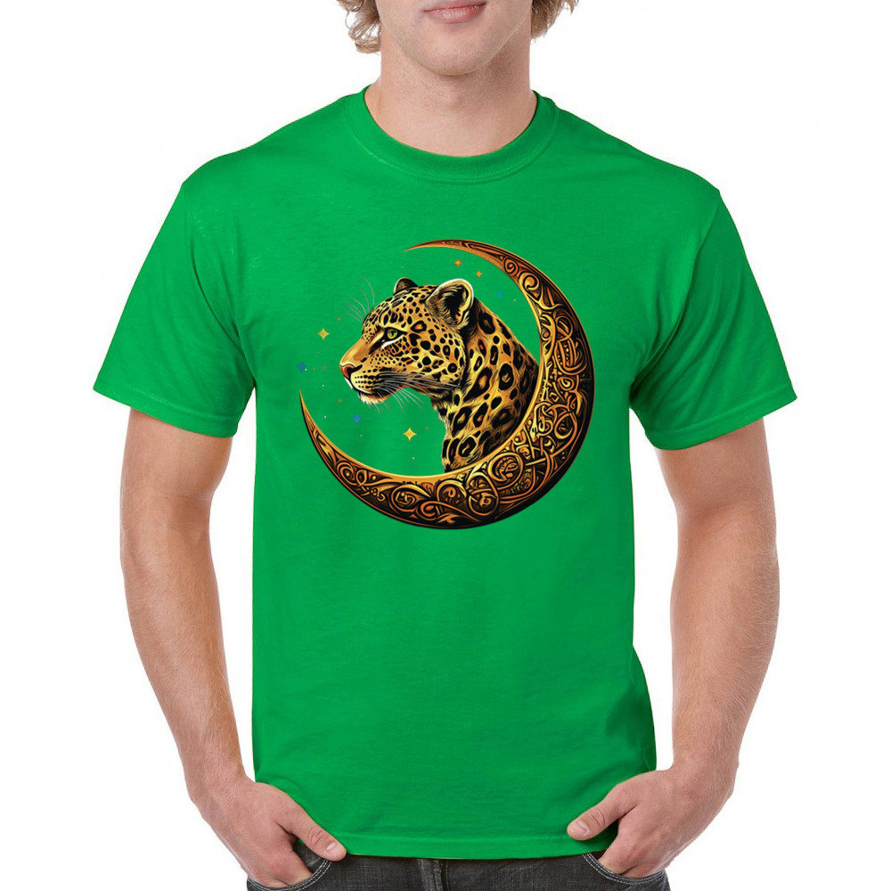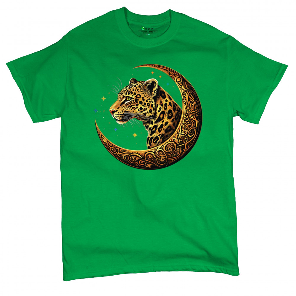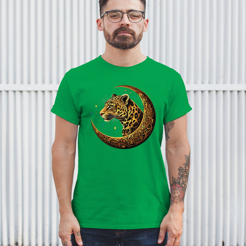 Unleash wild energy and spiritual symbolism with this bold leopard design set inside a golden Celtic crescent moon. A cosmic starry background amplifies its mystical vibe, symbolizing agility, independence, and awareness. Perfect for big cat lovers, jungle animal fans, and seekers of fantasy or tribal-inspired art.
