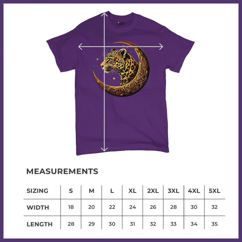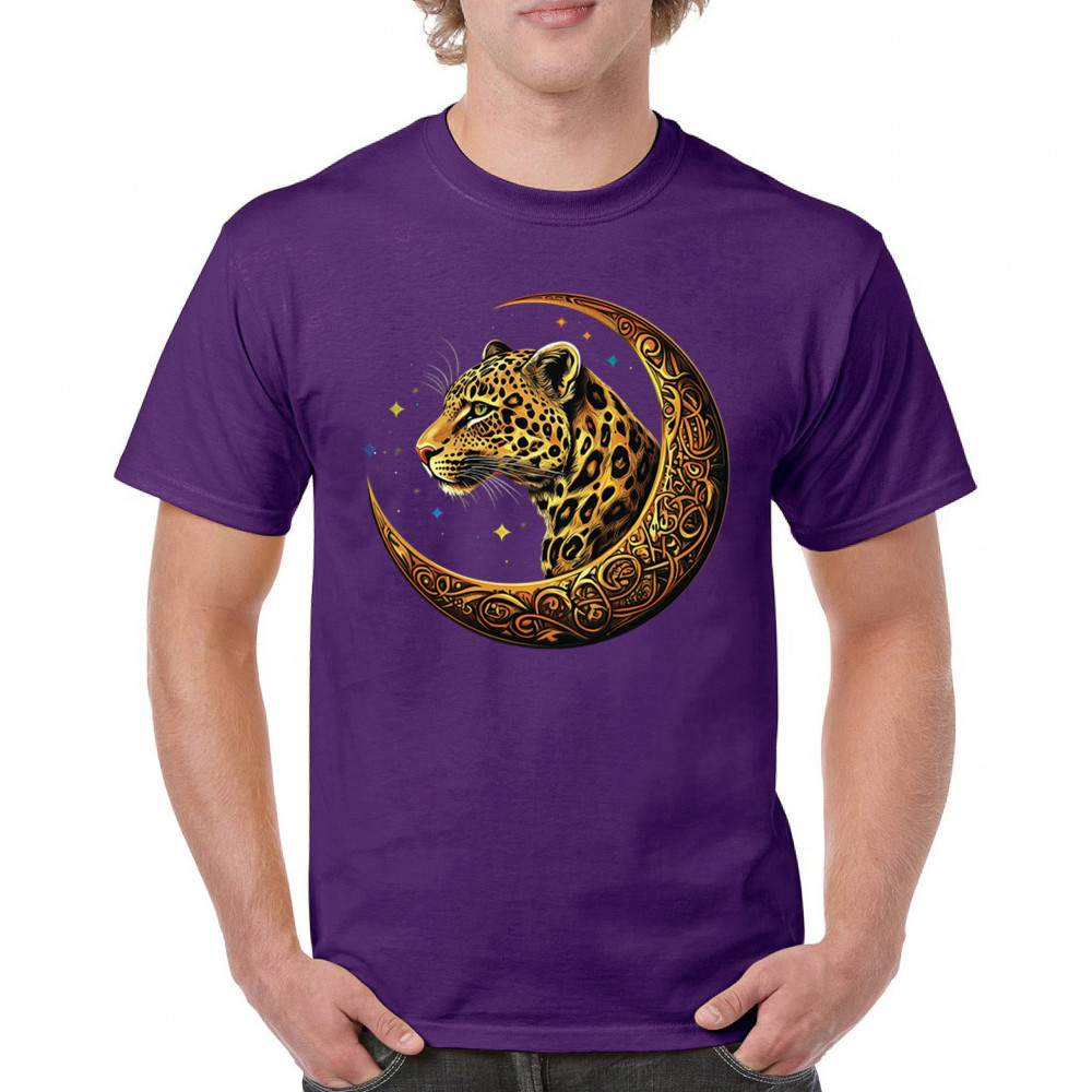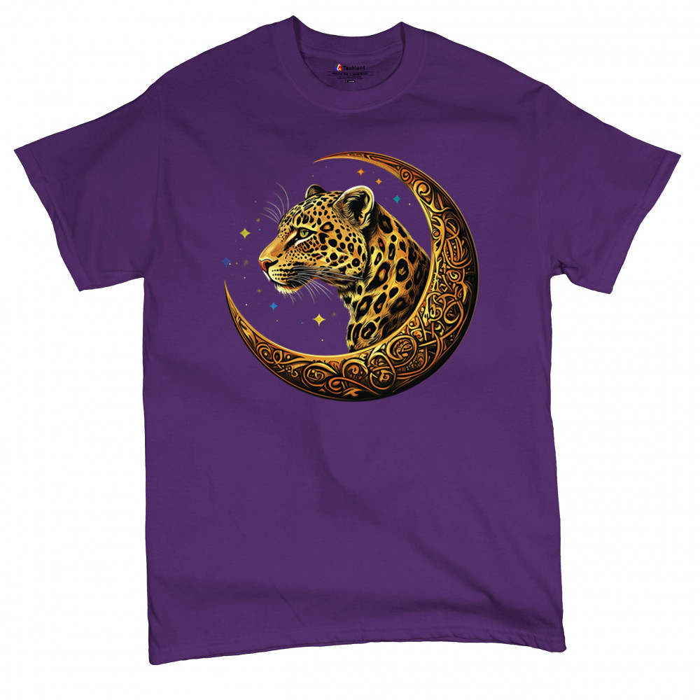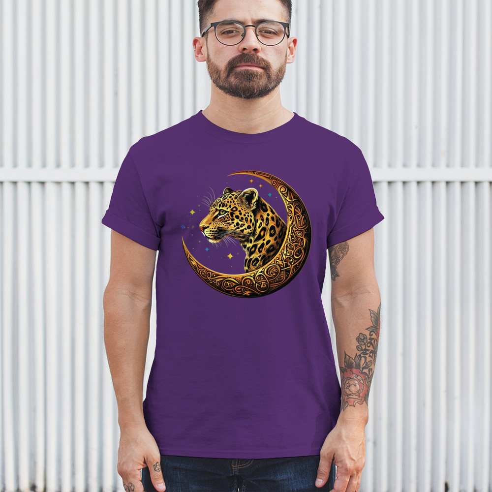 Unleash wild energy and spiritual symbolism with this bold leopard design set inside a golden Celtic crescent moon. A cosmic starry background amplifies its mystical vibe, symbolizing agility, independence, and awareness. Perfect for big cat lovers, jungle animal fans, and seekers of fantasy or tribal-inspired art.
