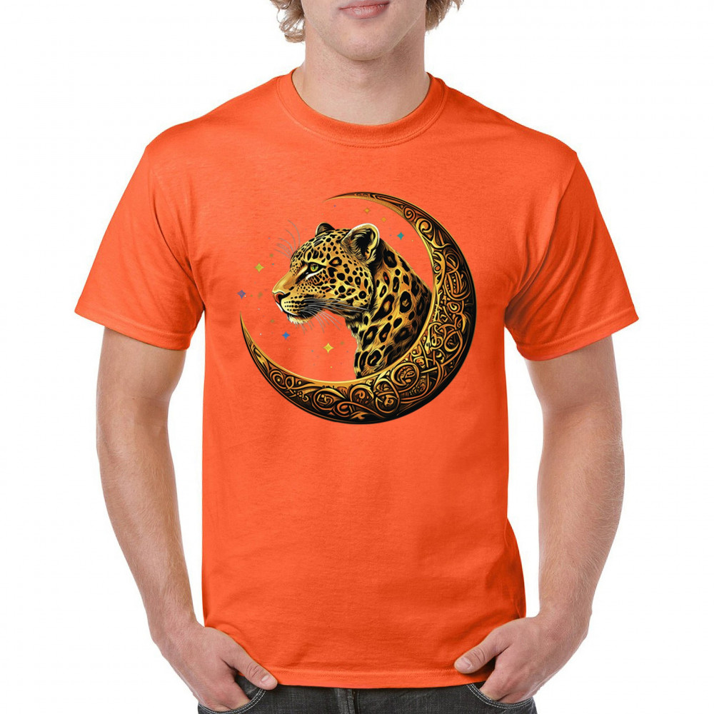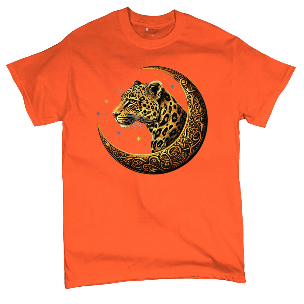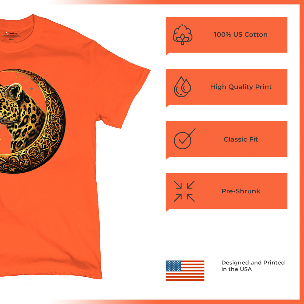 Unleash wild energy and spiritual symbolism with this bold leopard design set inside a golden Celtic crescent moon. A cosmic starry background amplifies its mystical vibe, symbolizing agility, independence, and awareness. Perfect for big cat lovers, jungle animal fans, and seekers of fantasy or tribal-inspired art.