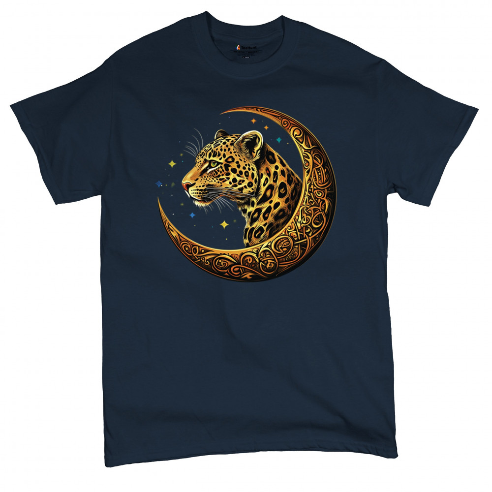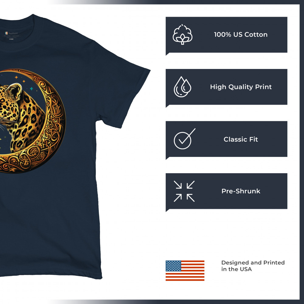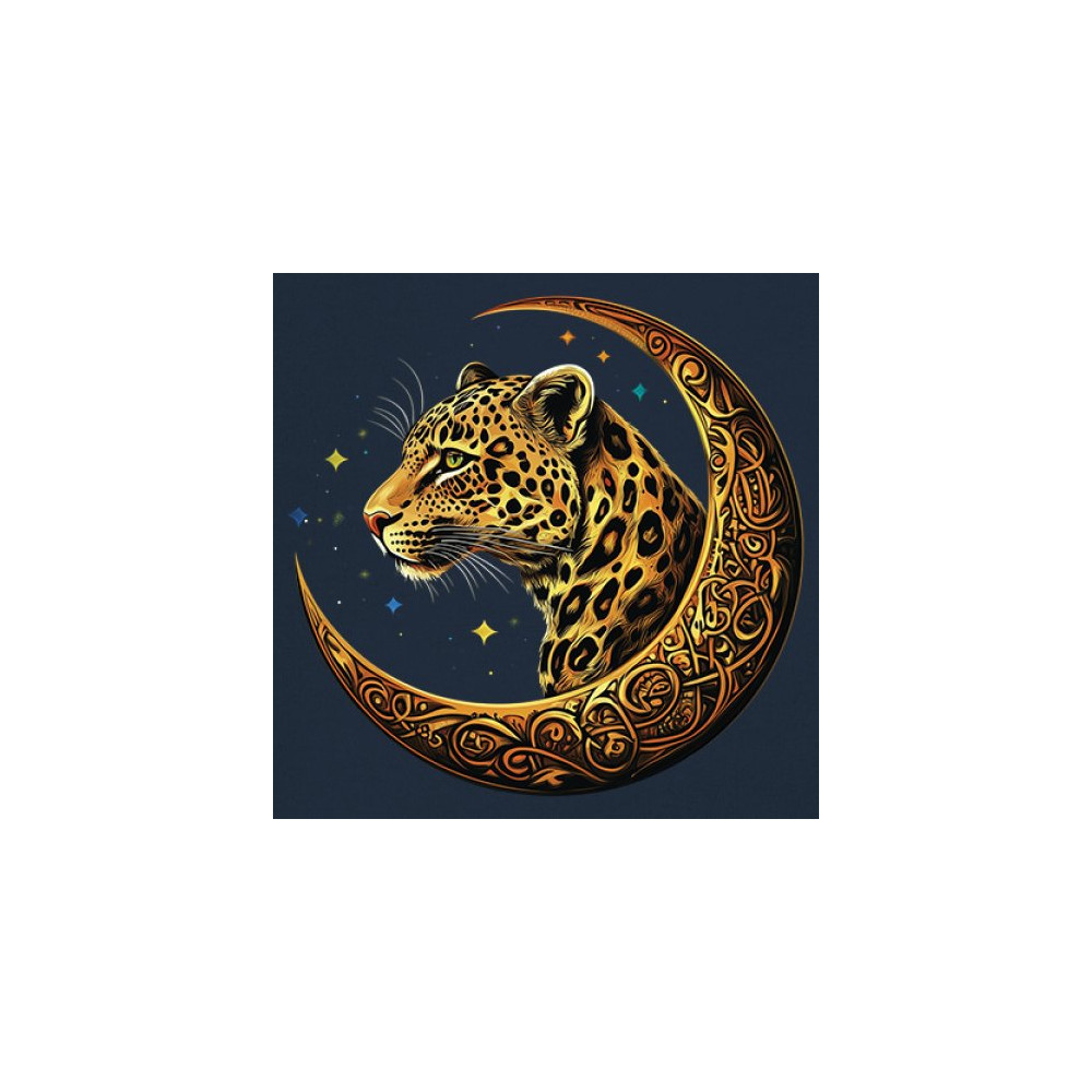 Unleash wild energy and spiritual symbolism with this bold leopard design set inside a golden Celtic crescent moon. A cosmic starry background amplifies its mystical vibe, symbolizing agility, independence, and awareness. Perfect for big cat lovers, jungle animal fans, and seekers of fantasy or tribal-inspired art.