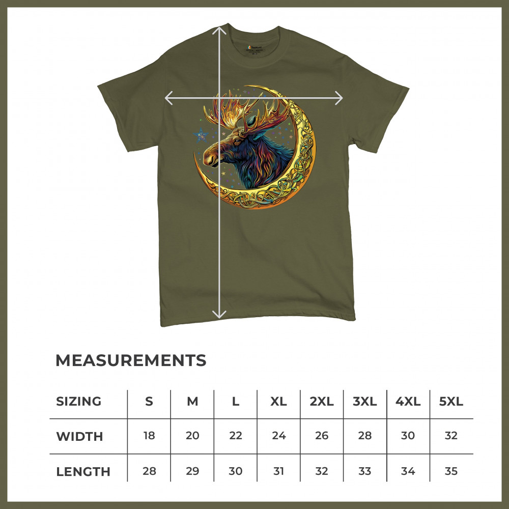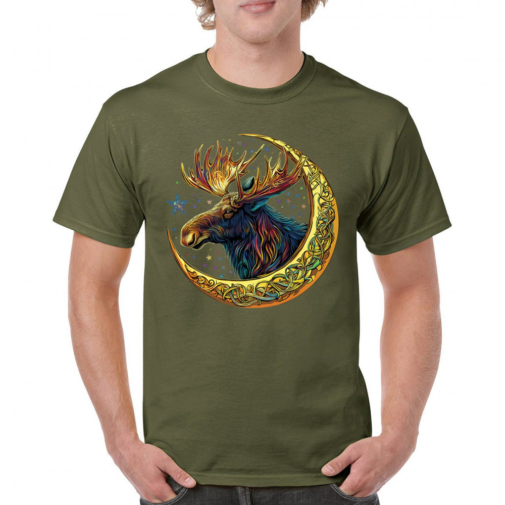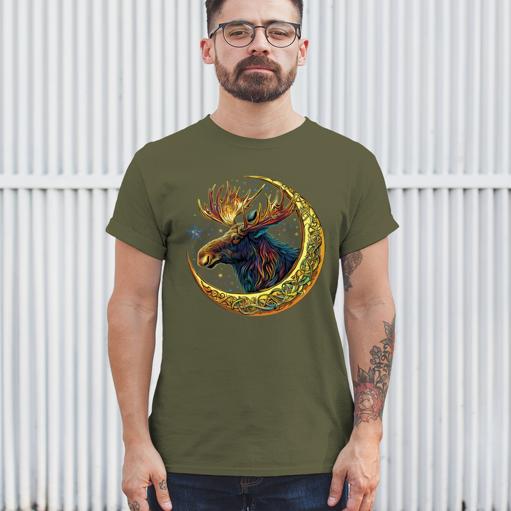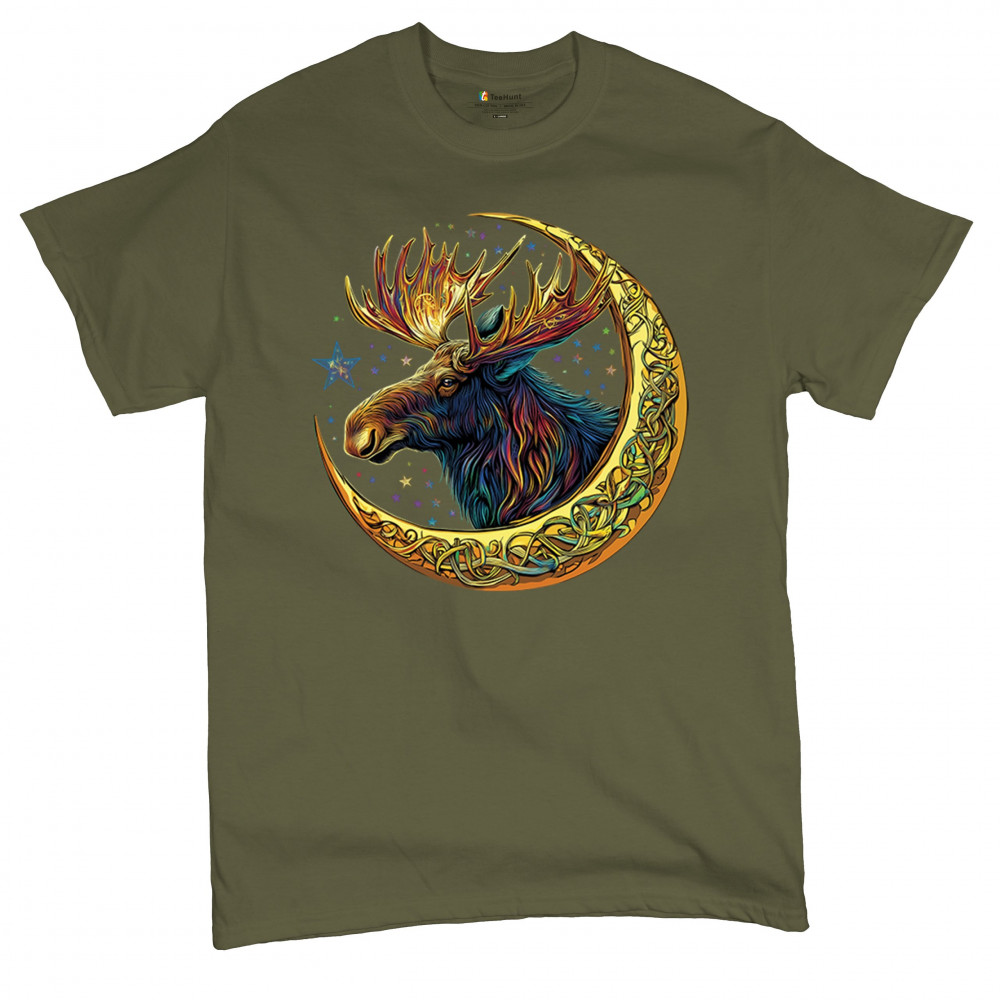 Mystical moose in gold Celtic crescent moon design—symbolizes strength, nature wisdom, and cosmic spirit for fantasy lovers and woodland fans.