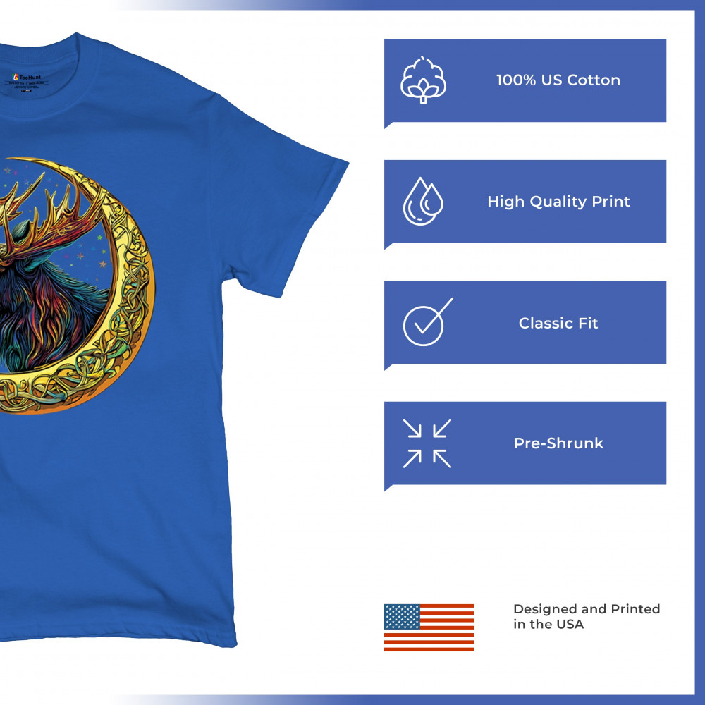 This vibrant moose design blends tribal art and fantasy energy with a golden Celtic crescent moon. Cosmic fur, radiant antlers, and a star-speckled sky make this image a symbol of strength, natural wisdom, and mysticism. Ideal for druids, hunters, fantasy fans, or spirit animal seekers connected to the forest and celestial realm.