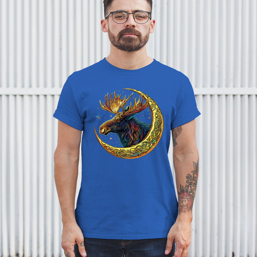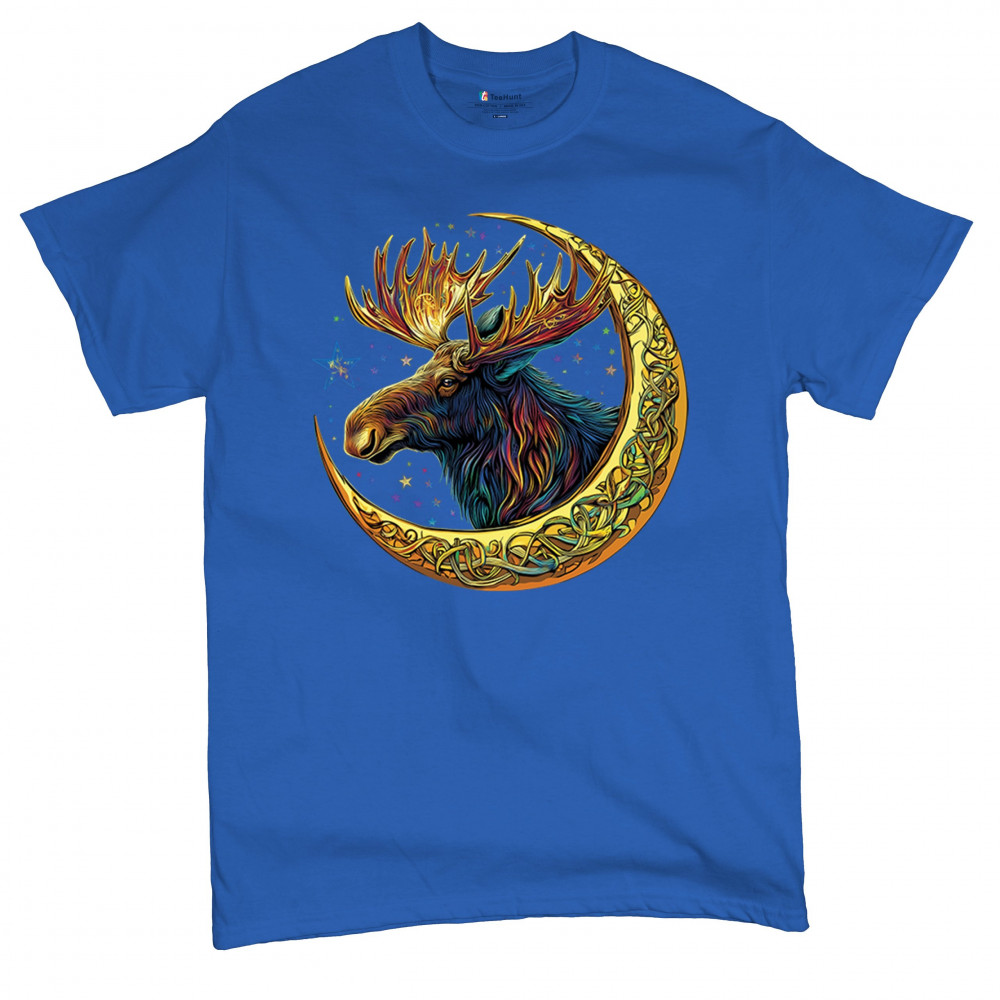 Mystical moose in gold Celtic crescent moon design—symbolizes strength, nature wisdom, and cosmic spirit for fantasy lovers and woodland fans.