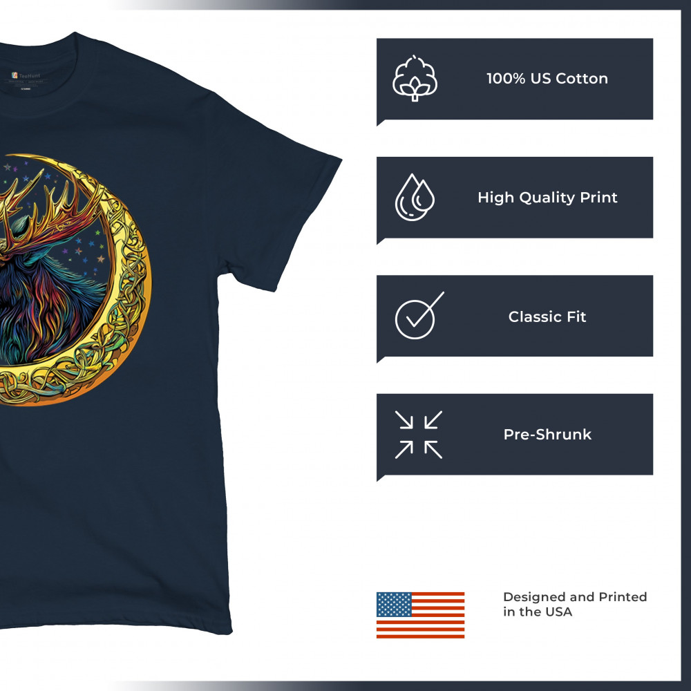 This vibrant moose design blends tribal art and fantasy energy with a golden Celtic crescent moon. Cosmic fur, radiant antlers, and a star-speckled sky make this image a symbol of strength, natural wisdom, and mysticism. Ideal for druids, hunters, fantasy fans, or spirit animal seekers connected to the forest and celestial realm.