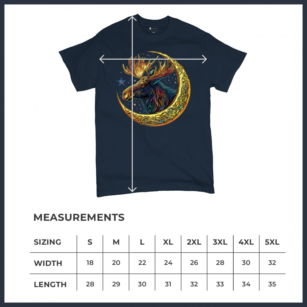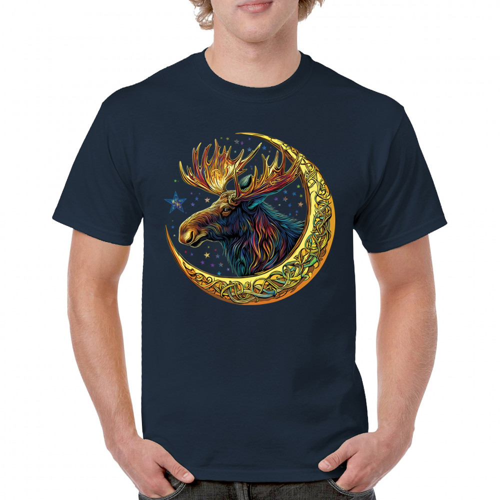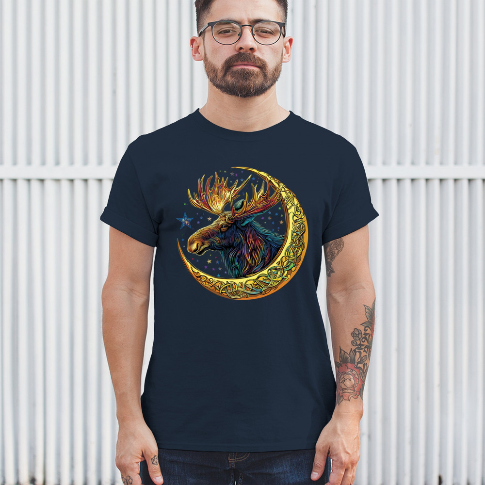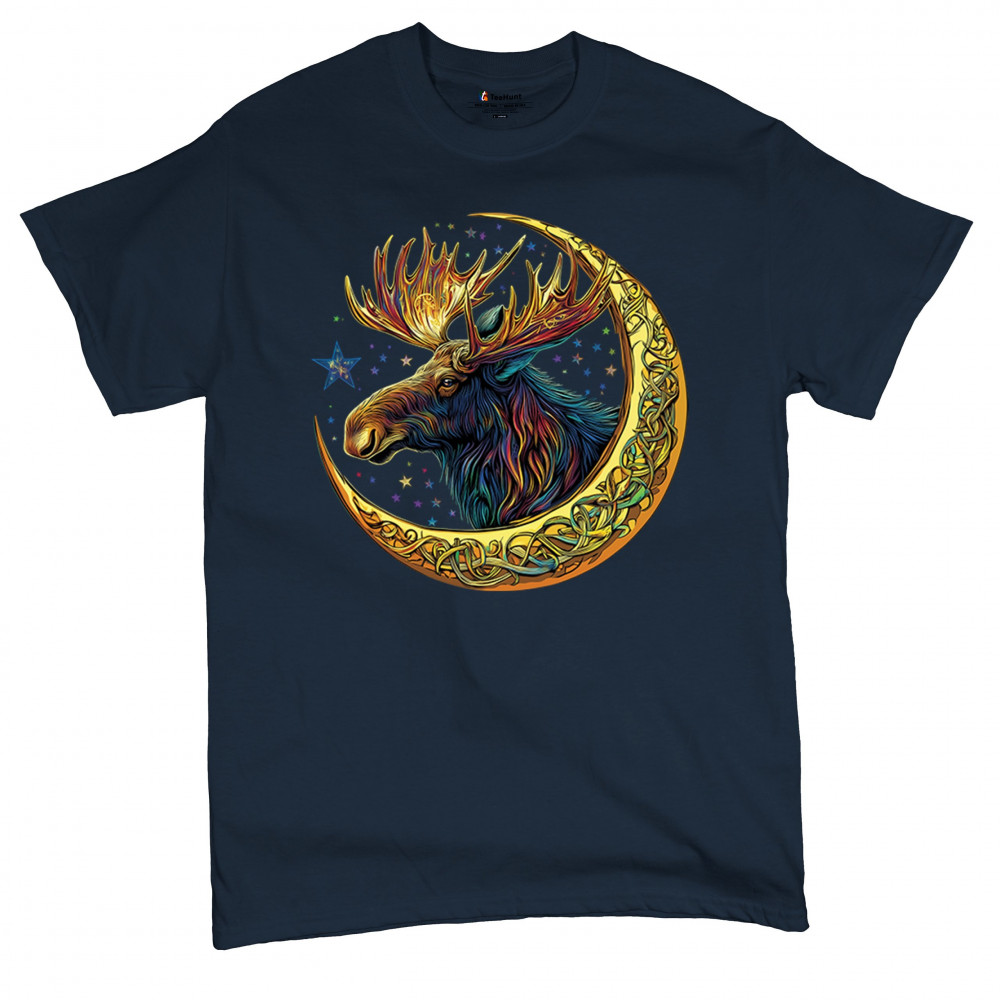 Mystical moose in gold Celtic crescent moon design—symbolizes strength, nature wisdom, and cosmic spirit for fantasy lovers and woodland fans.