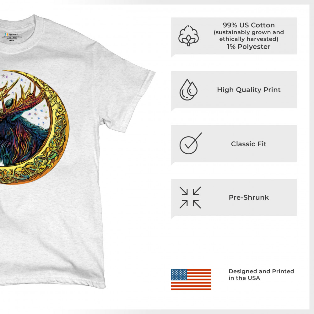 This vibrant moose design blends tribal art and fantasy energy with a golden Celtic crescent moon. Cosmic fur, radiant antlers, and a star-speckled sky make this image a symbol of strength, natural wisdom, and mysticism. Ideal for druids, hunters, fantasy fans, or spirit animal seekers connected to the forest and celestial realm.