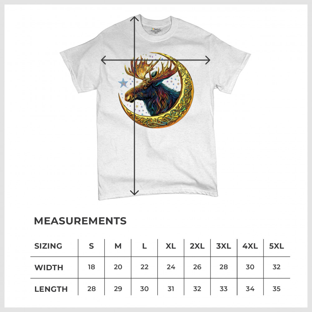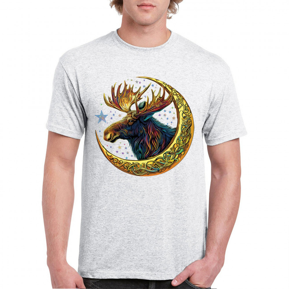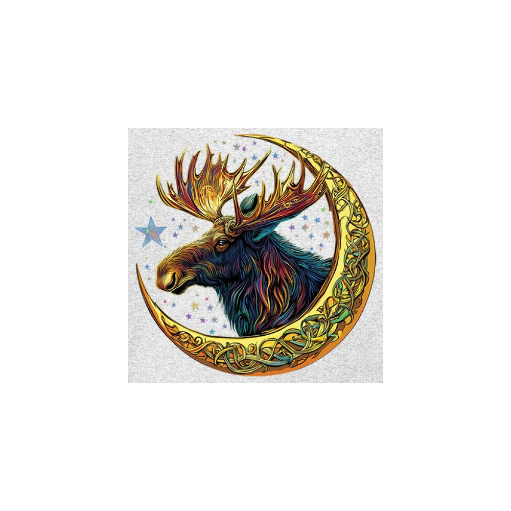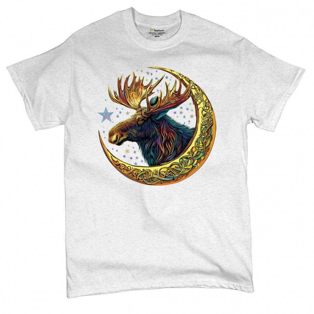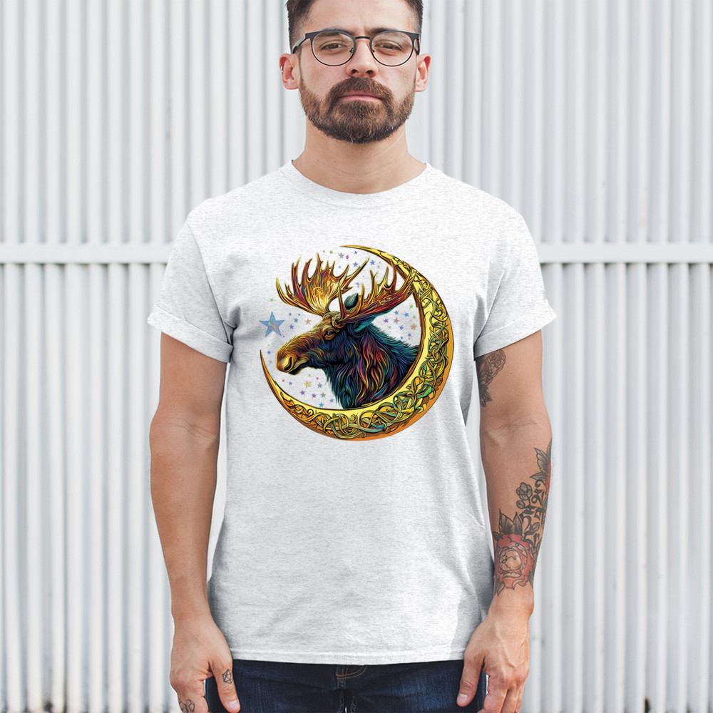 Mystical moose in gold Celtic crescent moon design—symbolizes strength, nature wisdom, and cosmic spirit for fantasy lovers and woodland fans.
