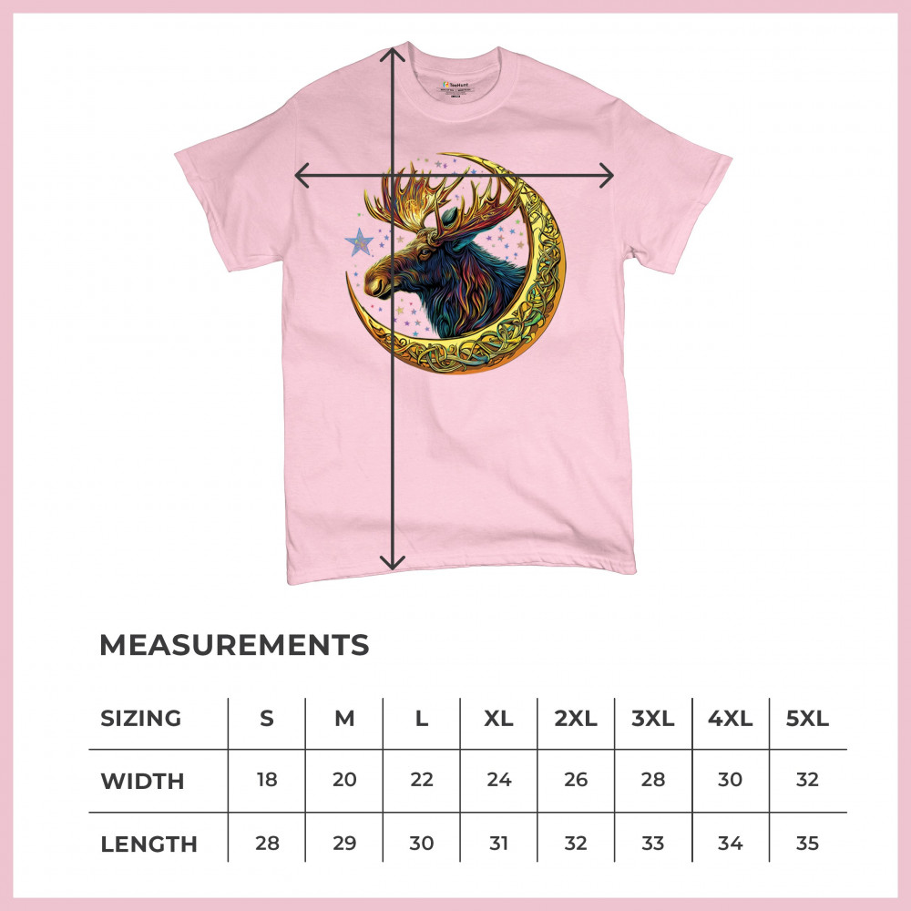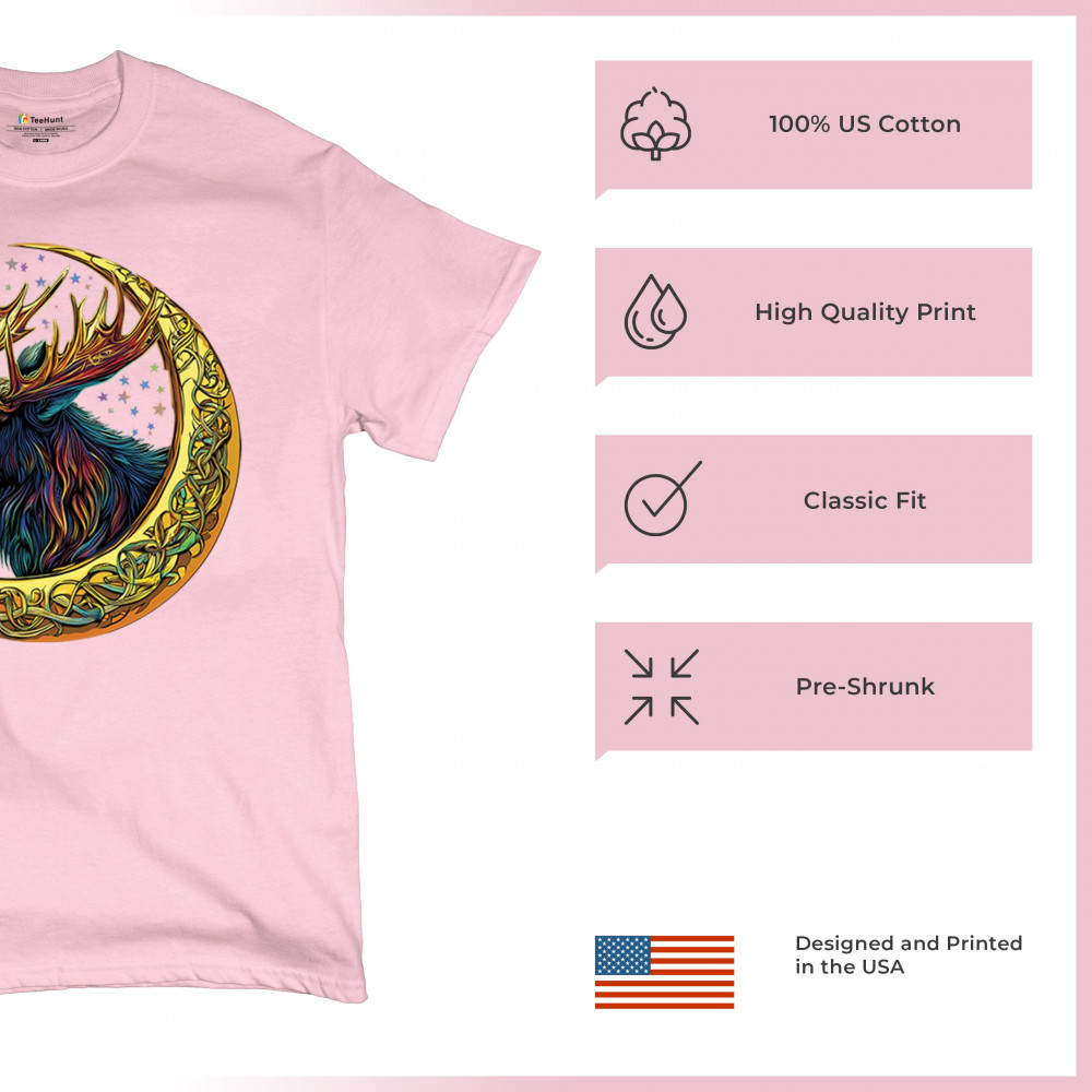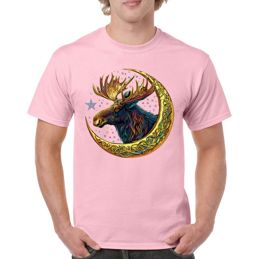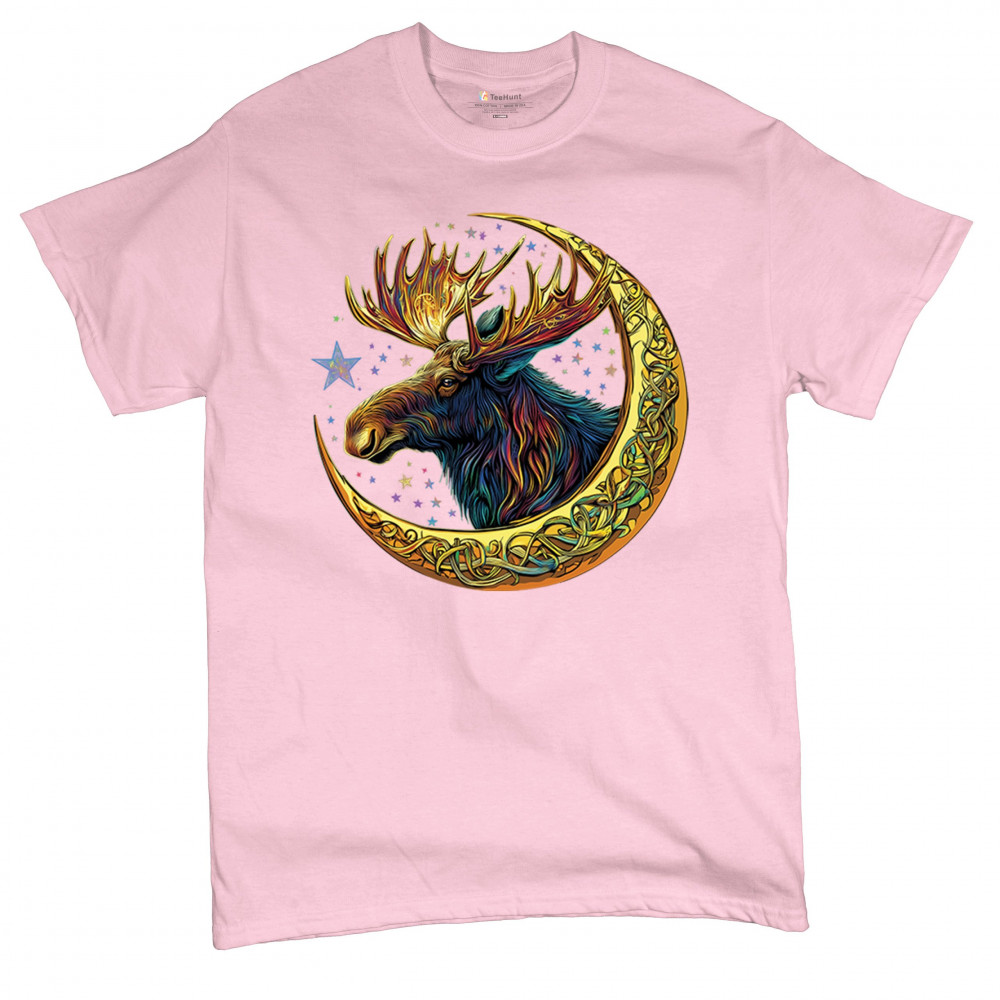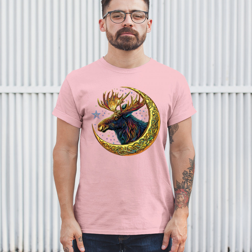 Mystical moose in gold Celtic crescent moon design—symbolizes strength, nature wisdom, and cosmic spirit for fantasy lovers and woodland fans.