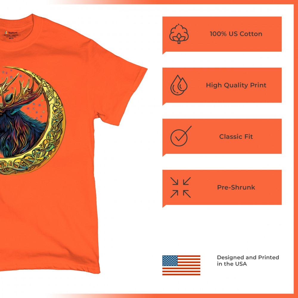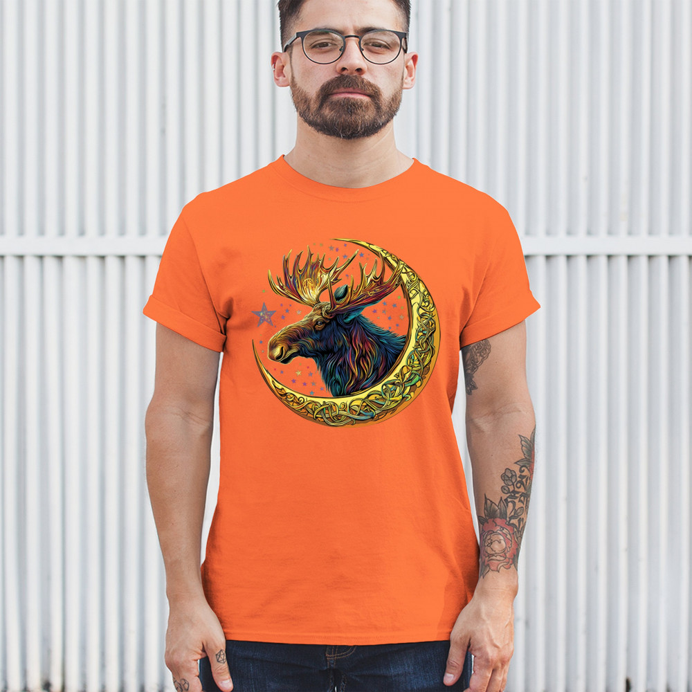 This vibrant moose design blends tribal art and fantasy energy with a golden Celtic crescent moon. Cosmic fur, radiant antlers, and a star-speckled sky make this image a symbol of strength, natural wisdom, and mysticism. Ideal for druids, hunters, fantasy fans, or spirit animal seekers connected to the forest and celestial realm.