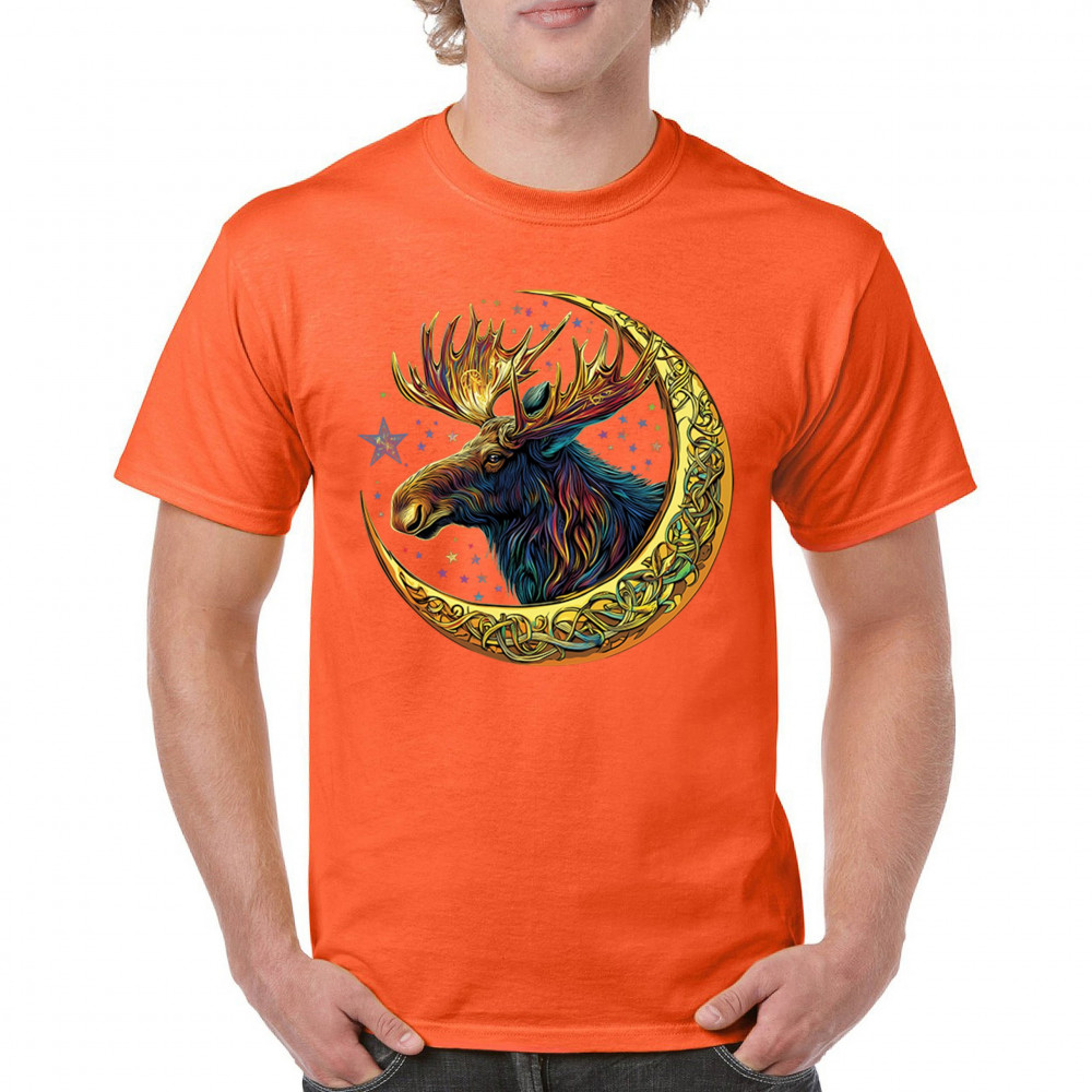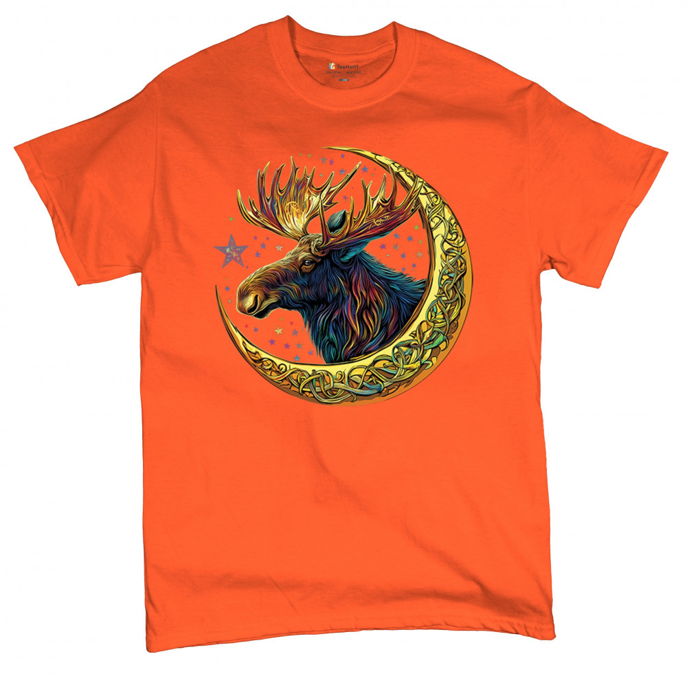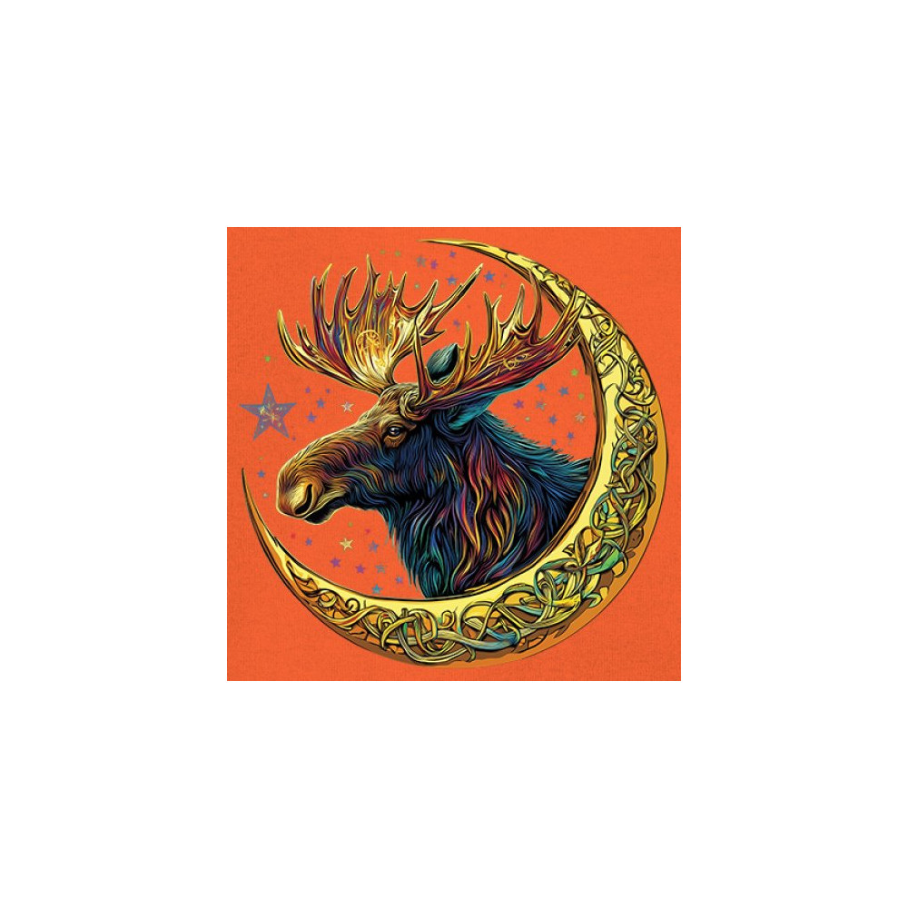 Mystical moose in gold Celtic crescent moon design—symbolizes strength, nature wisdom, and cosmic spirit for fantasy lovers and woodland fans.