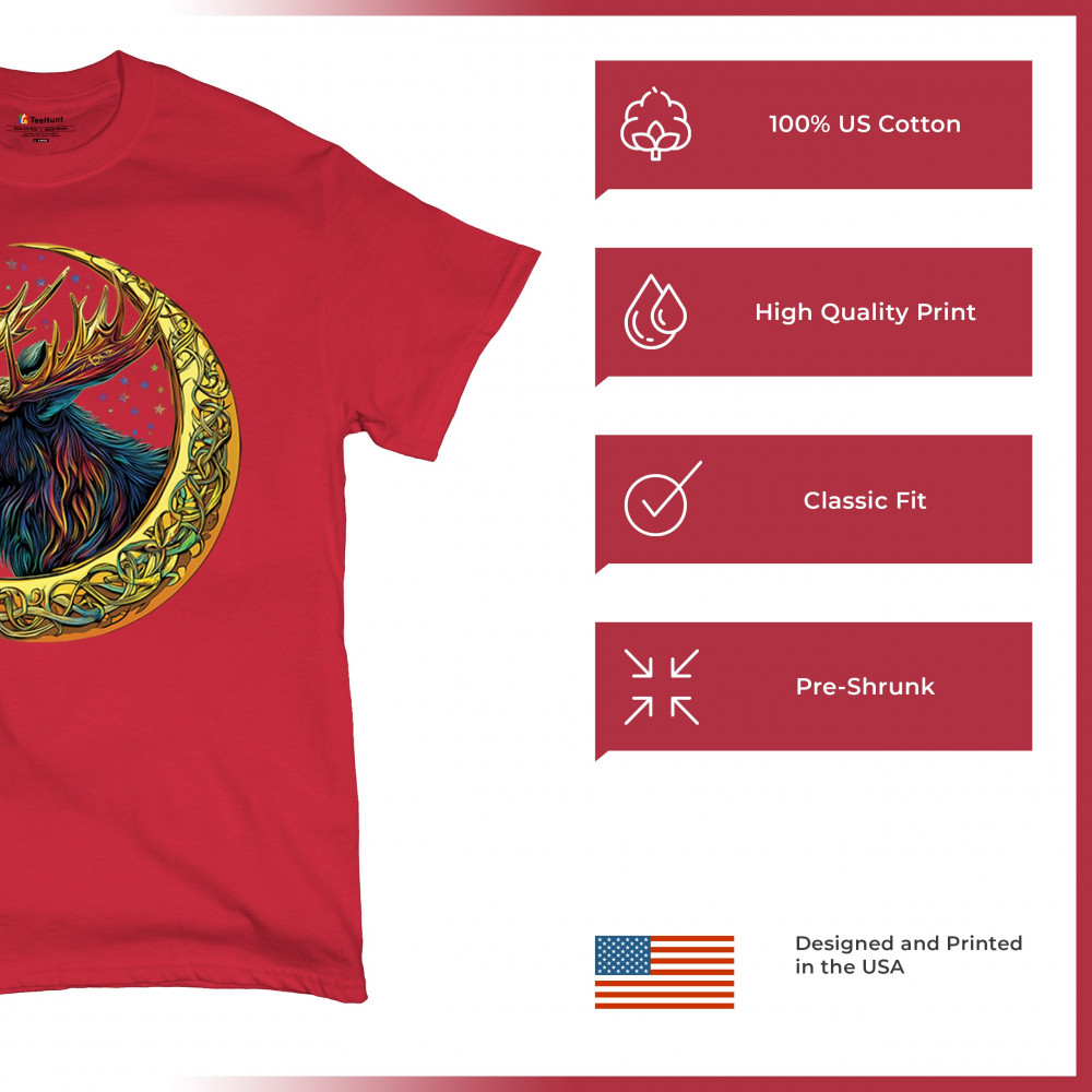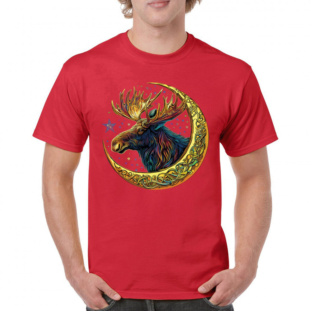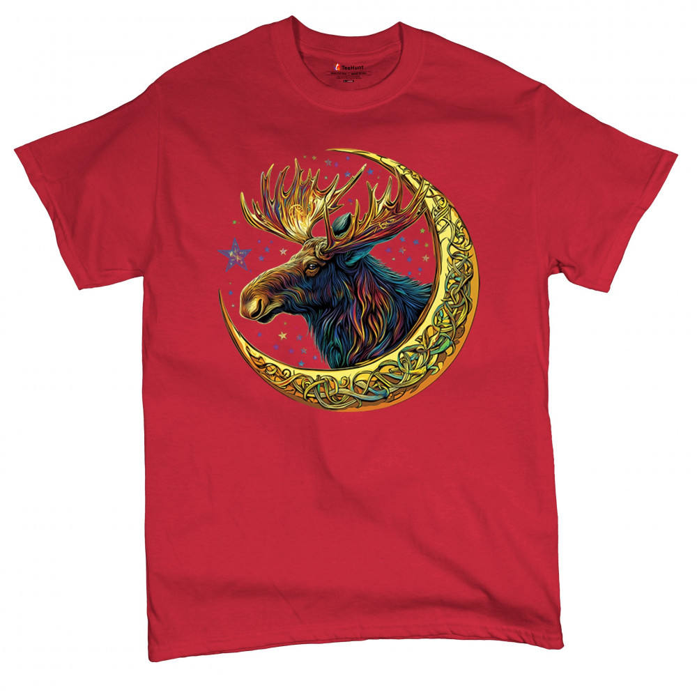 Mystical moose in gold Celtic crescent moon design—symbolizes strength, nature wisdom, and cosmic spirit for fantasy lovers and woodland fans.