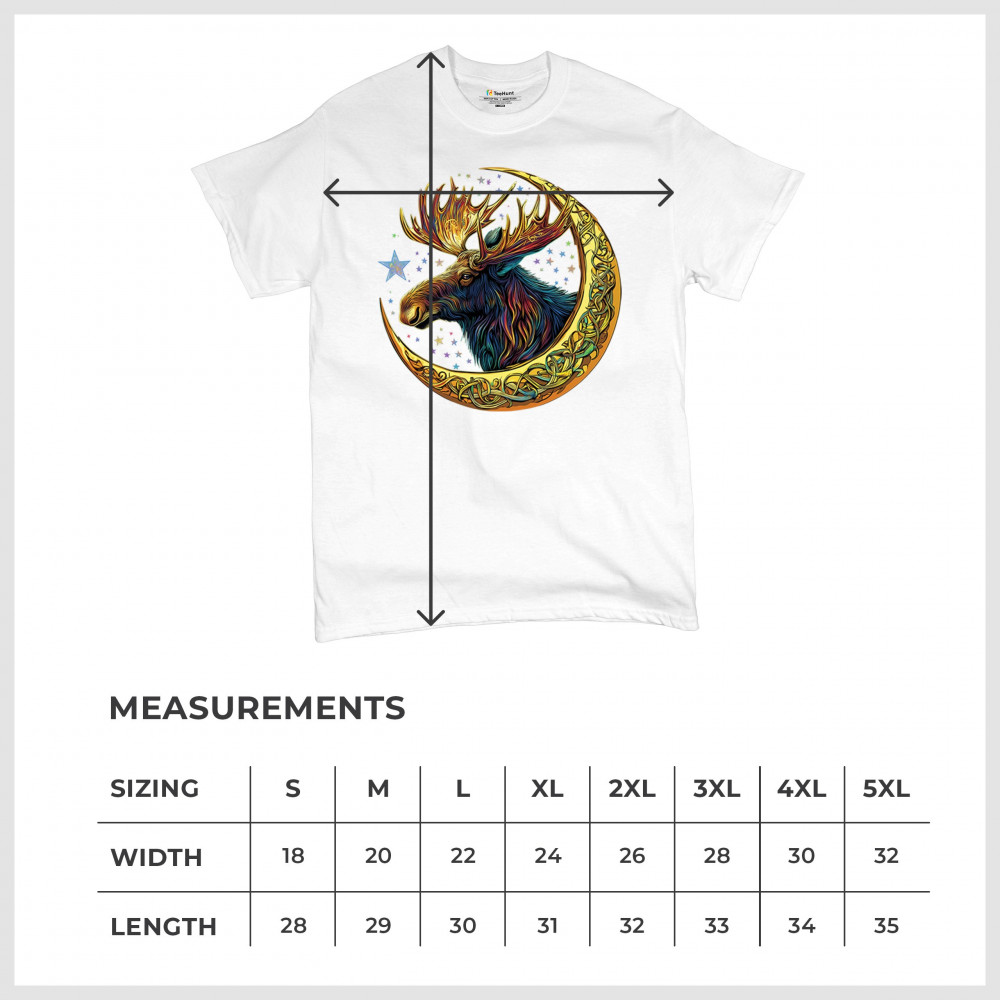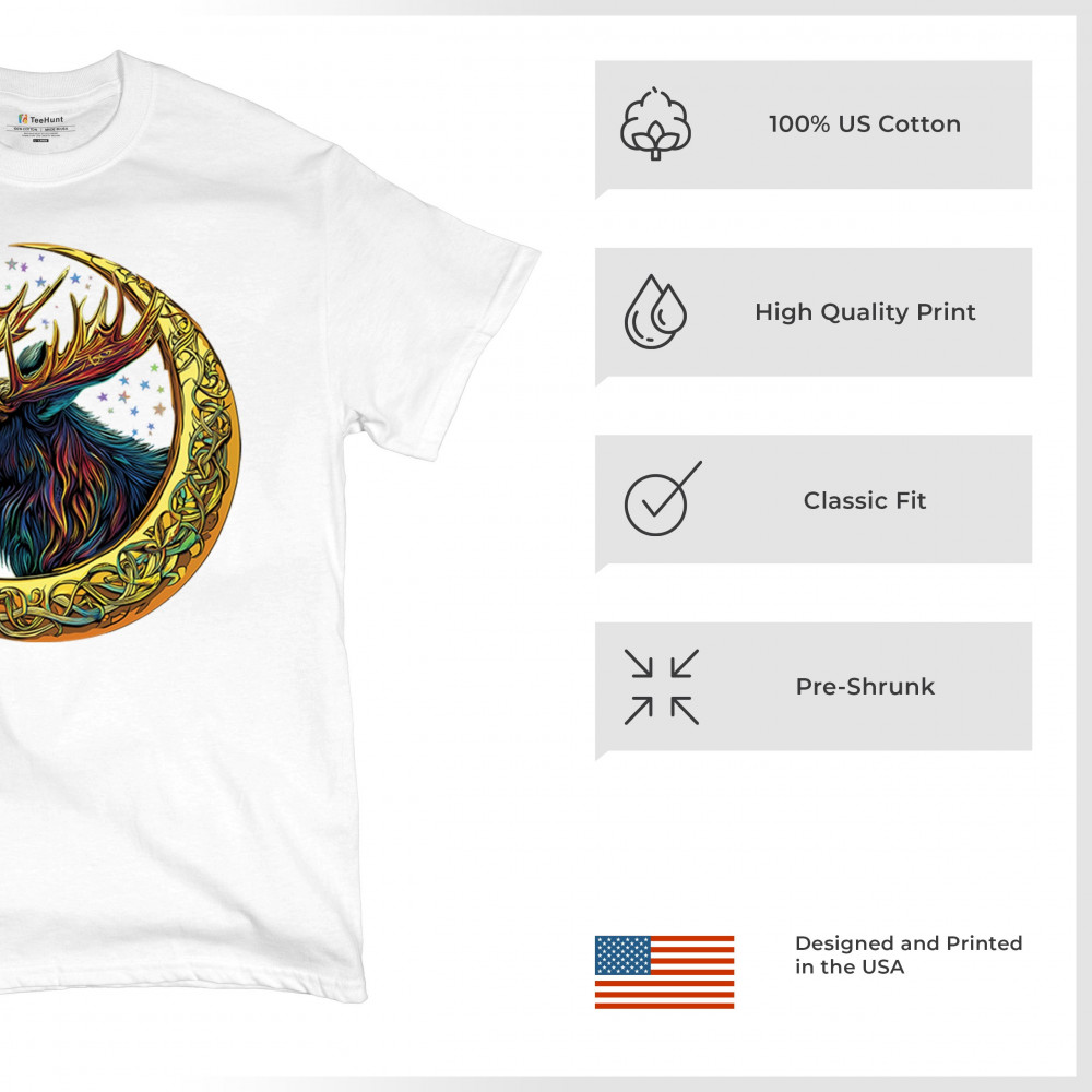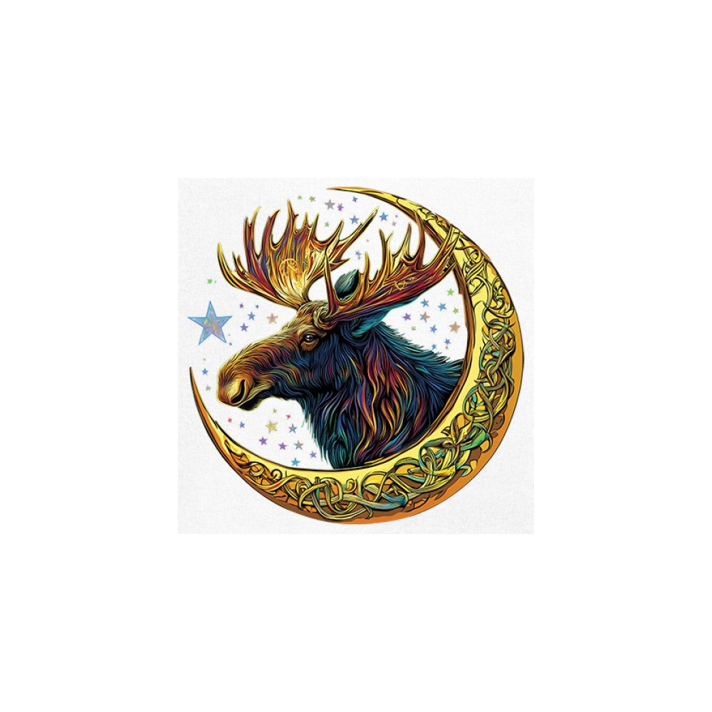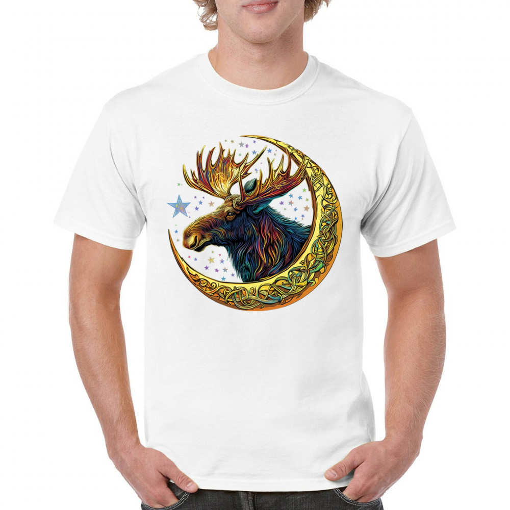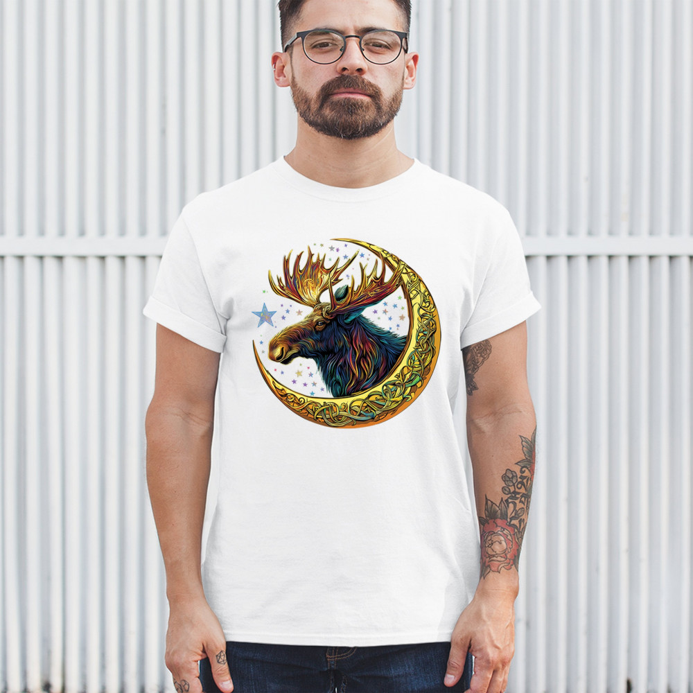 Mystical moose in gold Celtic crescent moon design—symbolizes strength, nature wisdom, and cosmic spirit for fantasy lovers and woodland fans.