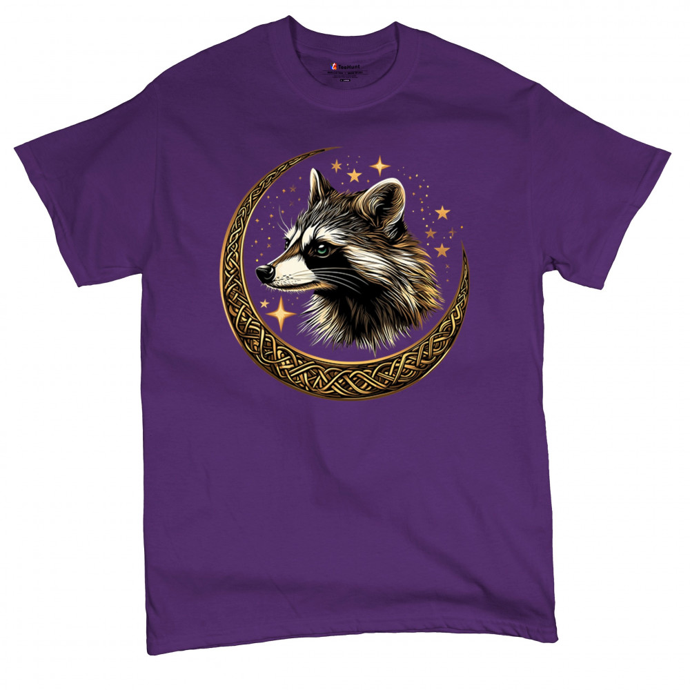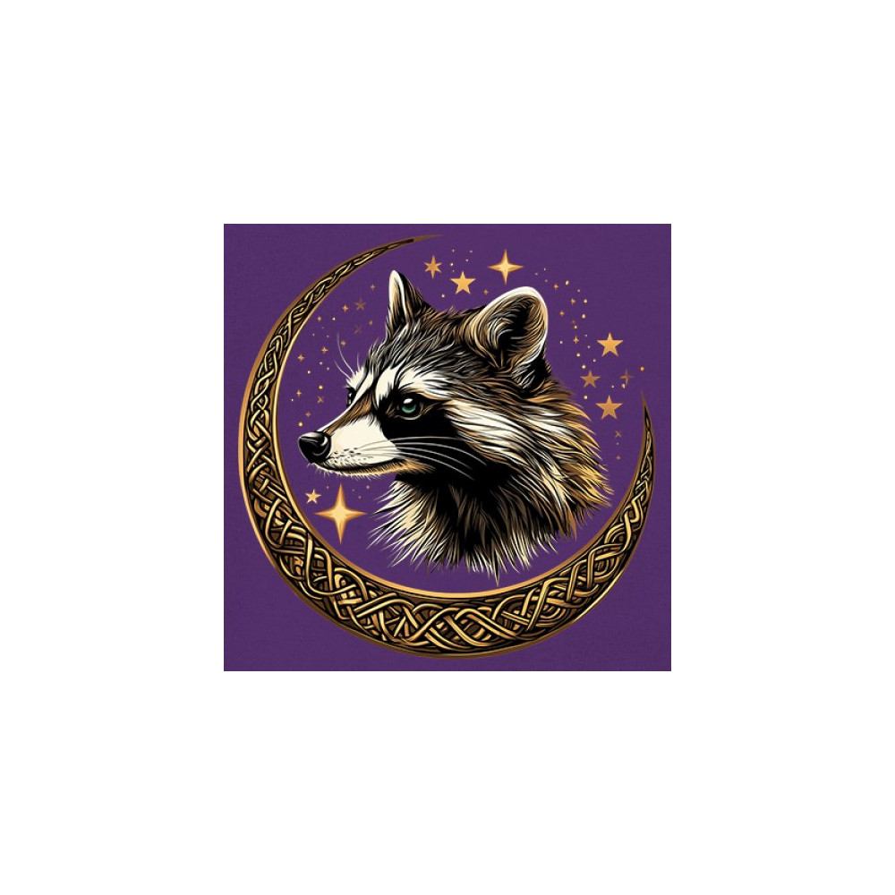 Cosmic raccoon design in Celtic moon. Symbol of adaptability, mystery, and spiritual intelligence. A perfect gift for wild and curious souls.