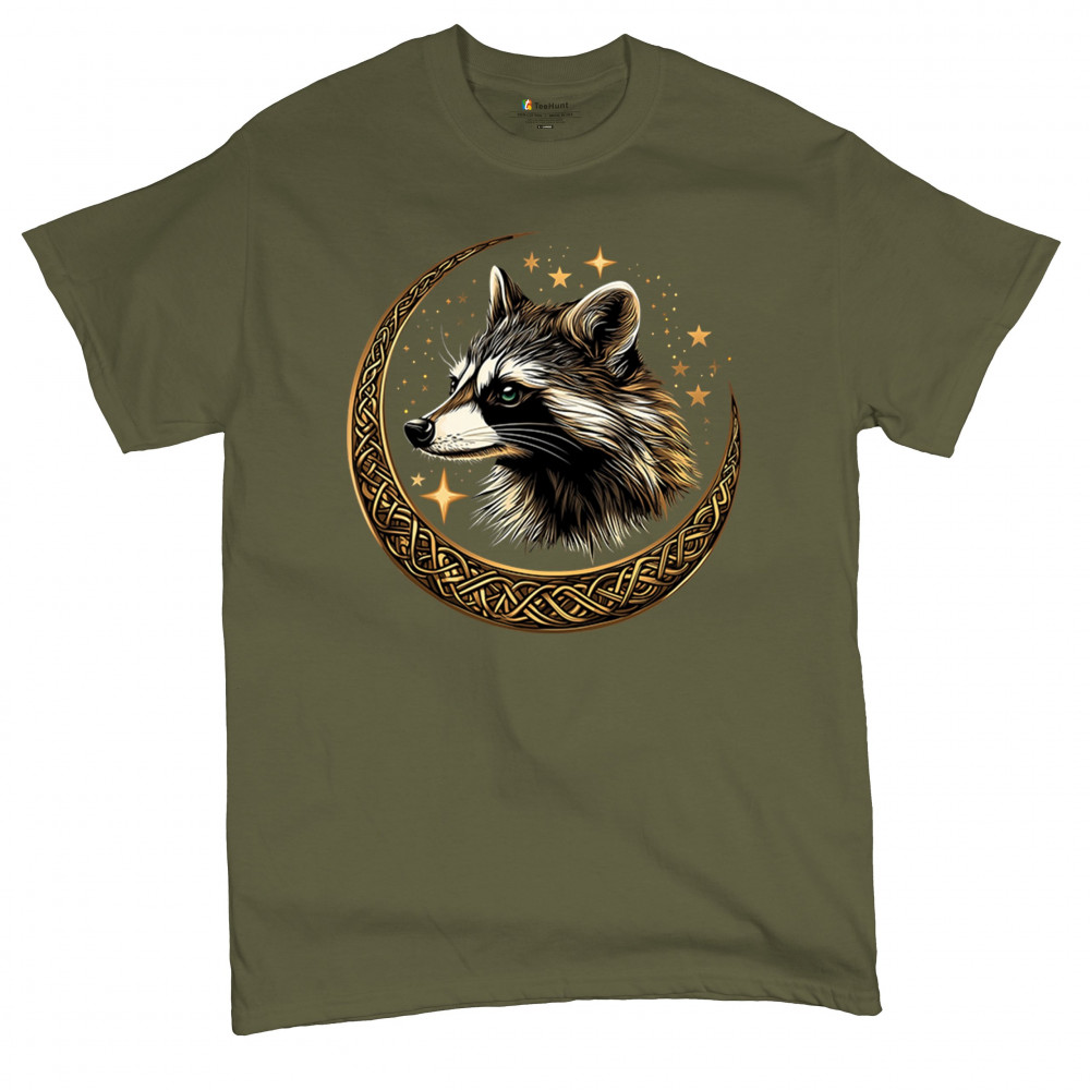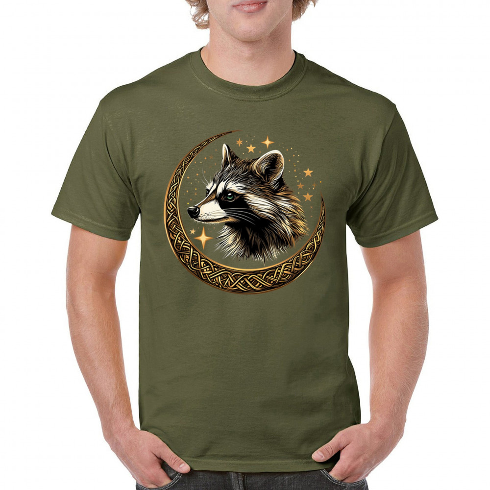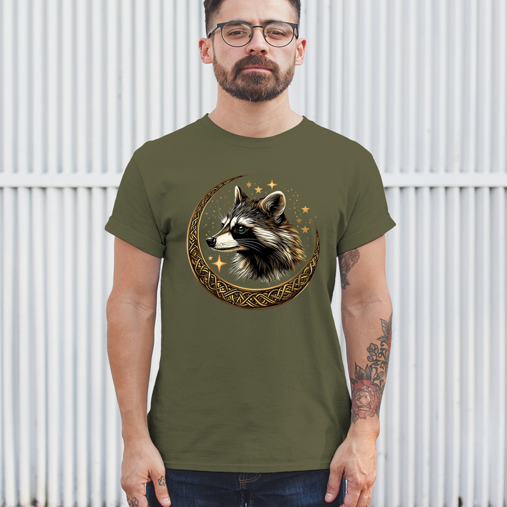 Cosmic raccoon design in Celtic moon. Symbol of adaptability, mystery, and spiritual intelligence. A perfect gift for wild and curious souls.