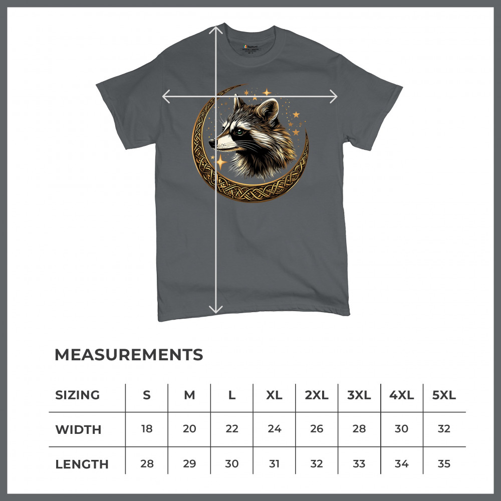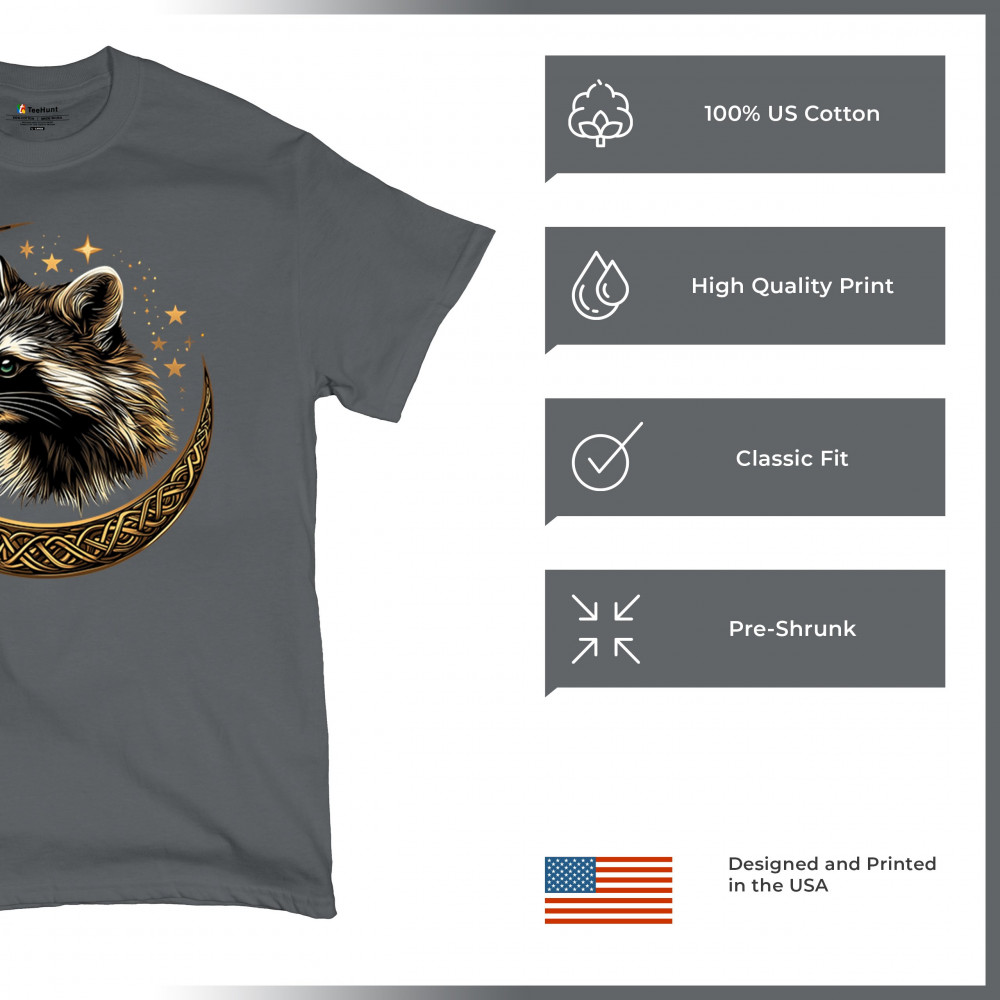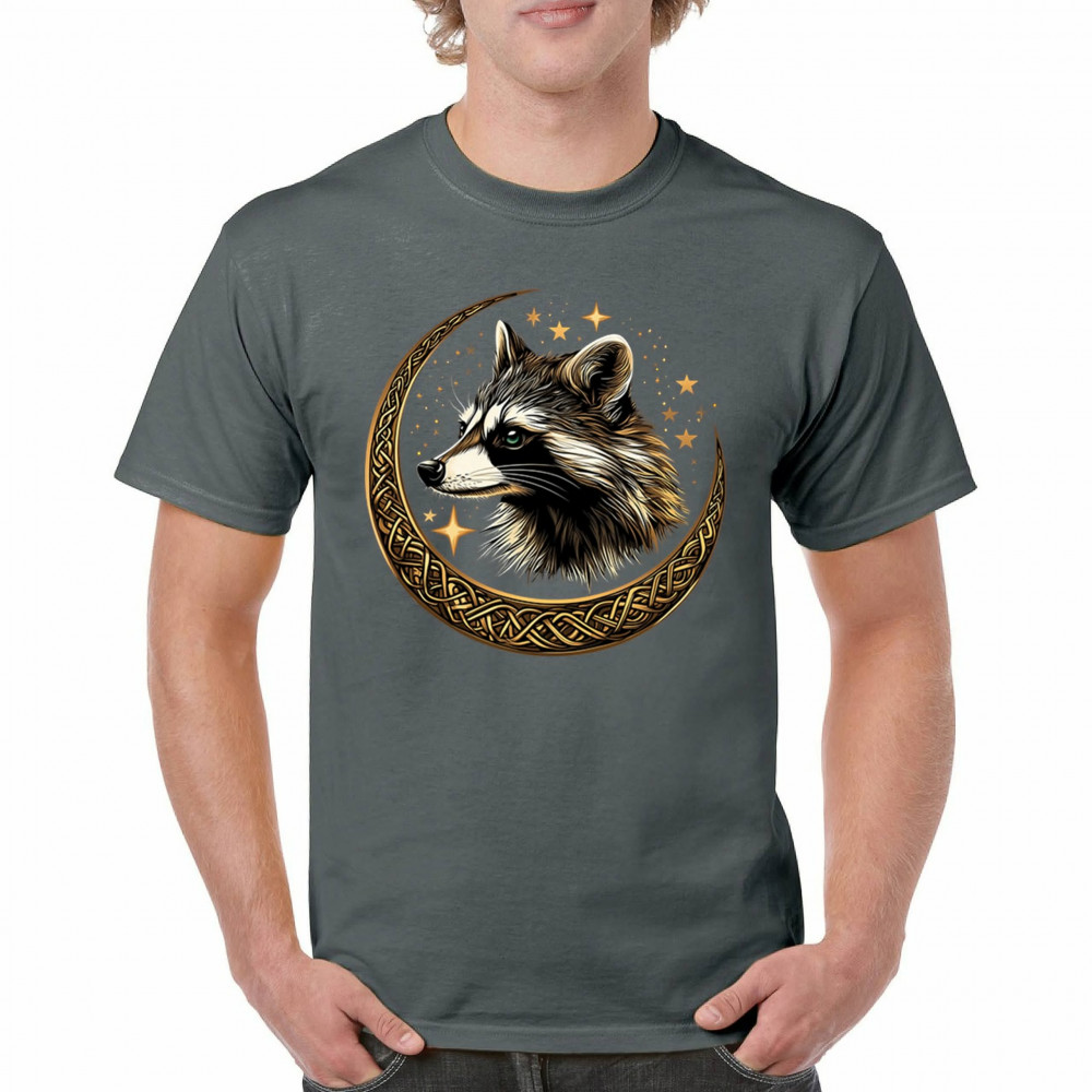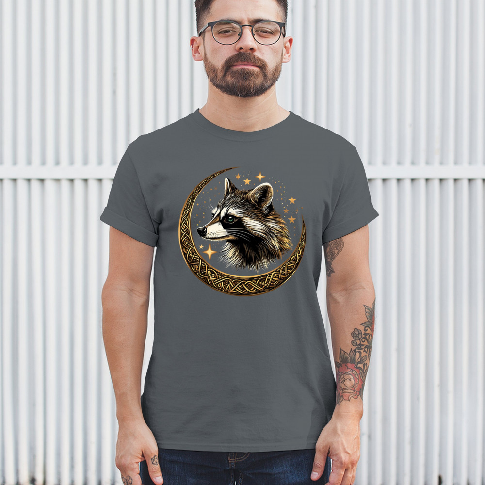 Cosmic raccoon design in Celtic moon. Symbol of adaptability, mystery, and spiritual intelligence. A perfect gift for wild and curious souls.