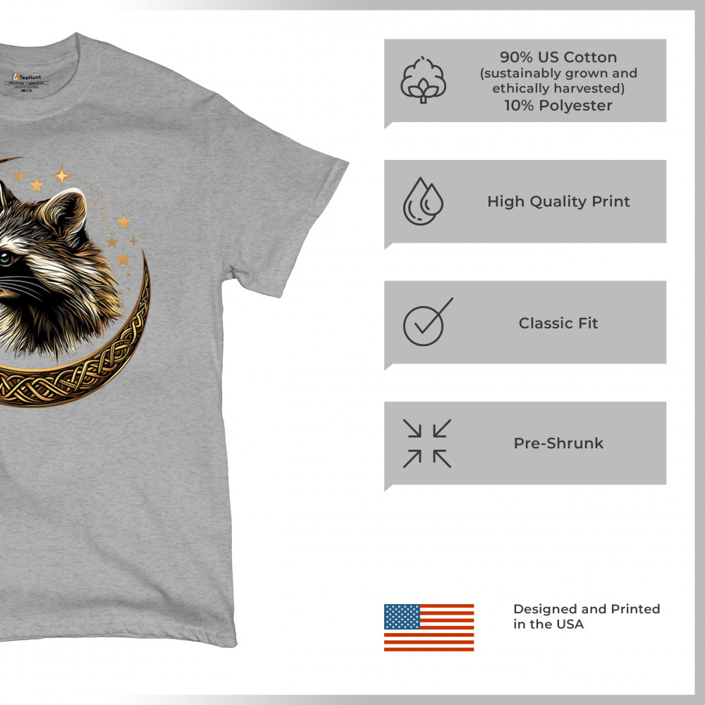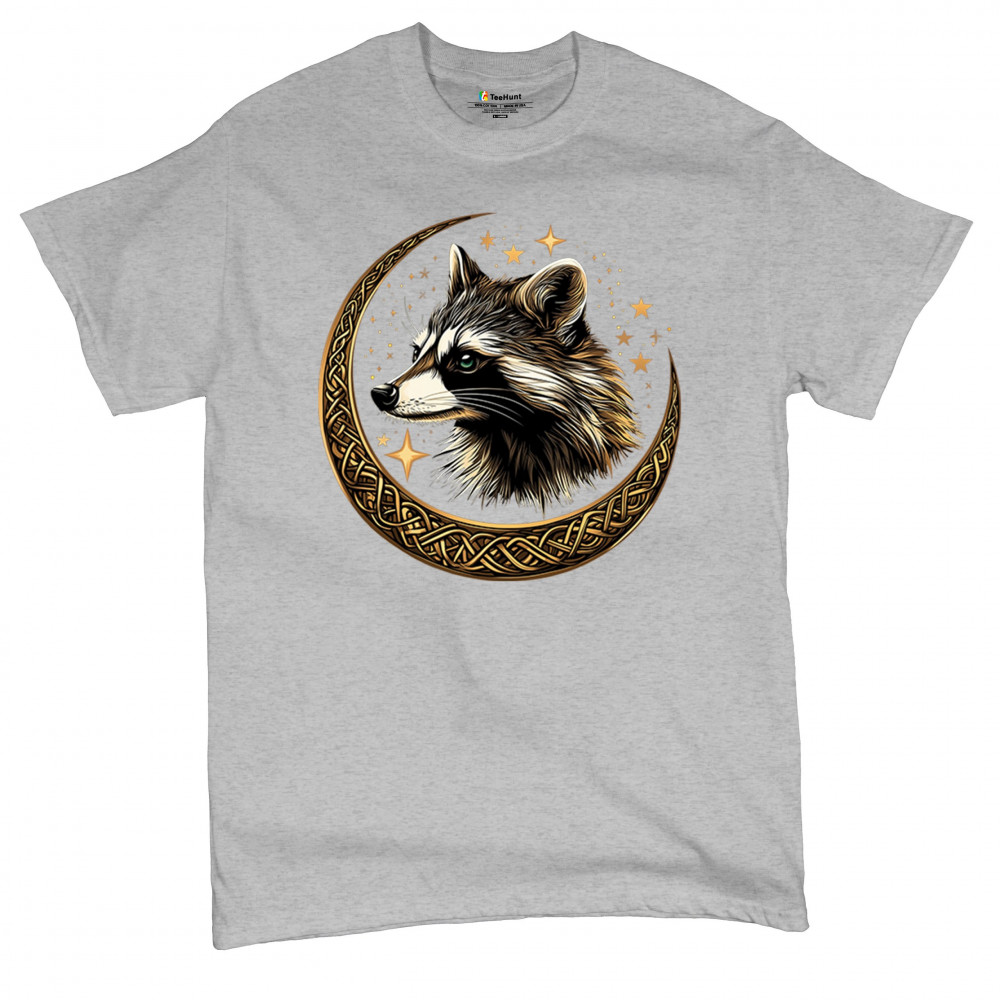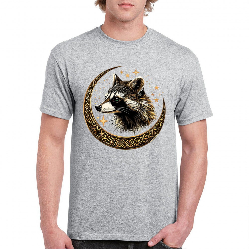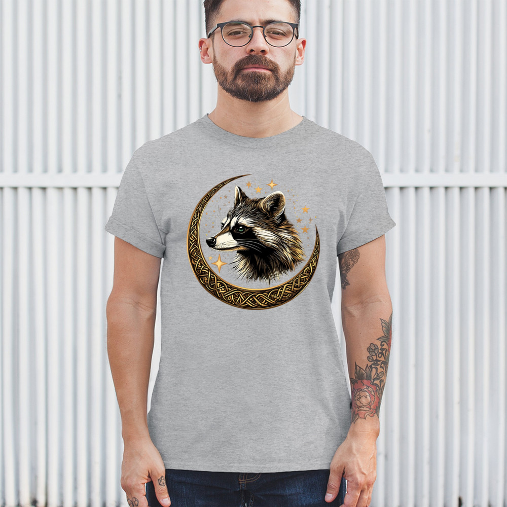 Cosmic raccoon design in Celtic moon. Symbol of adaptability, mystery, and spiritual intelligence. A perfect gift for wild and curious souls.