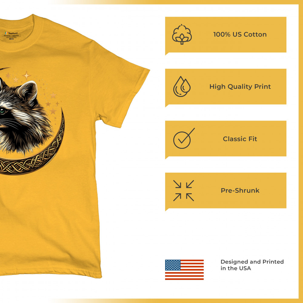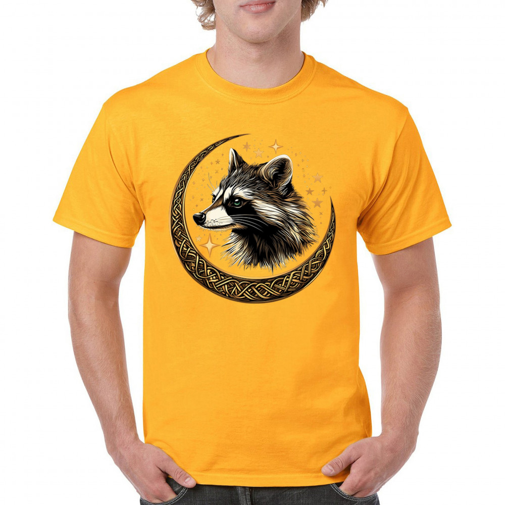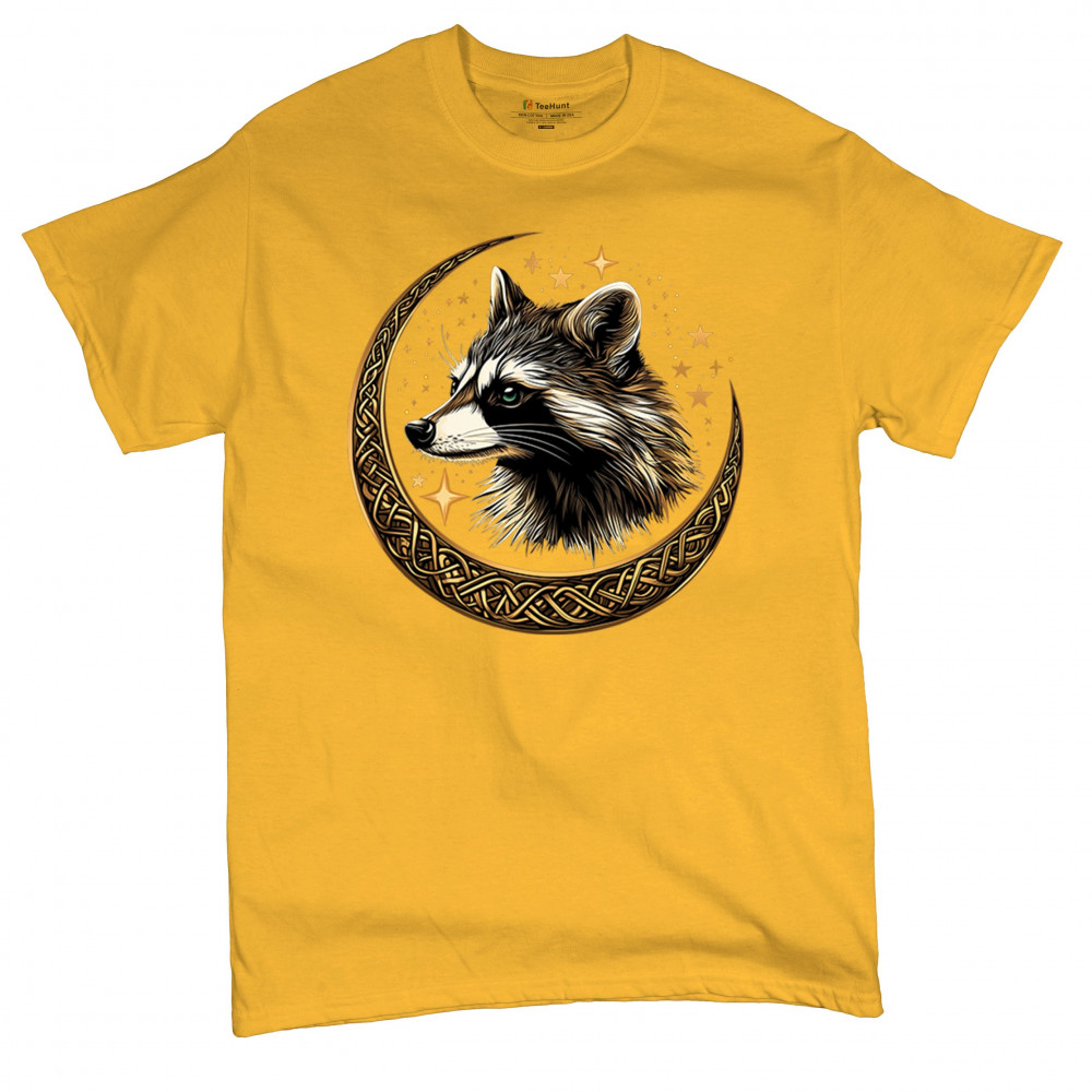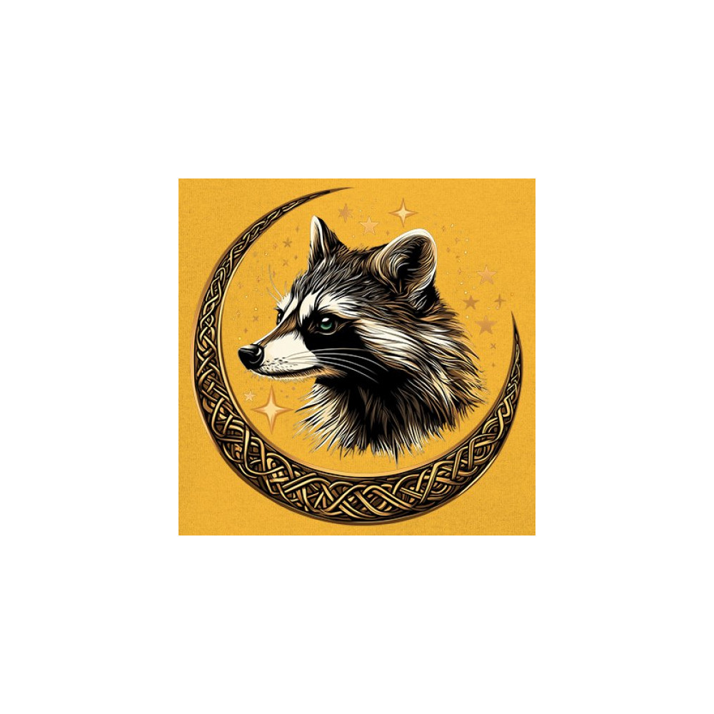 Cosmic raccoon design in Celtic moon. Symbol of adaptability, mystery, and spiritual intelligence. A perfect gift for wild and curious souls.