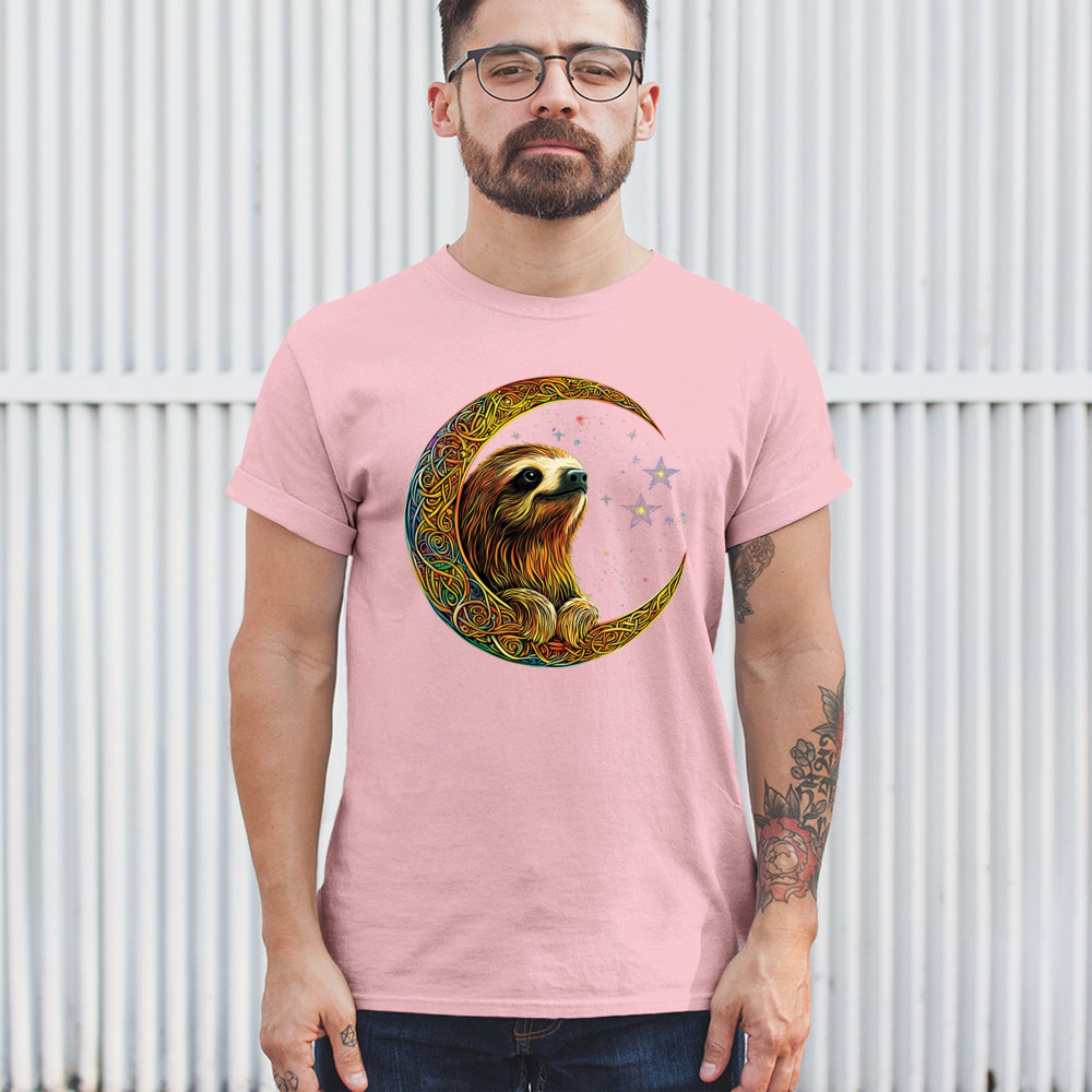 Peaceful sloth in Celtic crescent moon with cosmic sky. Symbol of mindfulness, rest, and intentional living. A calm, magical fantasy design.