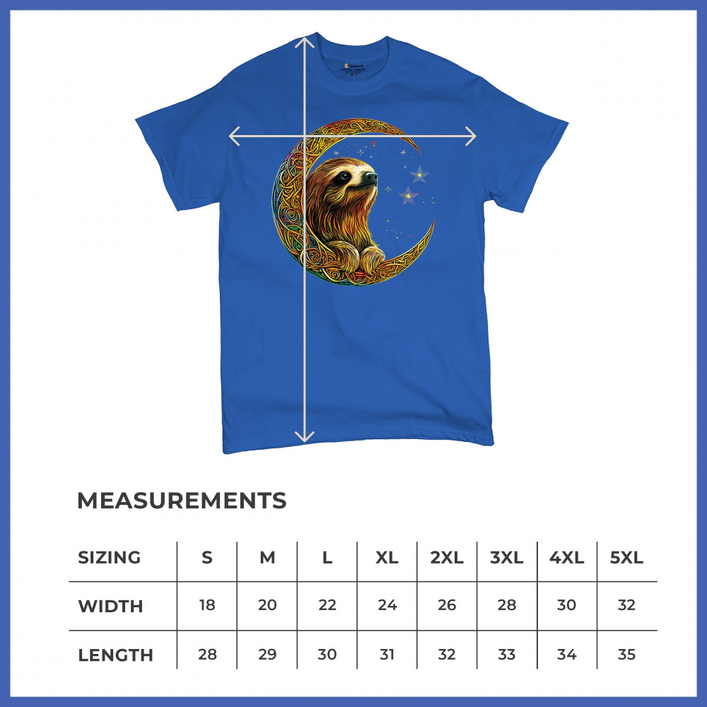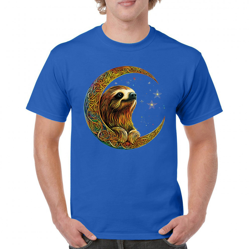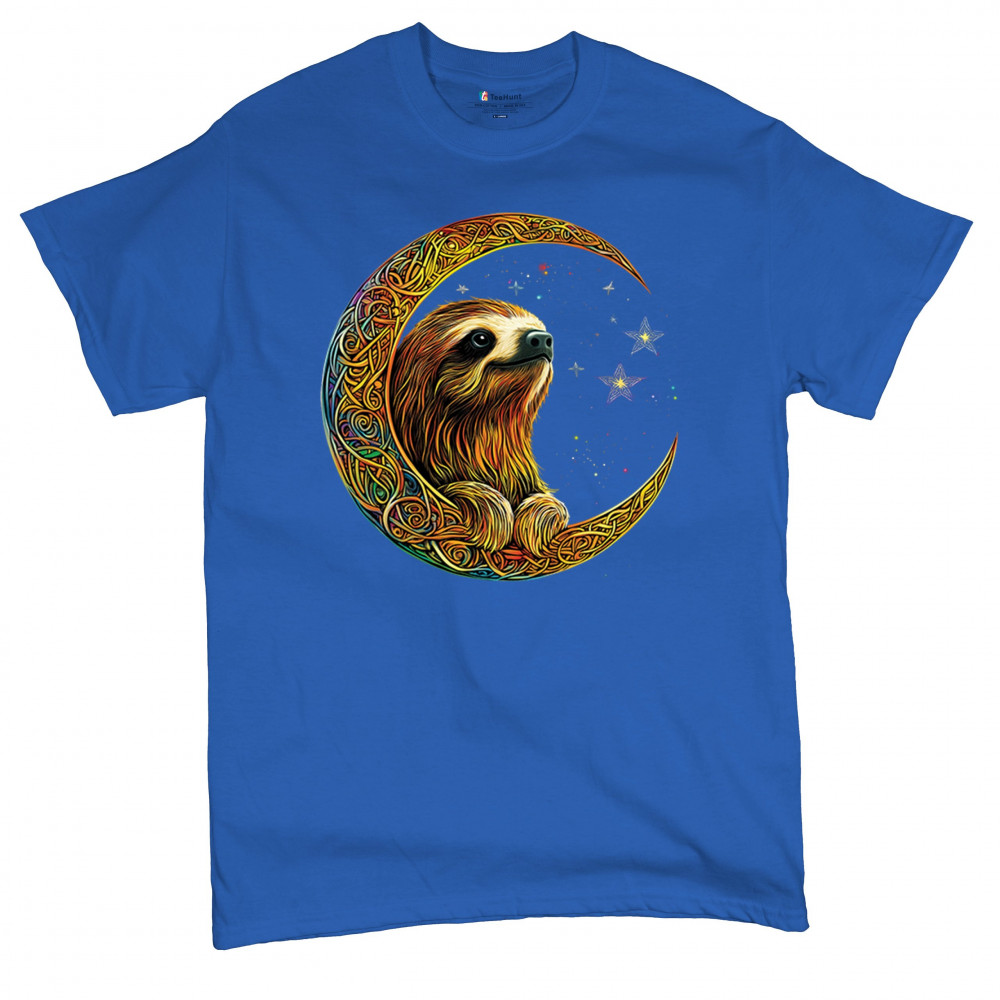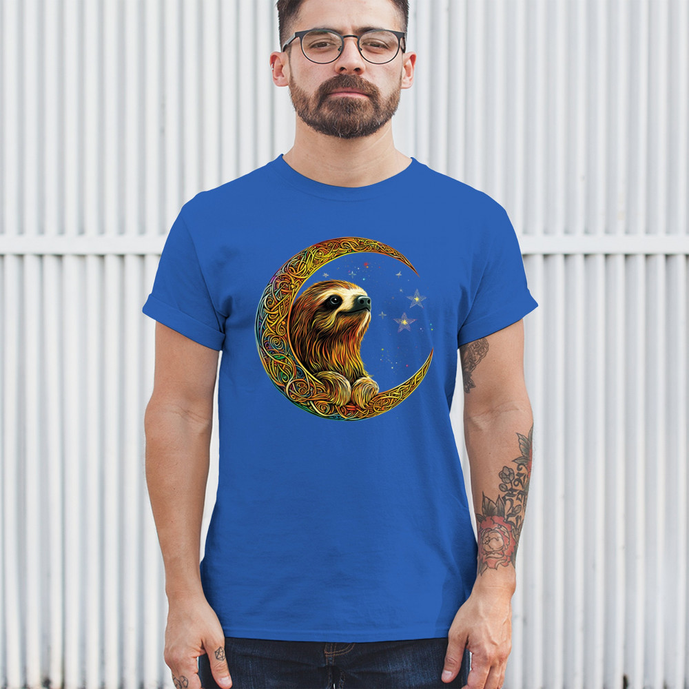 Celebrate peace and presence with this stunning sloth design cradled in a gold Celtic crescent moon. Surrounded by a vibrant starry sky, the image blends jungle whimsy with tribal patterns and mystical vibes. A perfect design for lovers of fantasy animals, mindfulness, and slow living. A beautiful tribute to spiritual stillness and cosmic calm.