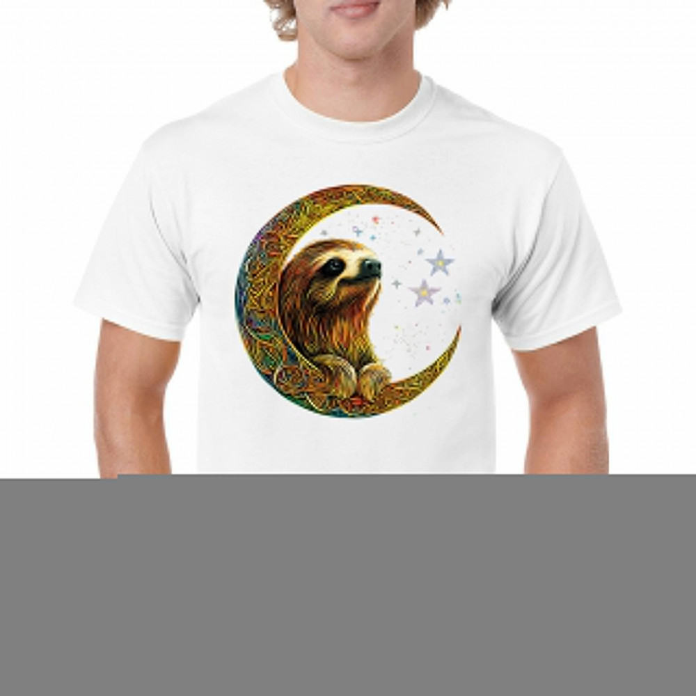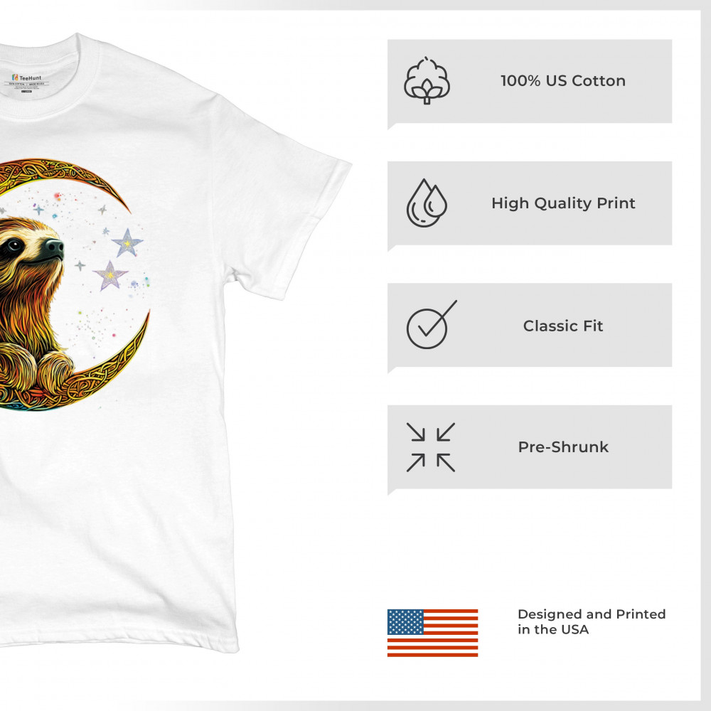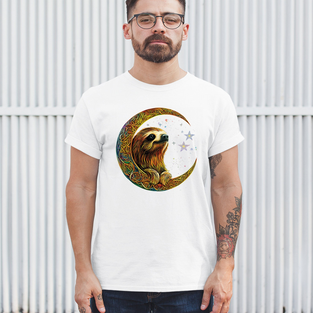 Celebrate peace and presence with this stunning sloth design cradled in a gold Celtic crescent moon. Surrounded by a vibrant starry sky, the image blends jungle whimsy with tribal patterns and mystical vibes. A perfect design for lovers of fantasy animals, mindfulness, and slow living. A beautiful tribute to spiritual stillness and cosmic calm.