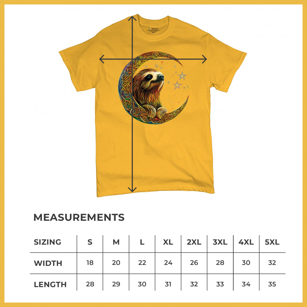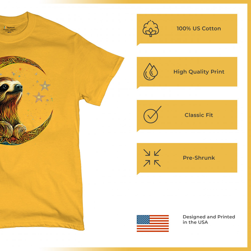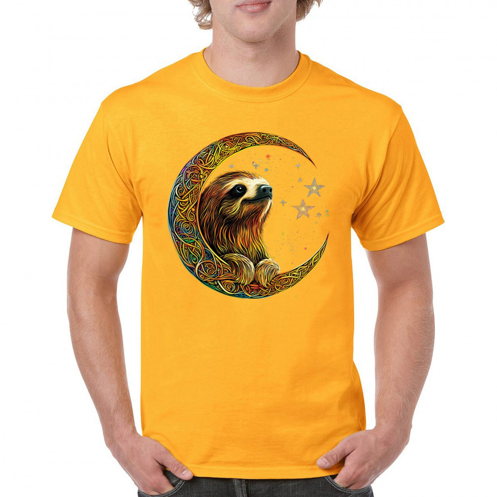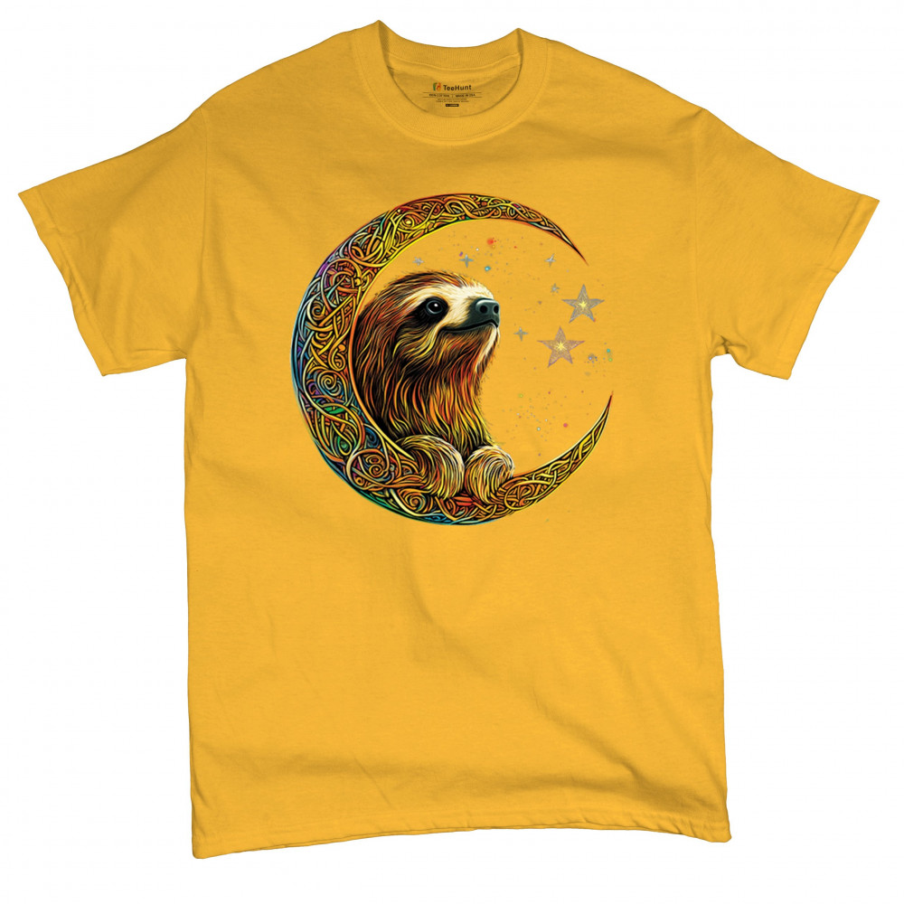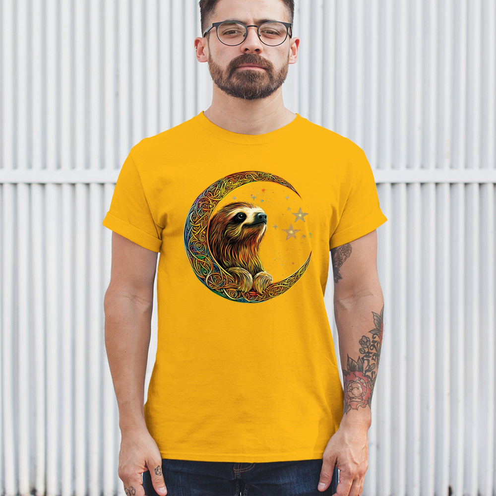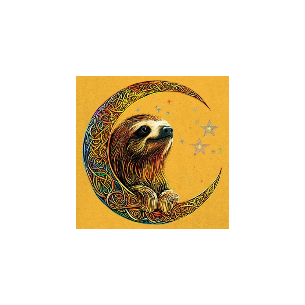 Celebrate peace and presence with this stunning sloth design cradled in a gold Celtic crescent moon. Surrounded by a vibrant starry sky, the image blends jungle whimsy with tribal patterns and mystical vibes. A perfect design for lovers of fantasy animals, mindfulness, and slow living. A beautiful tribute to spiritual stillness and cosmic calm.