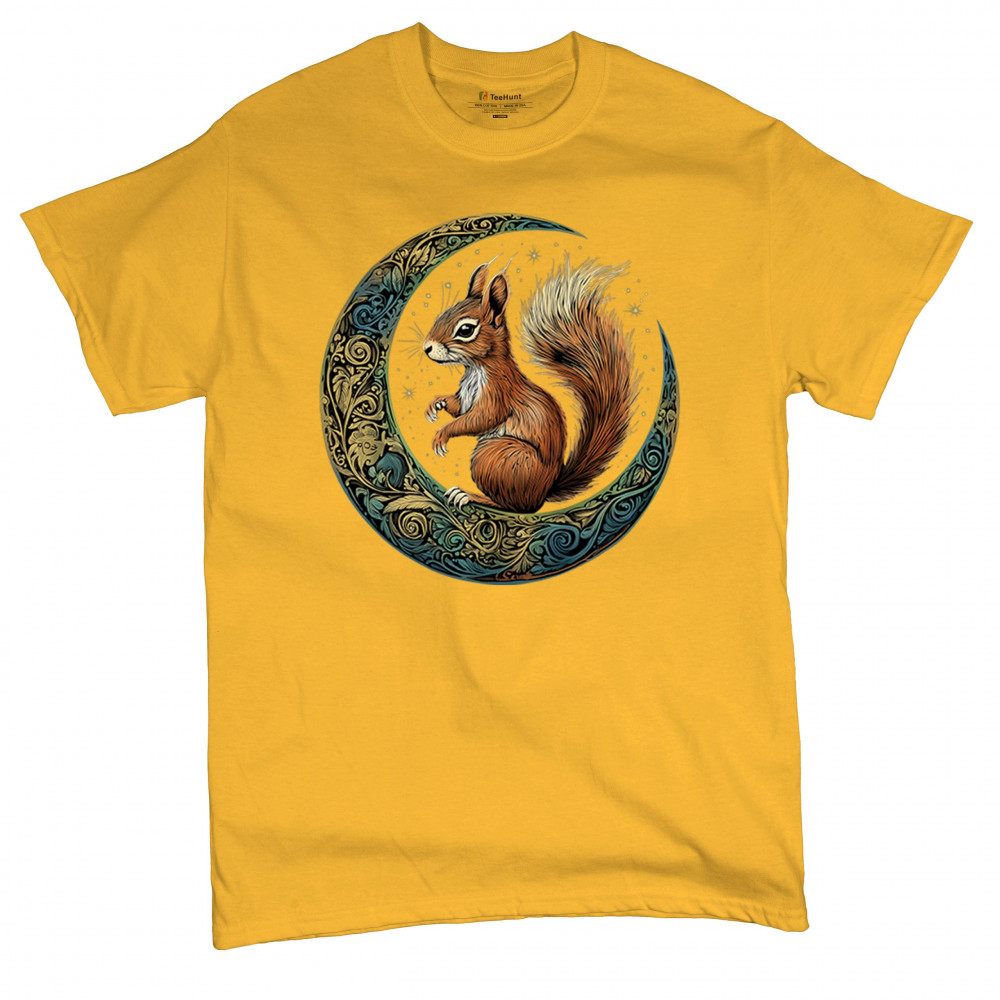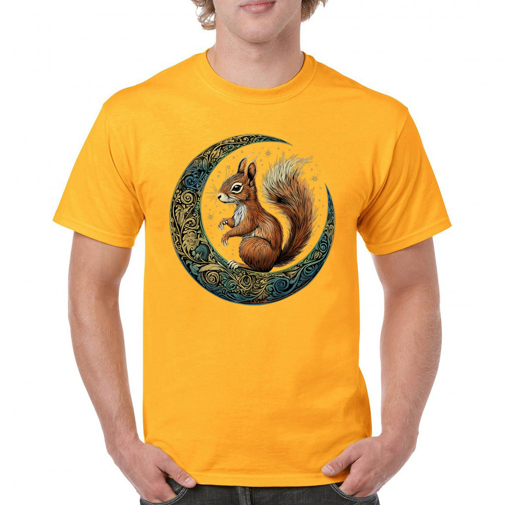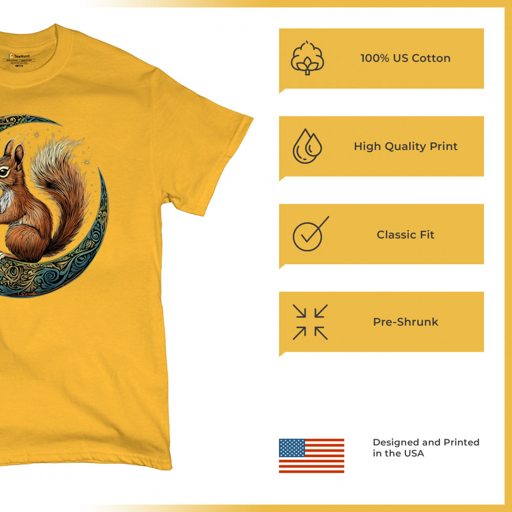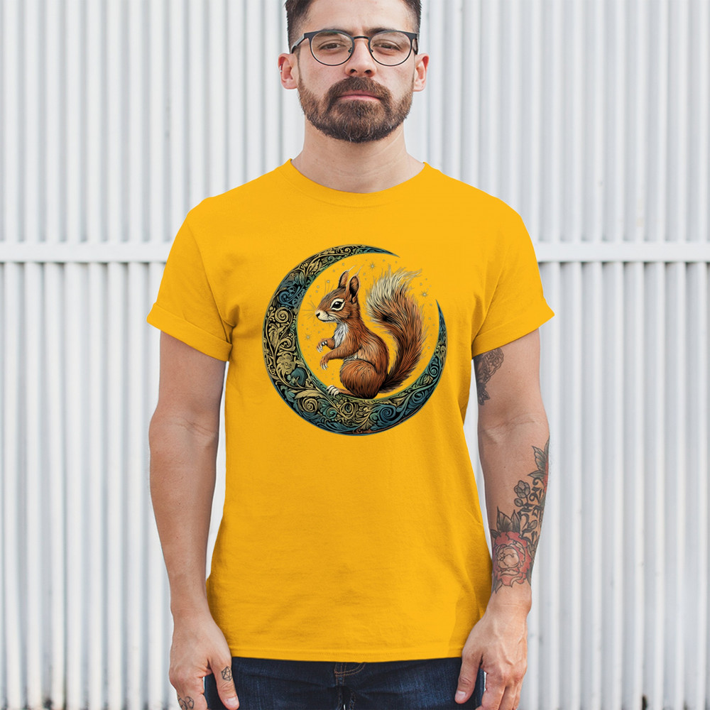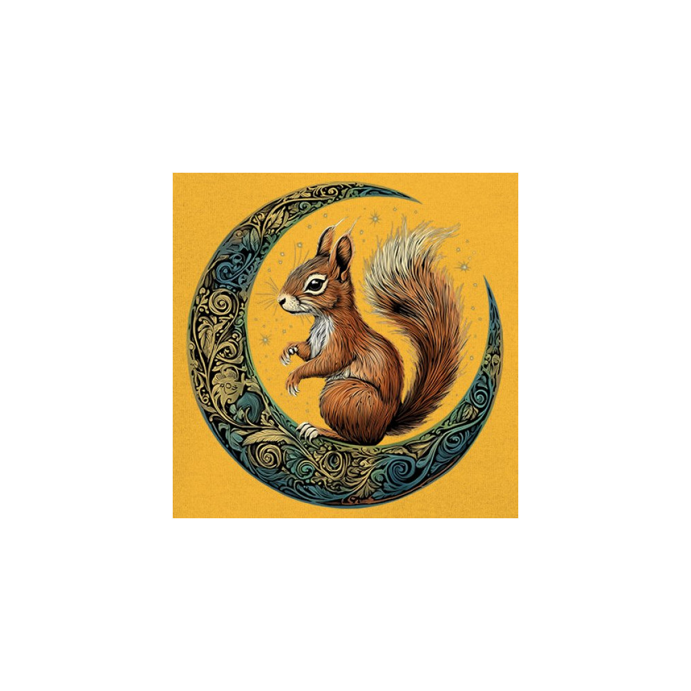 Celebrate agility, awareness, and forest wisdom with this magical red squirrel design. Nestled in a green-gold Celtic crescent moon and backed by a starry cosmic sky, this piece merges natural energy with tribal patterns and celestial wonder. A unique design for animal spirit believers, forest wanderers, and fantasy nature fans.