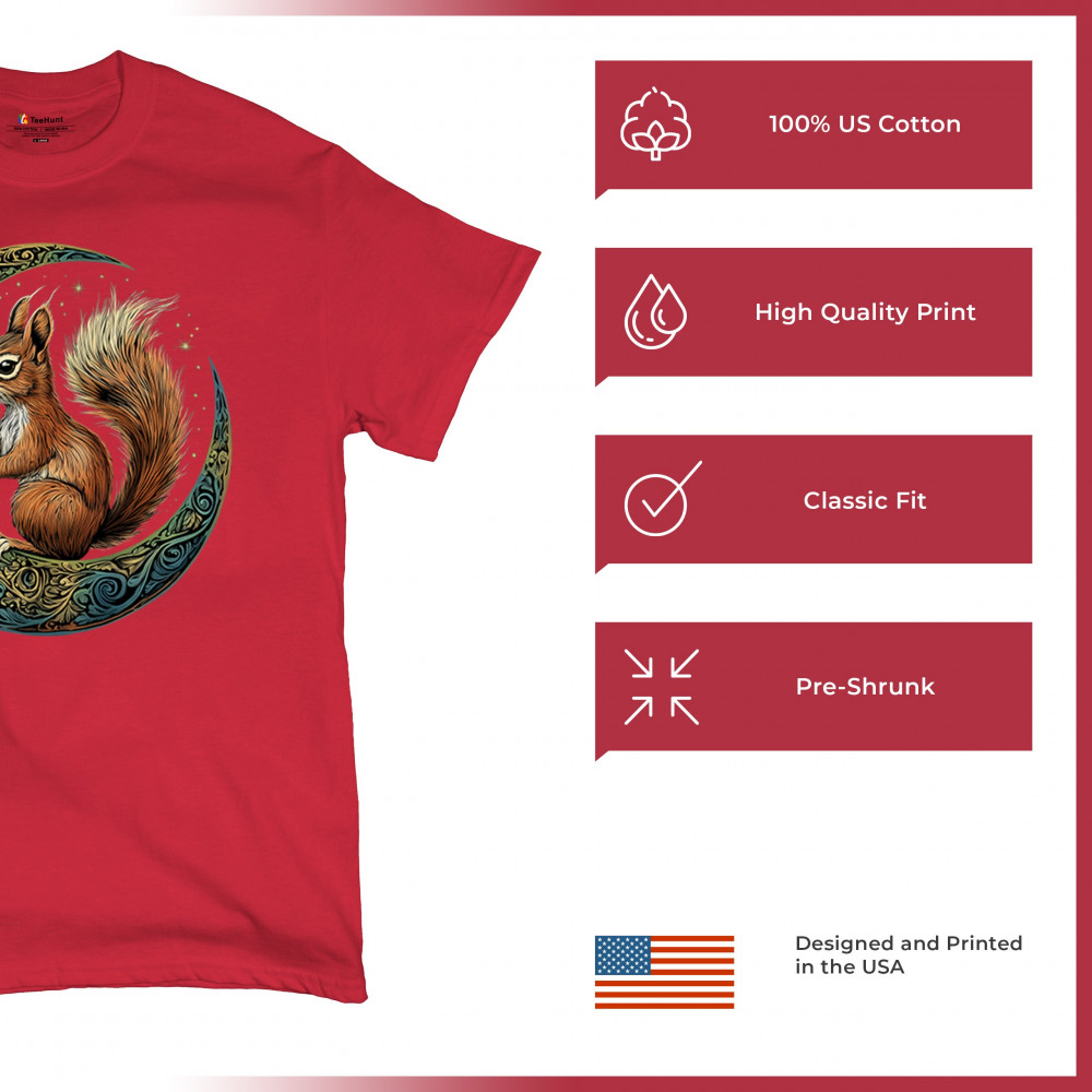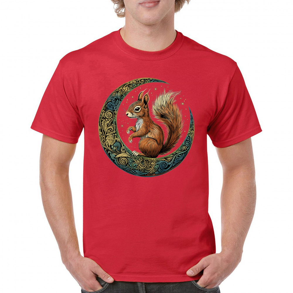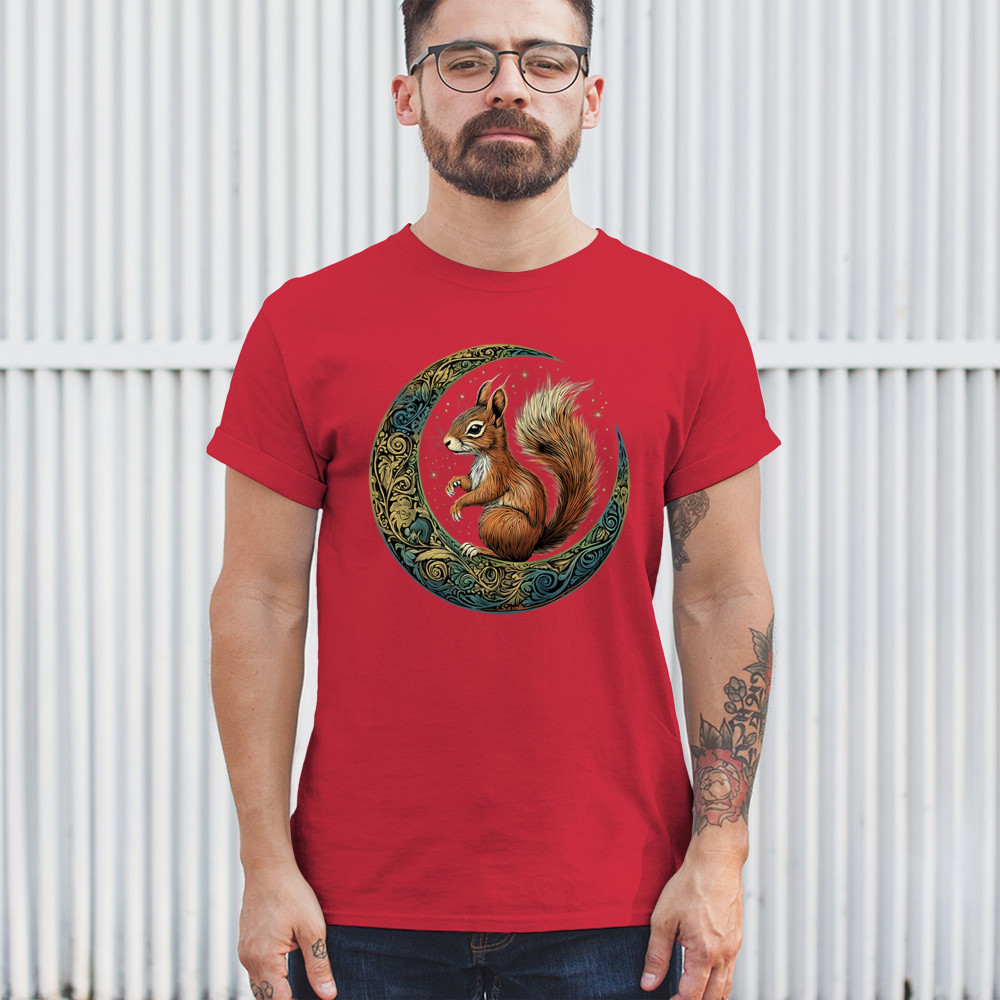 Celebrate agility, awareness, and forest wisdom with this magical red squirrel design. Nestled in a green-gold Celtic crescent moon and backed by a starry cosmic sky, this piece merges natural energy with tribal patterns and celestial wonder. A unique design for animal spirit believers, forest wanderers, and fantasy nature fans.