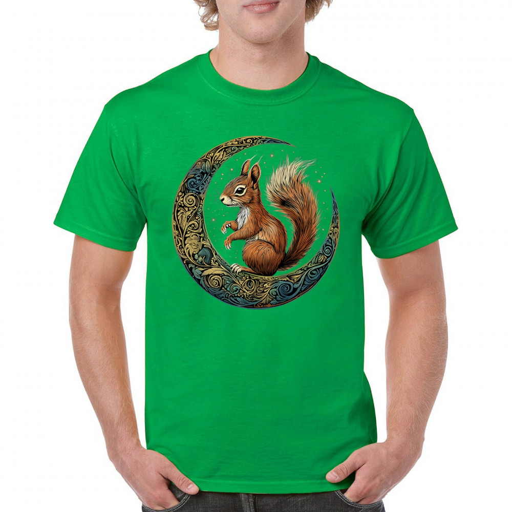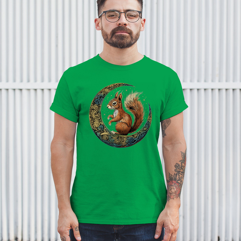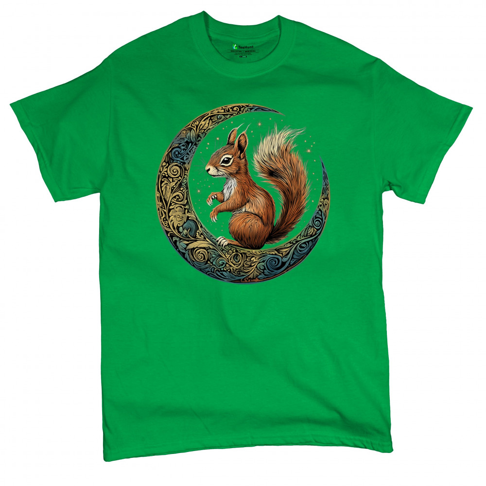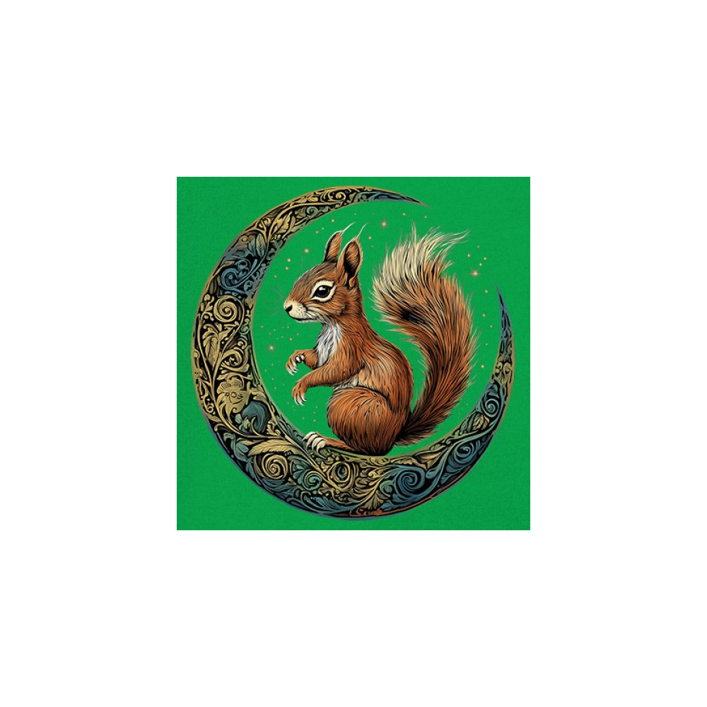 Celebrate agility, awareness, and forest wisdom with this magical red squirrel design. Nestled in a green-gold Celtic crescent moon and backed by a starry cosmic sky, this piece merges natural energy with tribal patterns and celestial wonder. A unique design for animal spirit believers, forest wanderers, and fantasy nature fans.