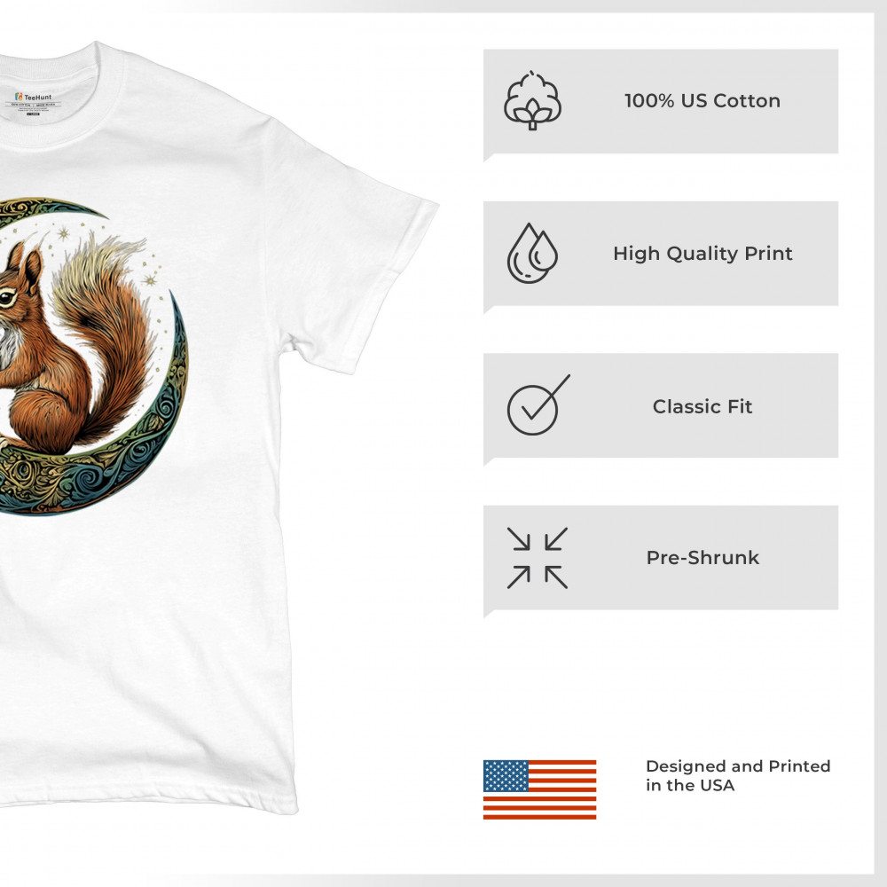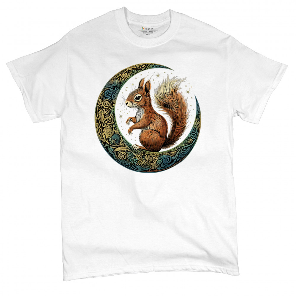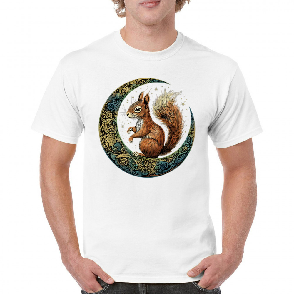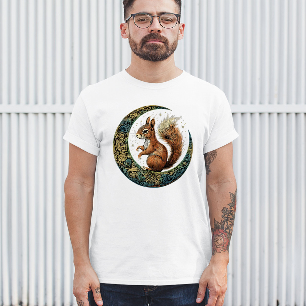 Celebrate agility, awareness, and forest wisdom with this magical red squirrel design. Nestled in a green-gold Celtic crescent moon and backed by a starry cosmic sky, this piece merges natural energy with tribal patterns and celestial wonder. A unique design for animal spirit believers, forest wanderers, and fantasy nature fans.