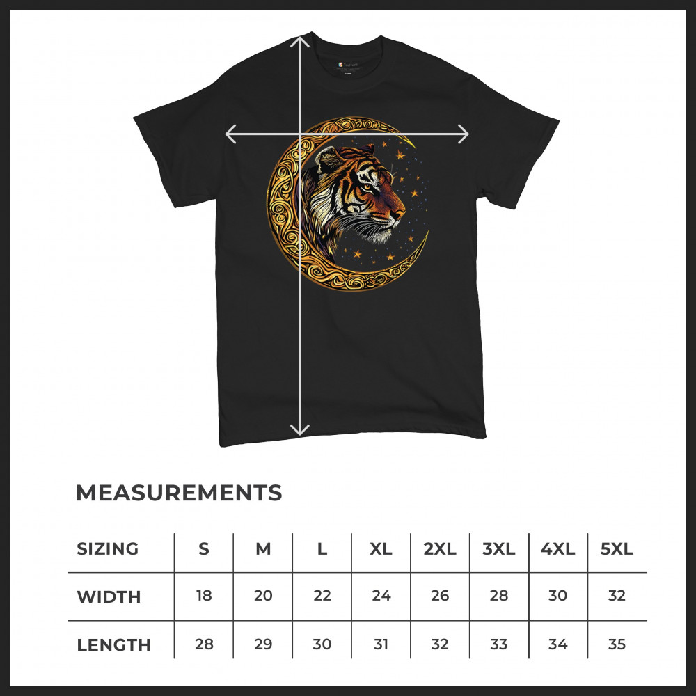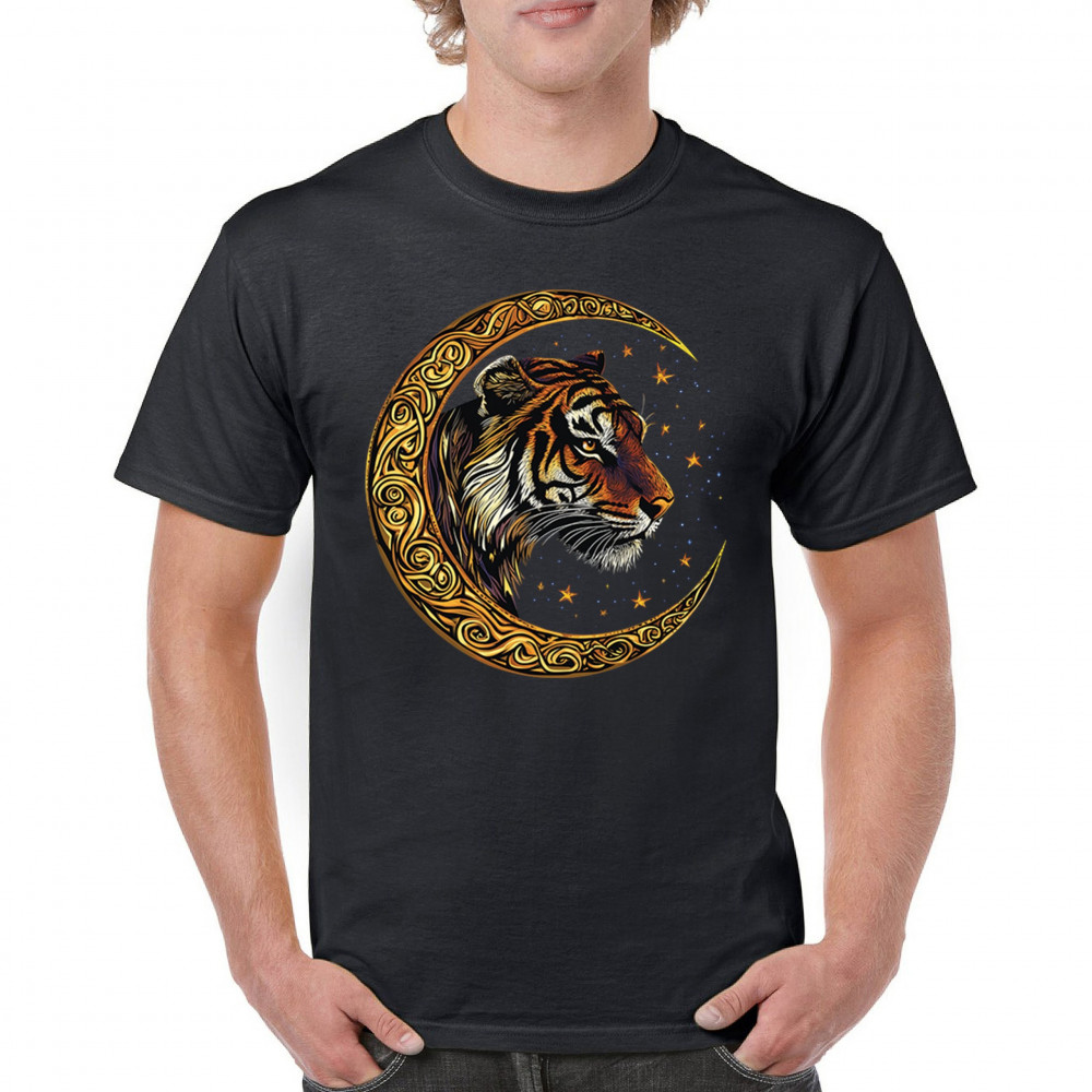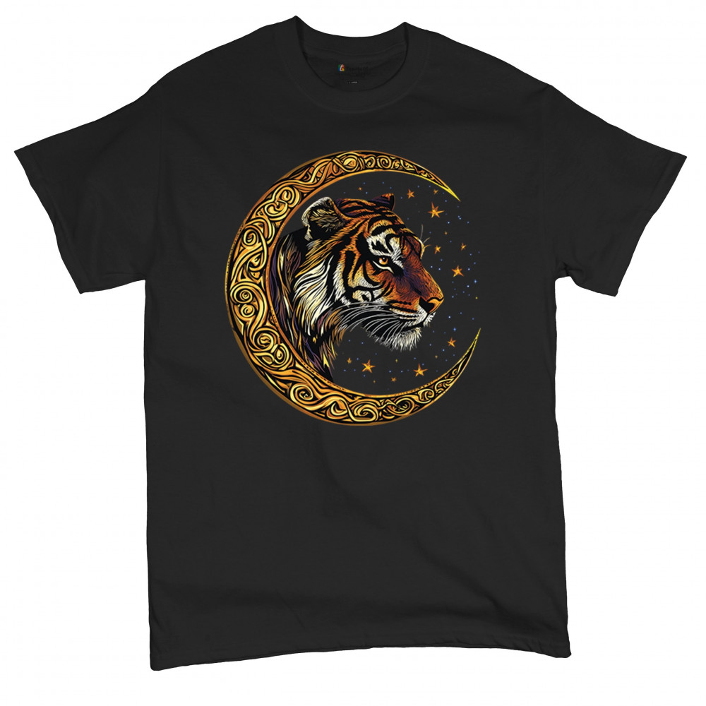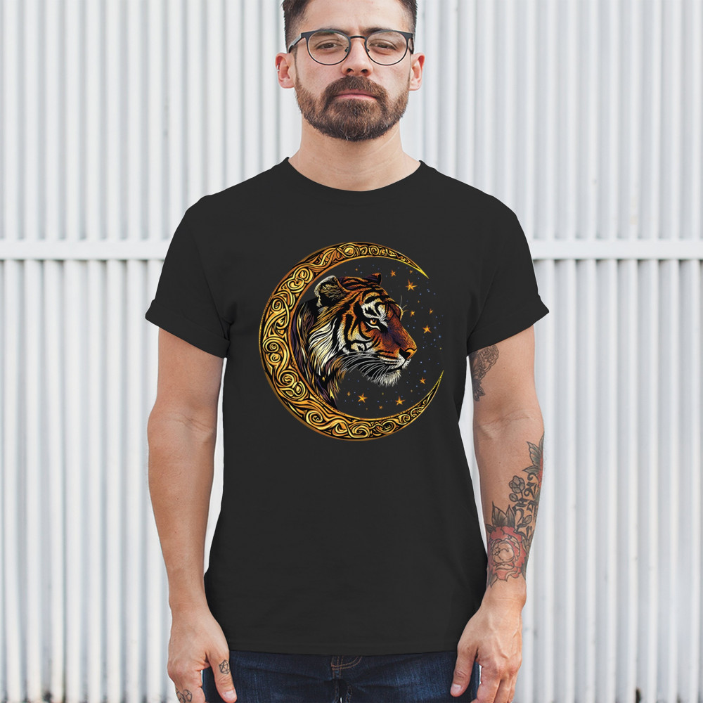 Bold tiger design in Celtic moon with cosmic sky. Symbol of strength, instinct, and jungle mysticism. Great for animal lovers and fantasy fans.