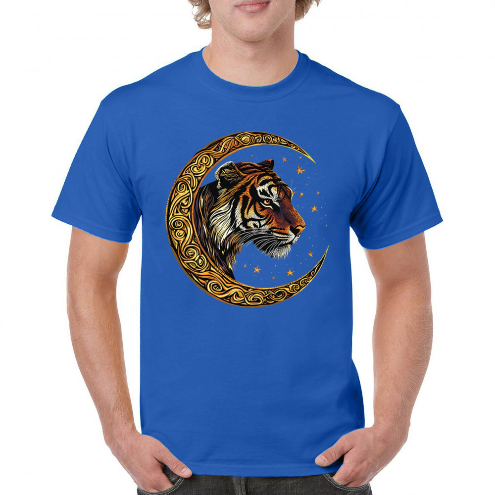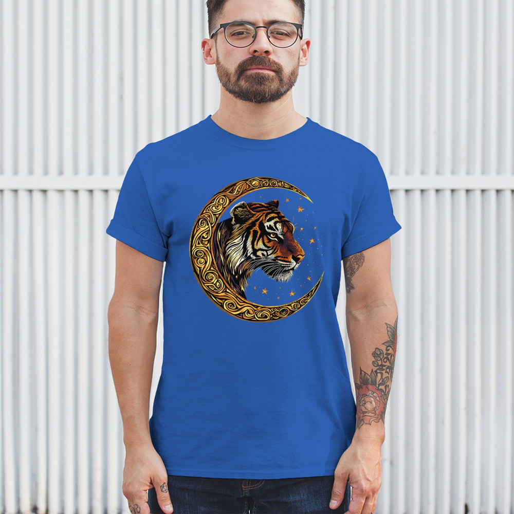 Bold tiger design in Celtic moon with cosmic sky. Symbol of strength, instinct, and jungle mysticism. Great for animal lovers and fantasy fans.