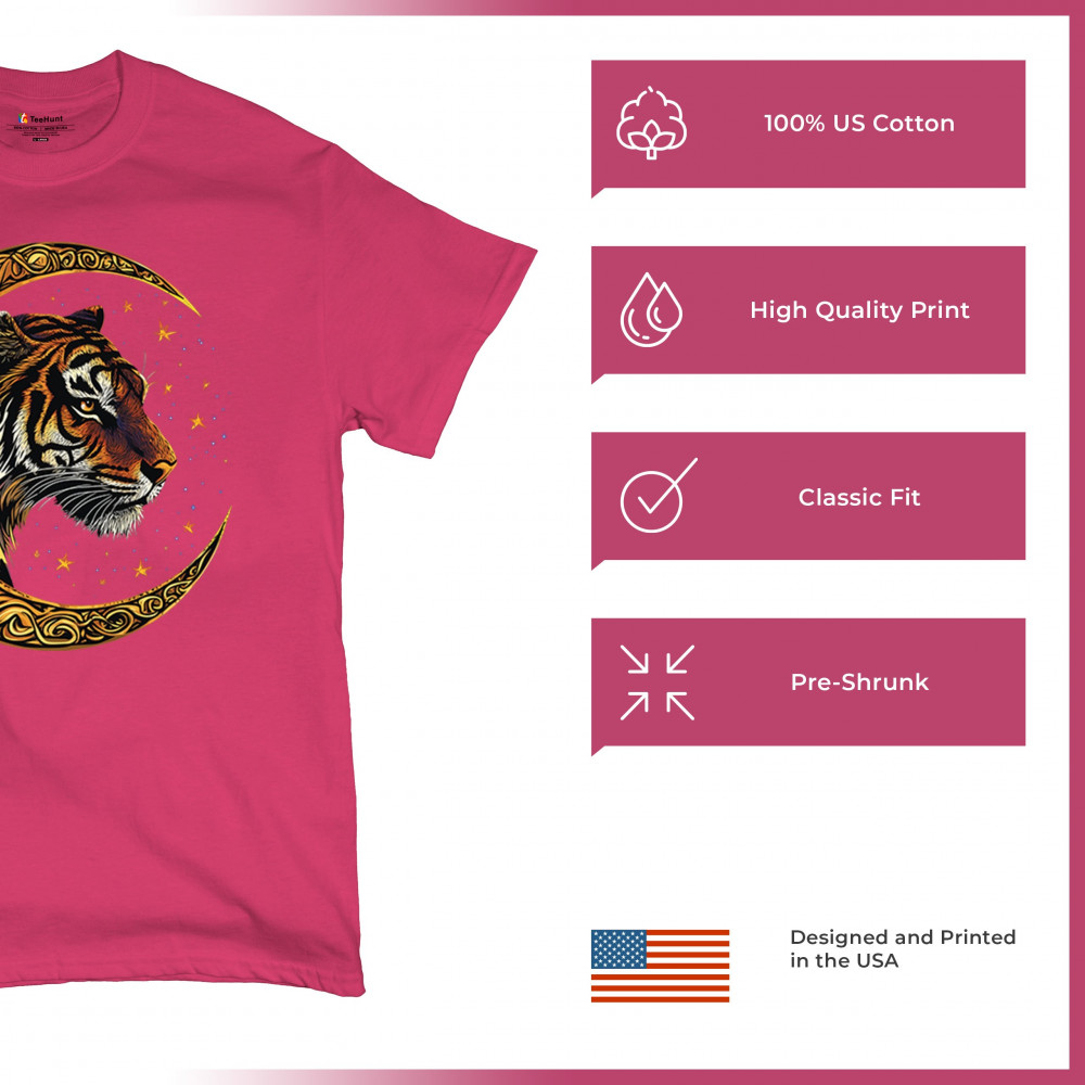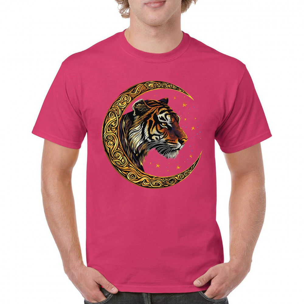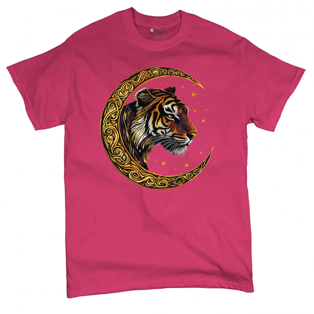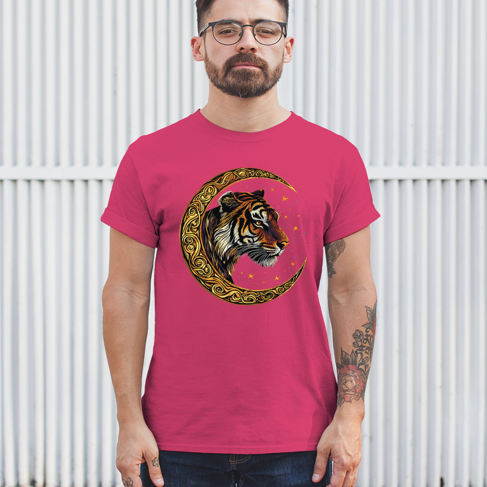 Bold tiger design in Celtic moon with cosmic sky. Symbol of strength, instinct, and jungle mysticism. Great for animal lovers and fantasy fans.