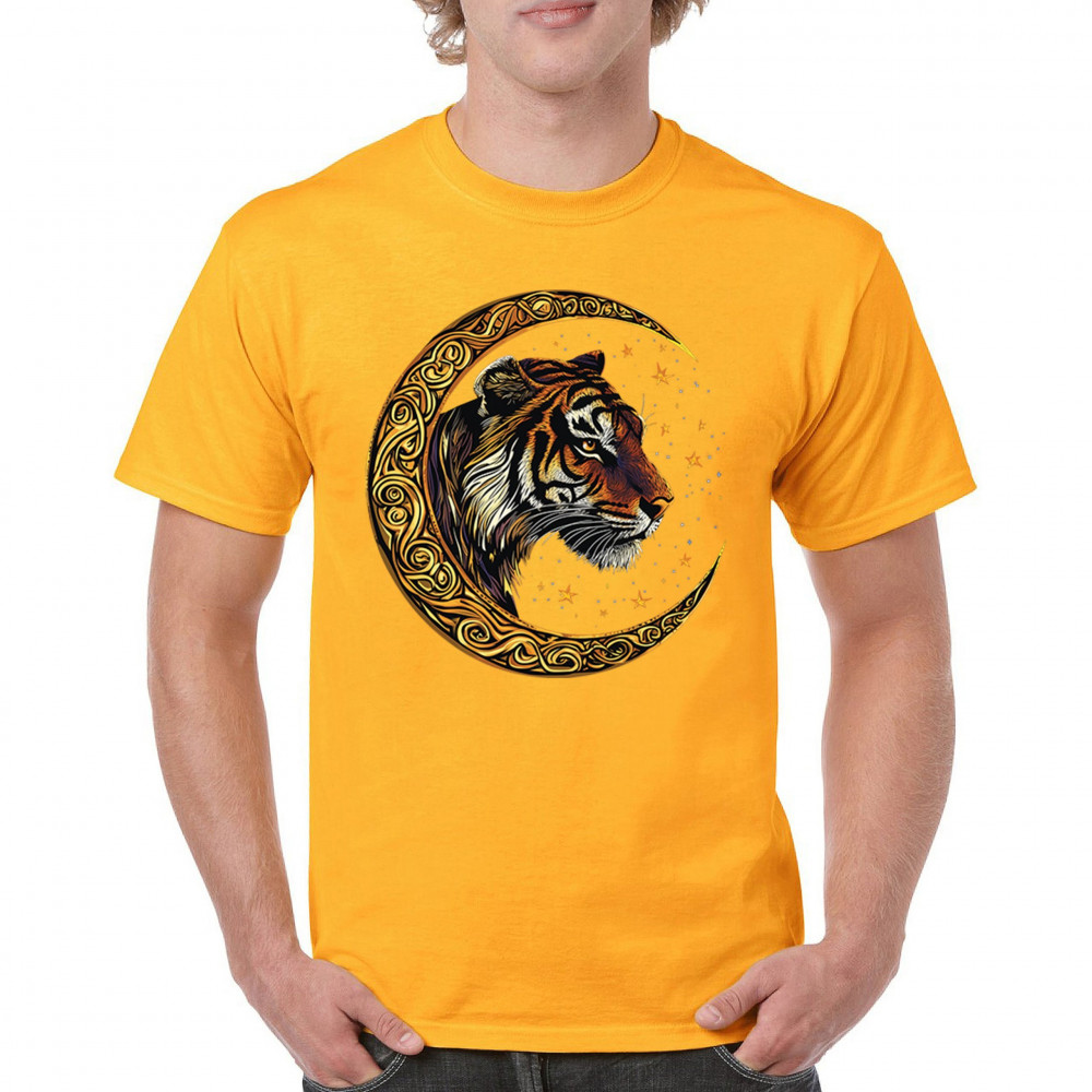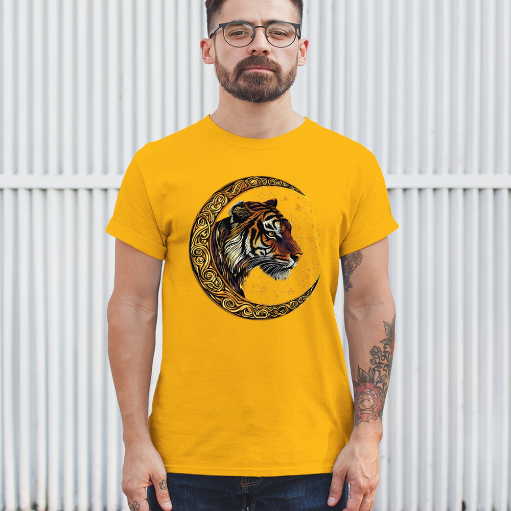 Bold tiger design in Celtic moon with cosmic sky. Symbol of strength, instinct, and jungle mysticism. Great for animal lovers and fantasy fans.