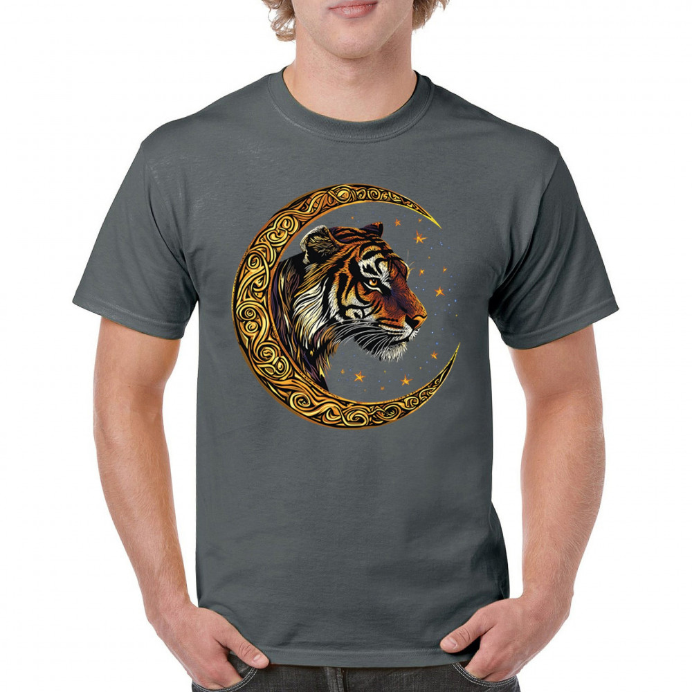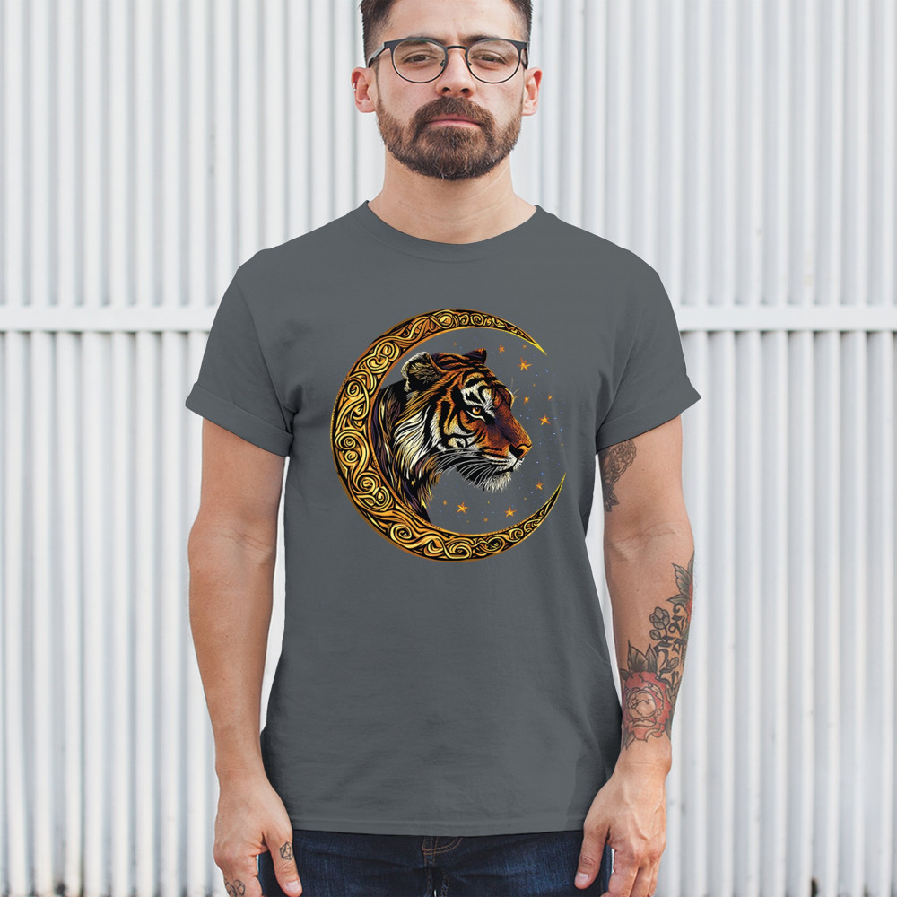 Bold tiger design in Celtic moon with cosmic sky. Symbol of strength, instinct, and jungle mysticism. Great for animal lovers and fantasy fans.