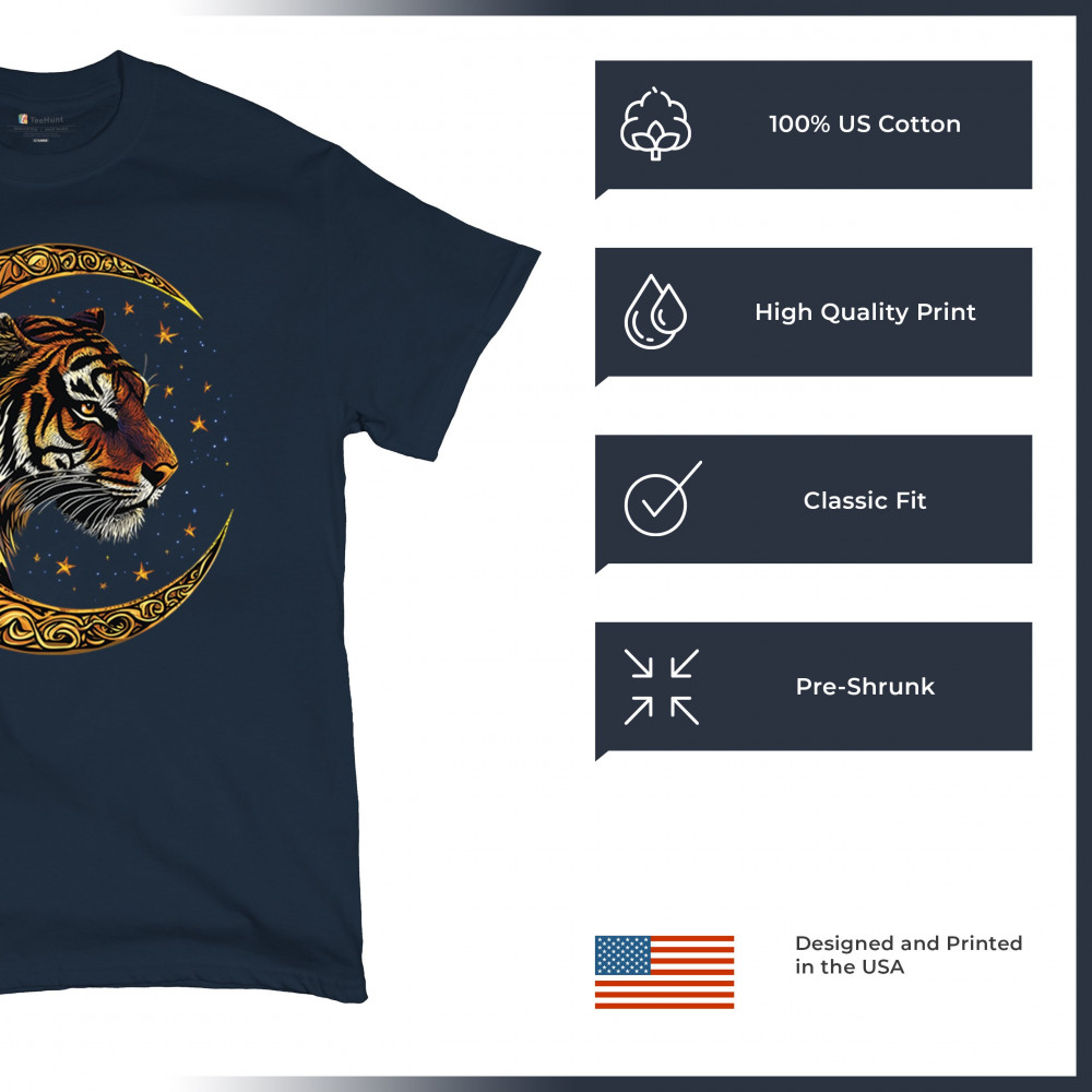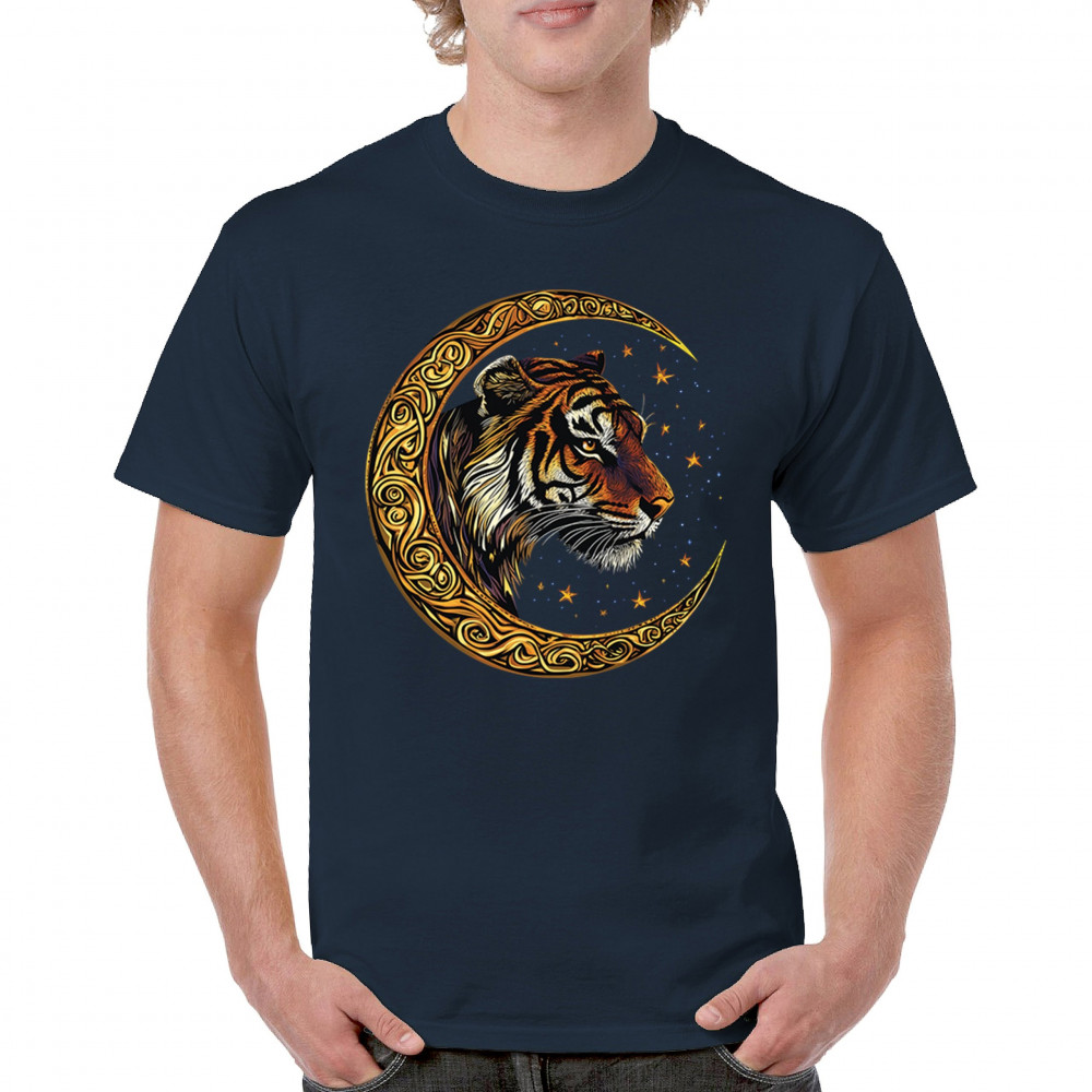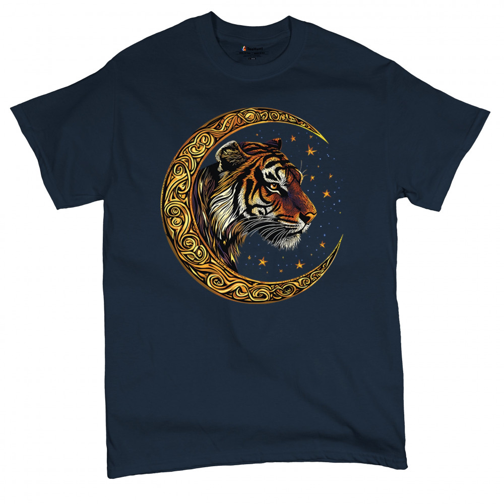 Bold tiger design in Celtic moon with cosmic sky. Symbol of strength, instinct, and jungle mysticism. Great for animal lovers and fantasy fans.