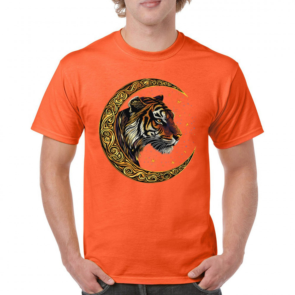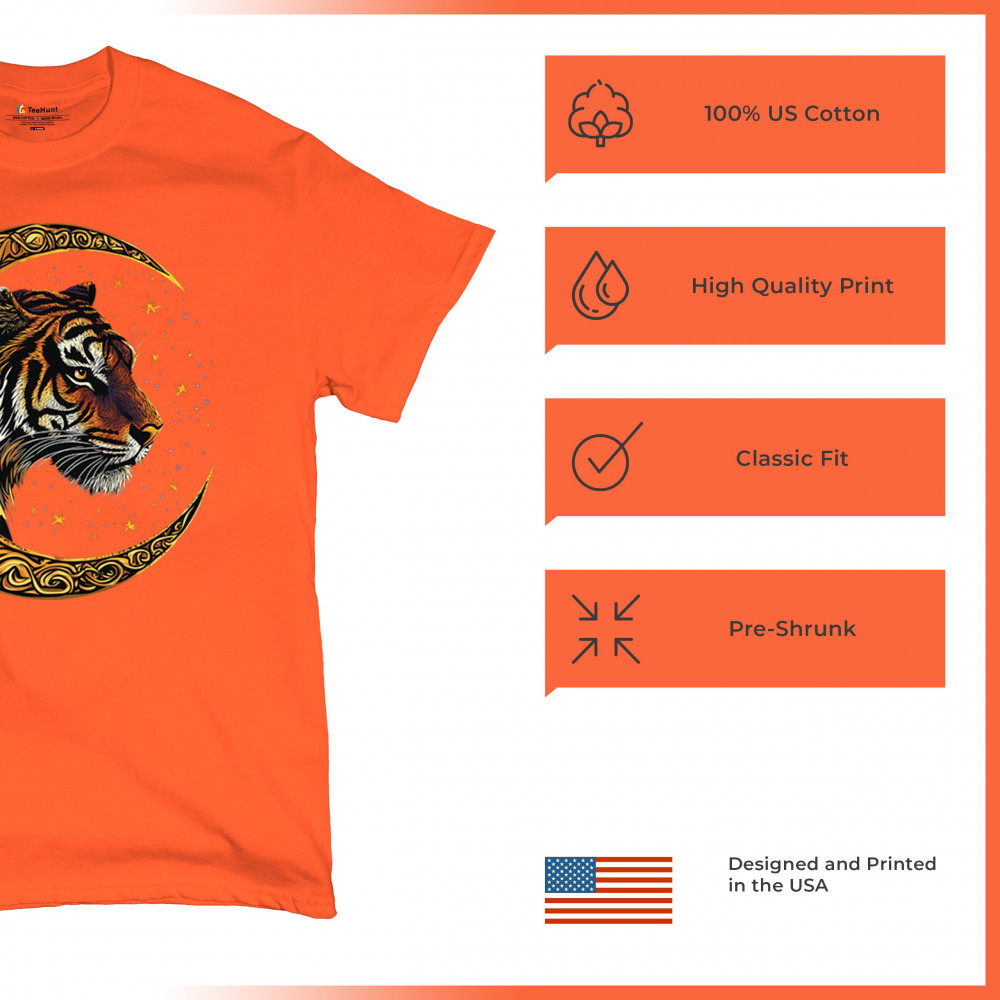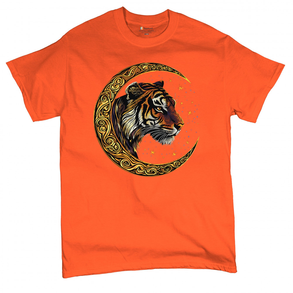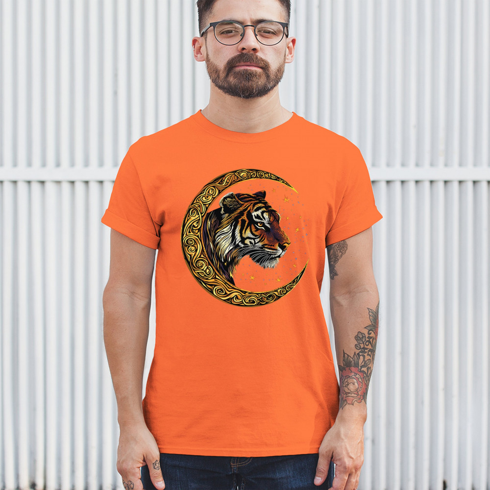 Bold tiger design in Celtic moon with cosmic sky. Symbol of strength, instinct, and jungle mysticism. Great for animal lovers and fantasy fans.