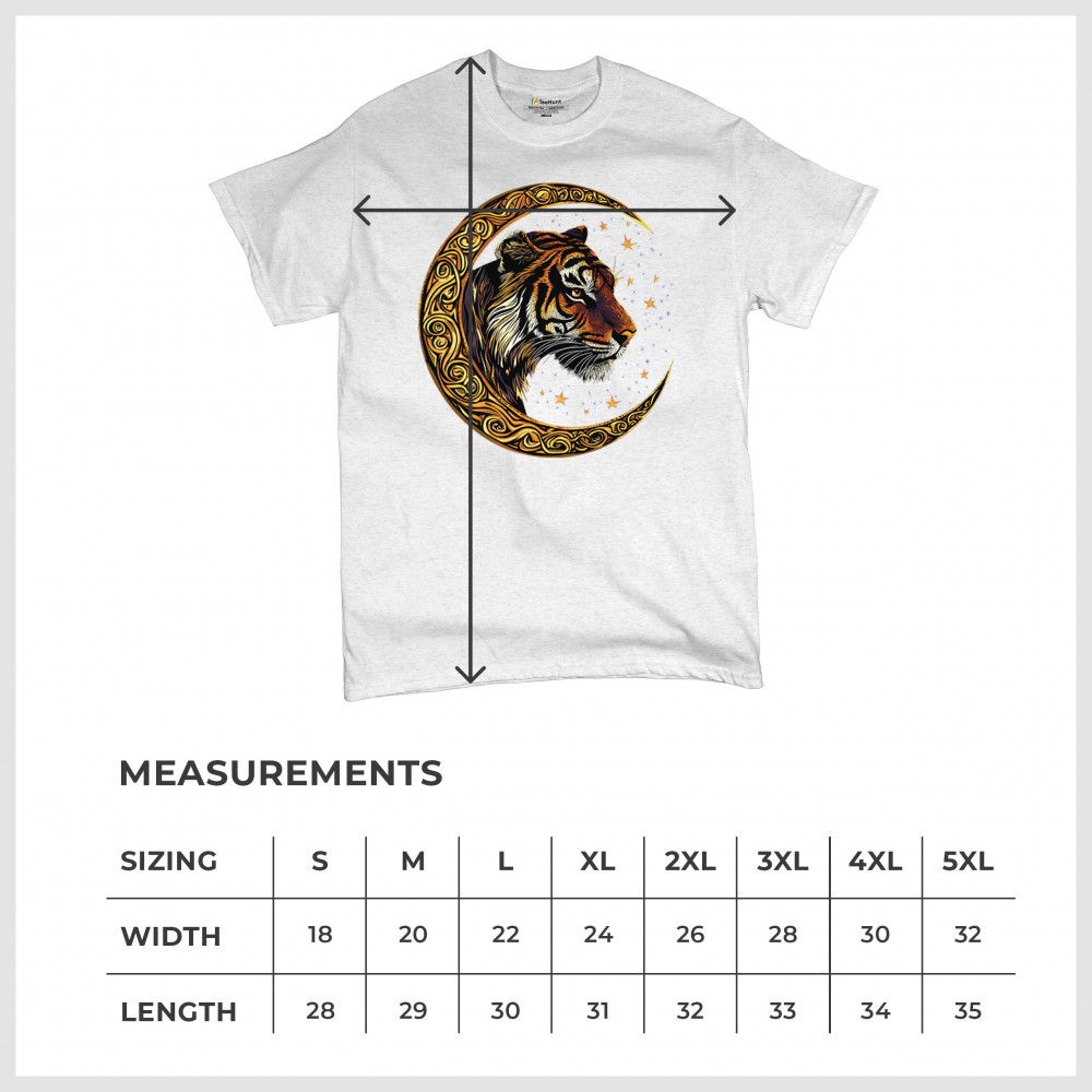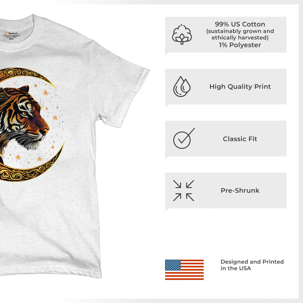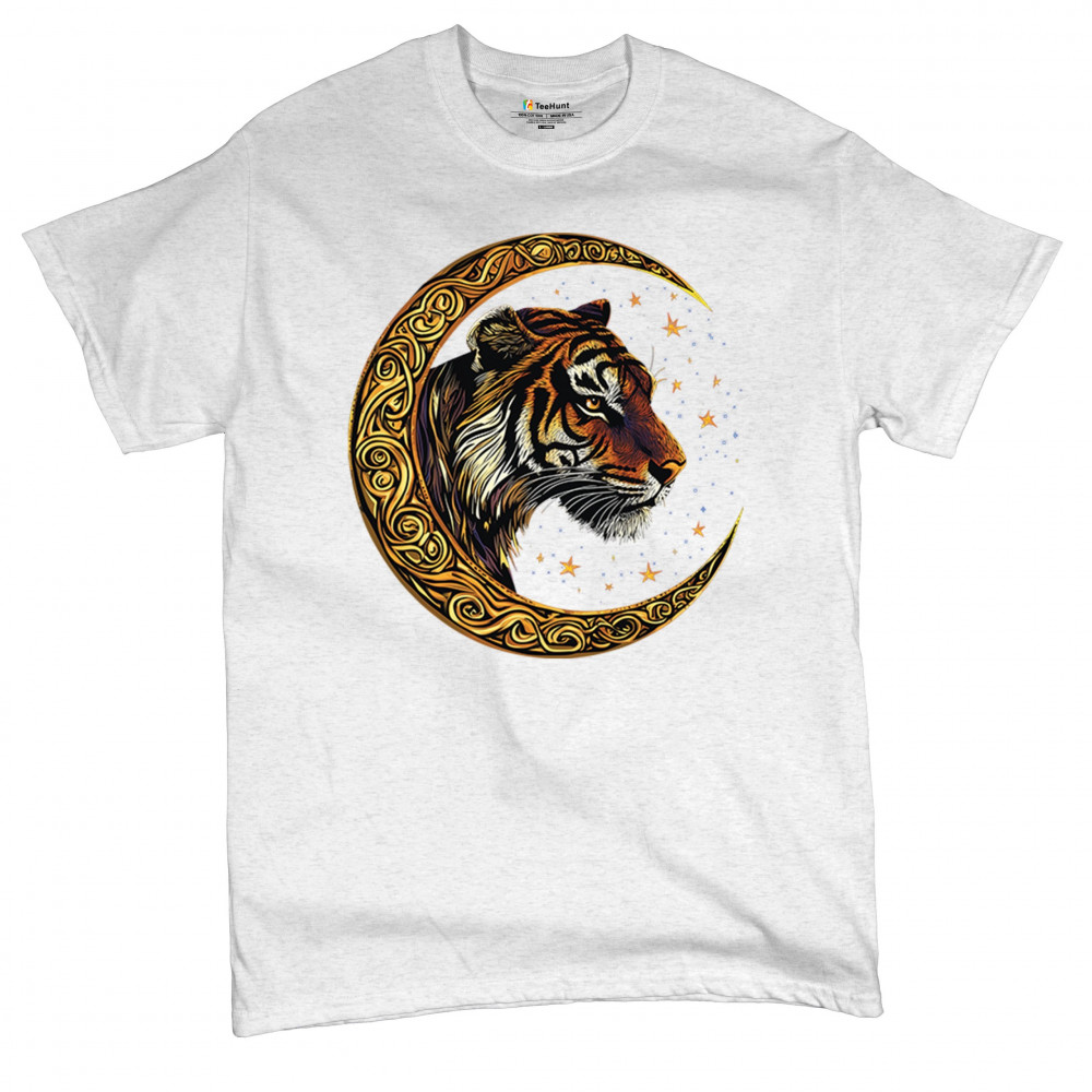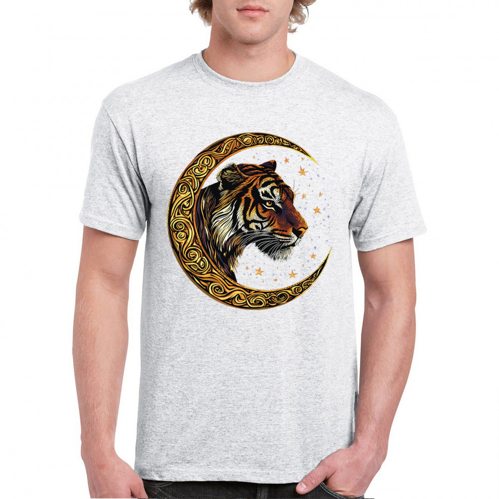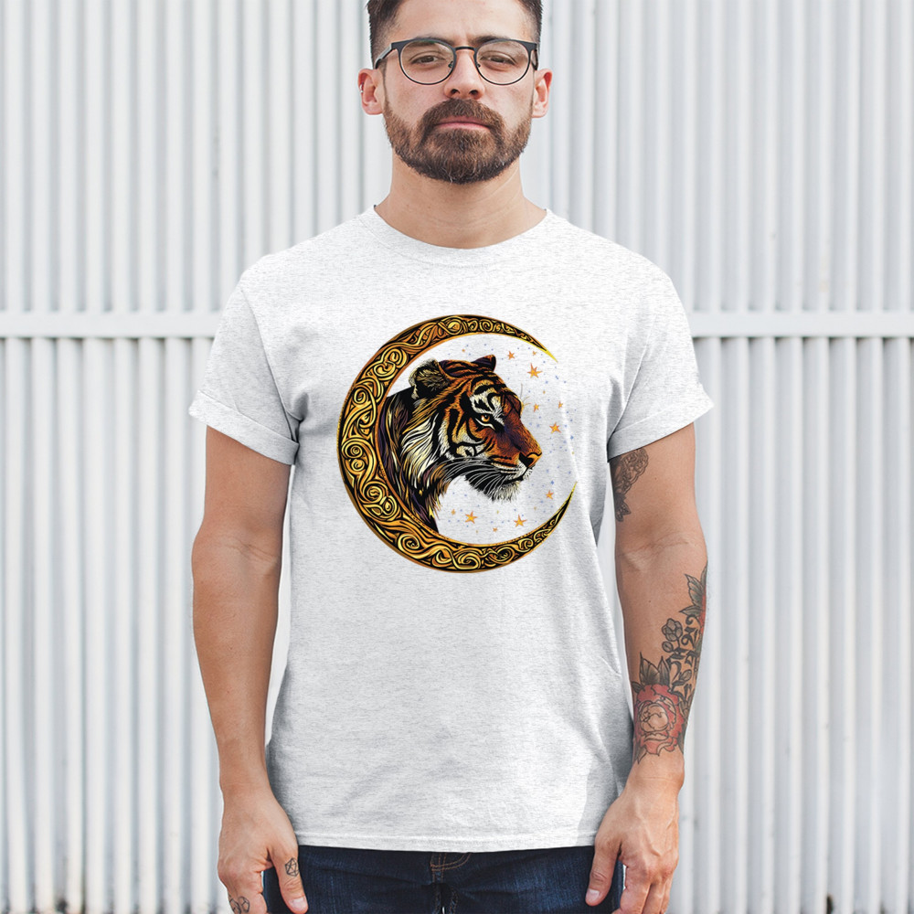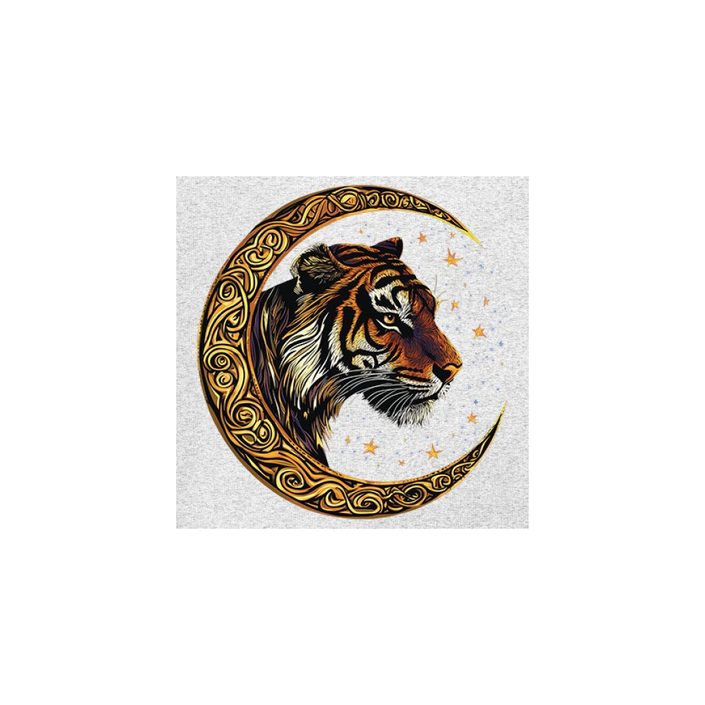 Bold tiger design in Celtic moon with cosmic sky. Symbol of strength, instinct, and jungle mysticism. Great for animal lovers and fantasy fans.