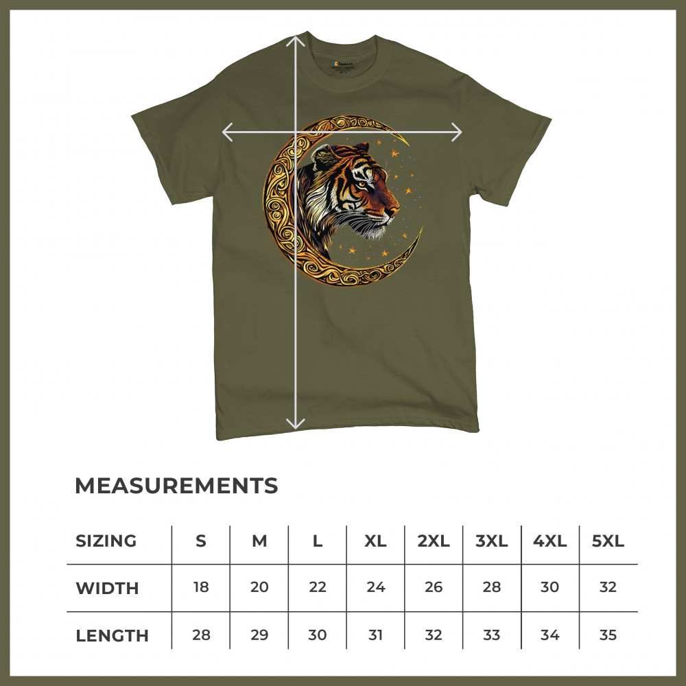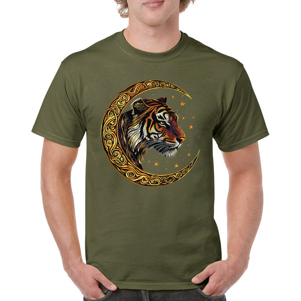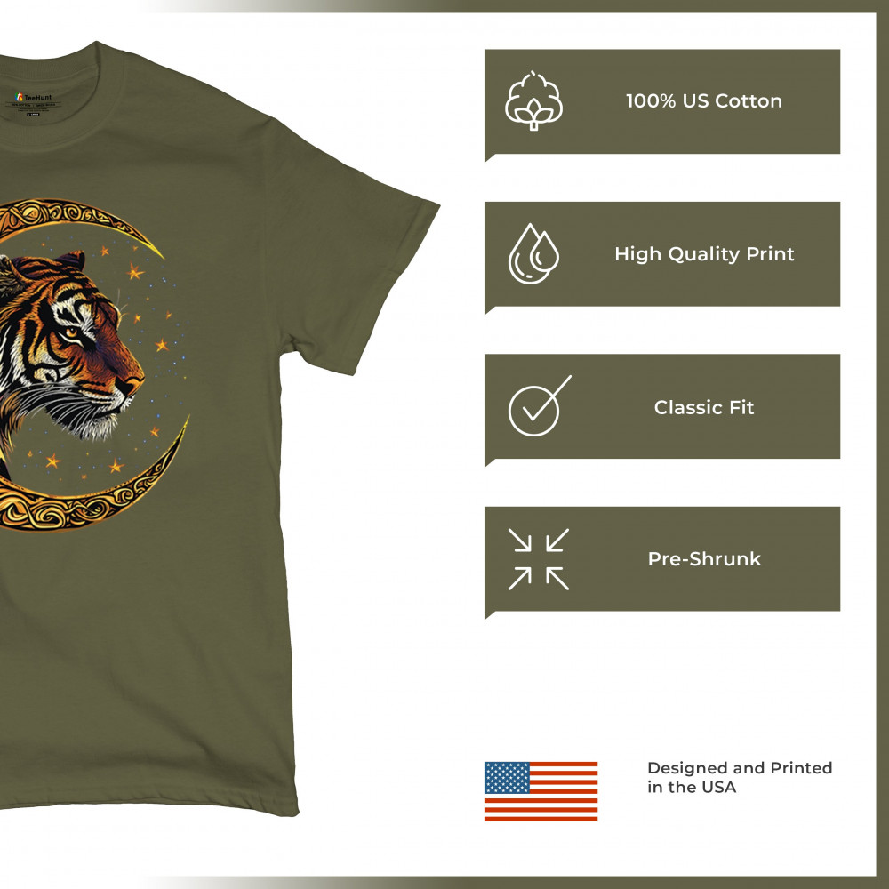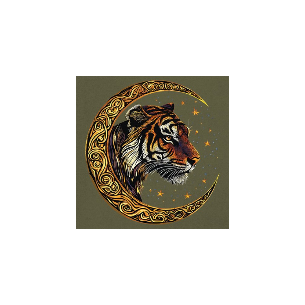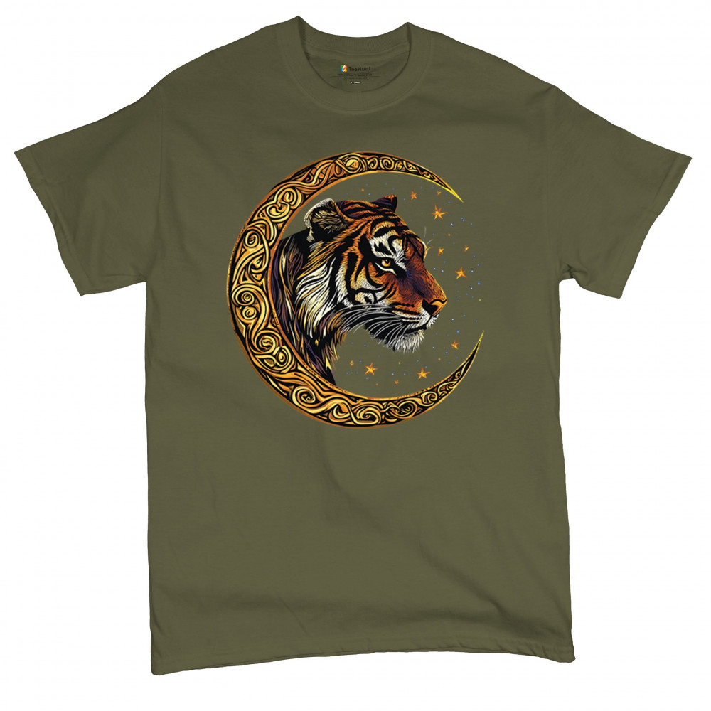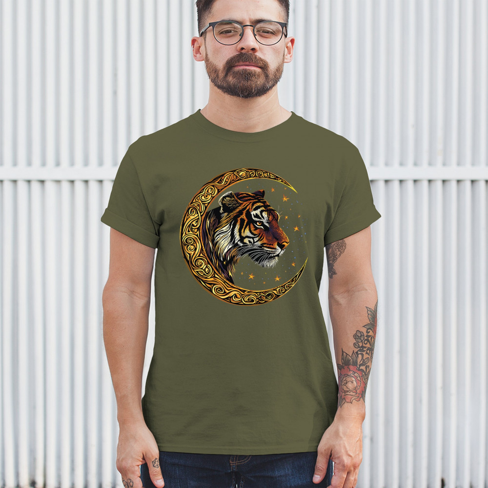 Bold tiger design in Celtic moon with cosmic sky. Symbol of strength, instinct, and jungle mysticism. Great for animal lovers and fantasy fans.