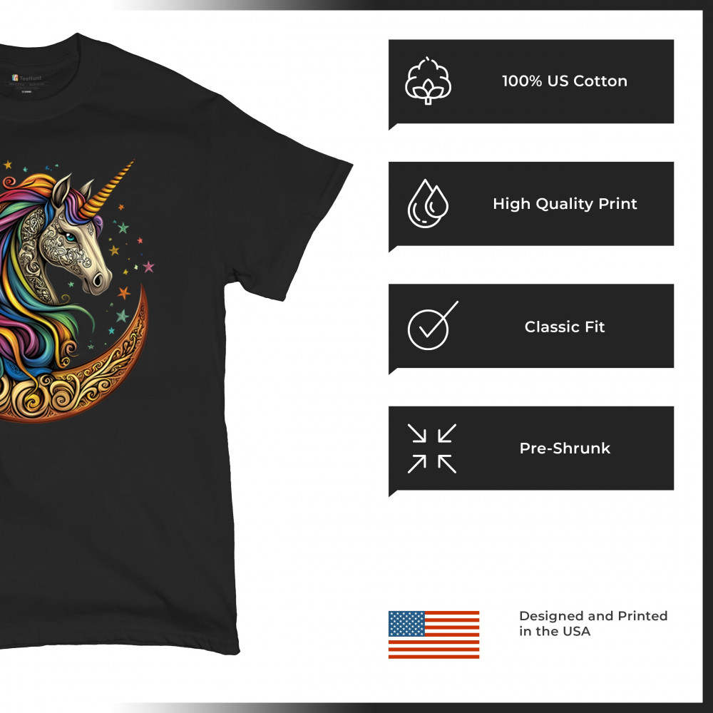 Rainbow-maned unicorn in golden Celtic moon design—perfect for fantasy lovers, dreamers, and unicorn fans who believe in magic and spirit.