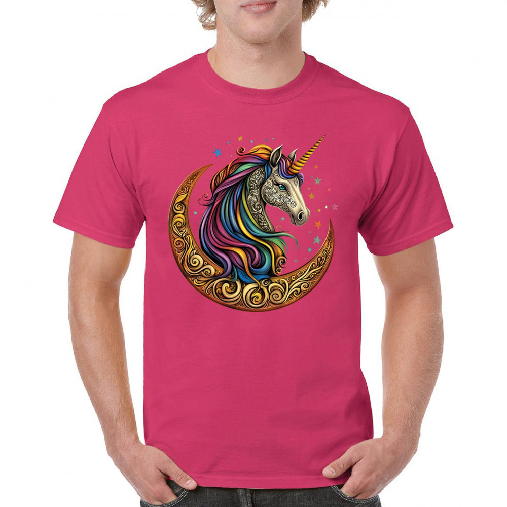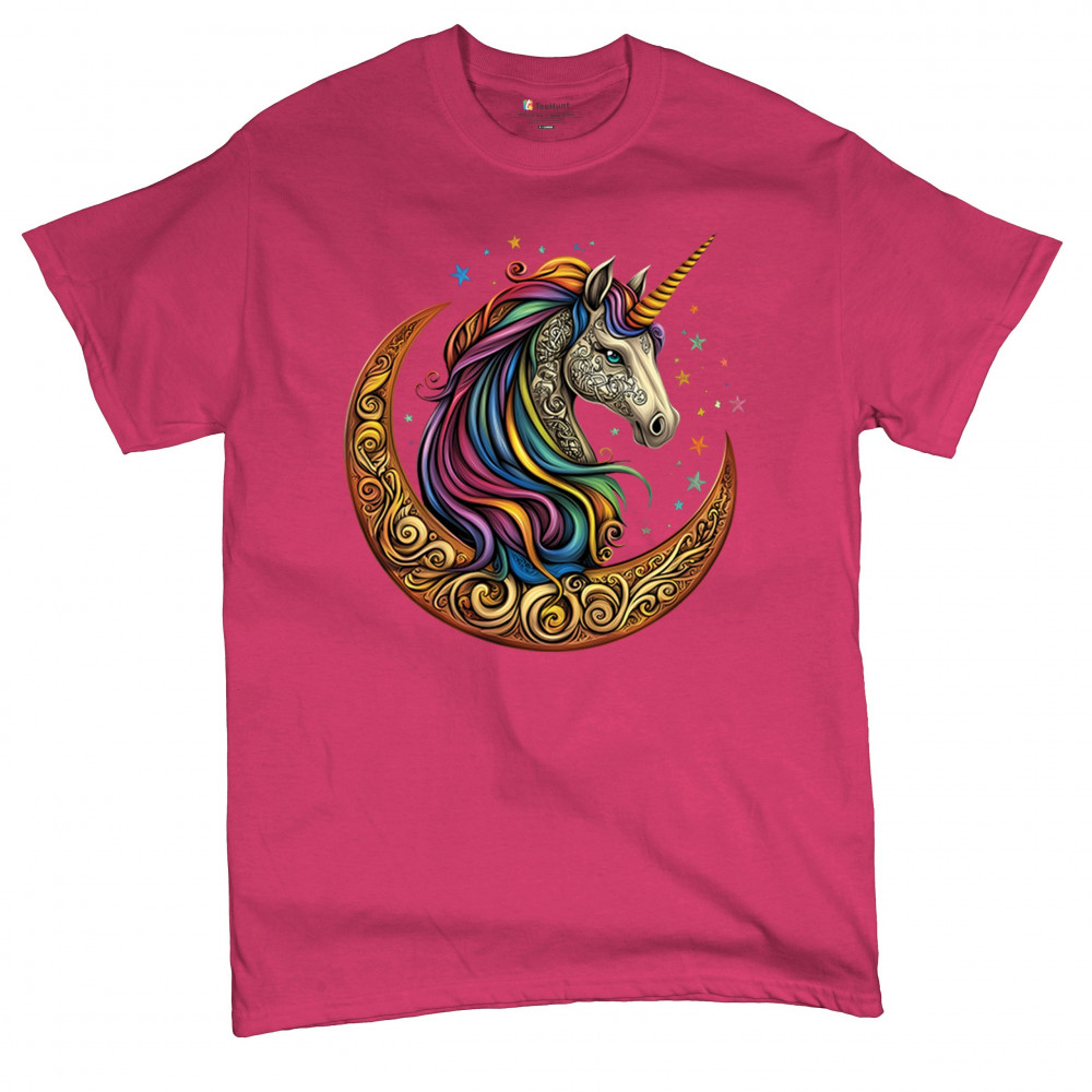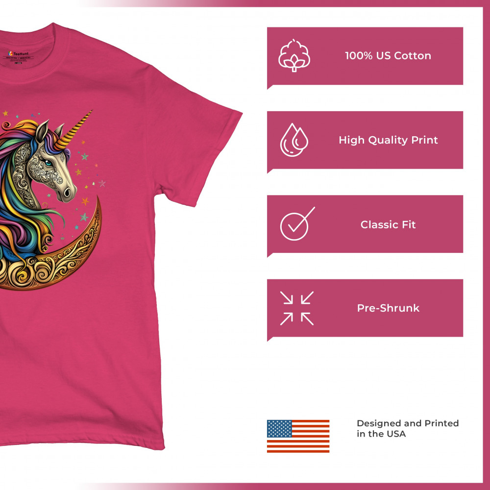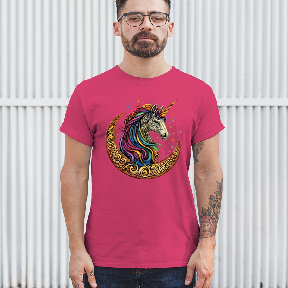 Rainbow-maned unicorn in golden Celtic moon design—perfect for fantasy lovers, dreamers, and unicorn fans who believe in magic and spirit.