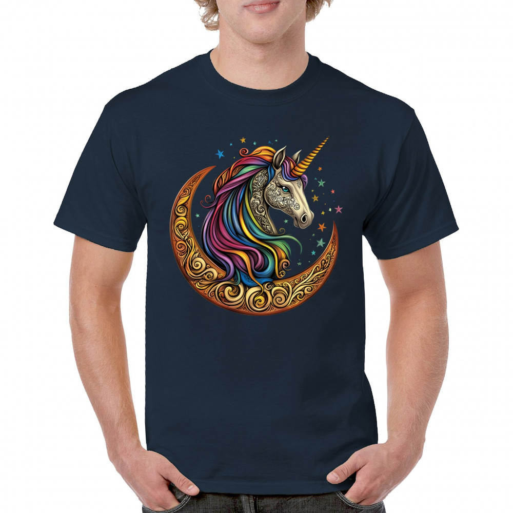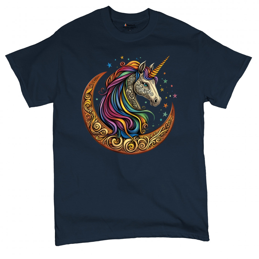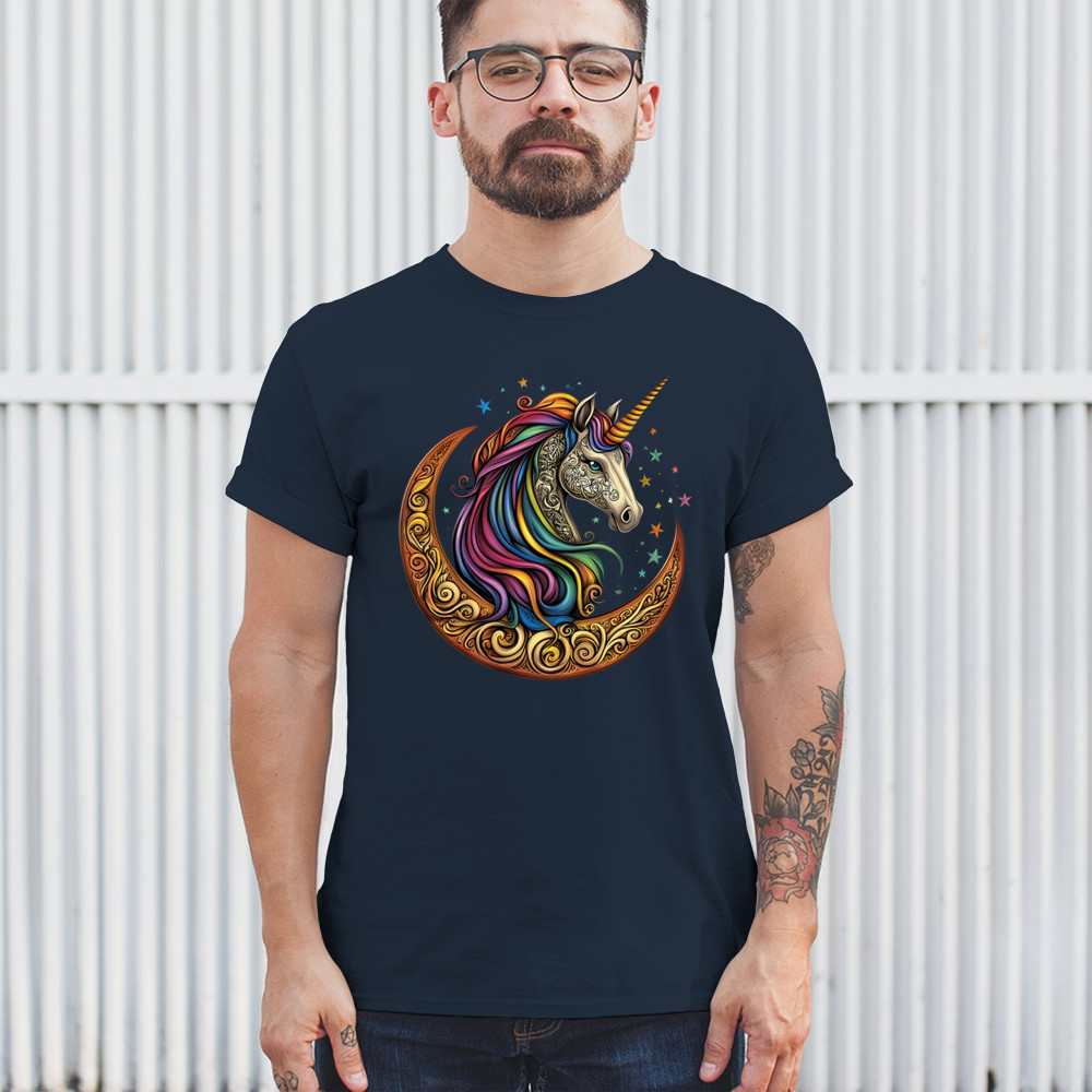 Rainbow-maned unicorn in golden Celtic moon design—perfect for fantasy lovers, dreamers, and unicorn fans who believe in magic and spirit.